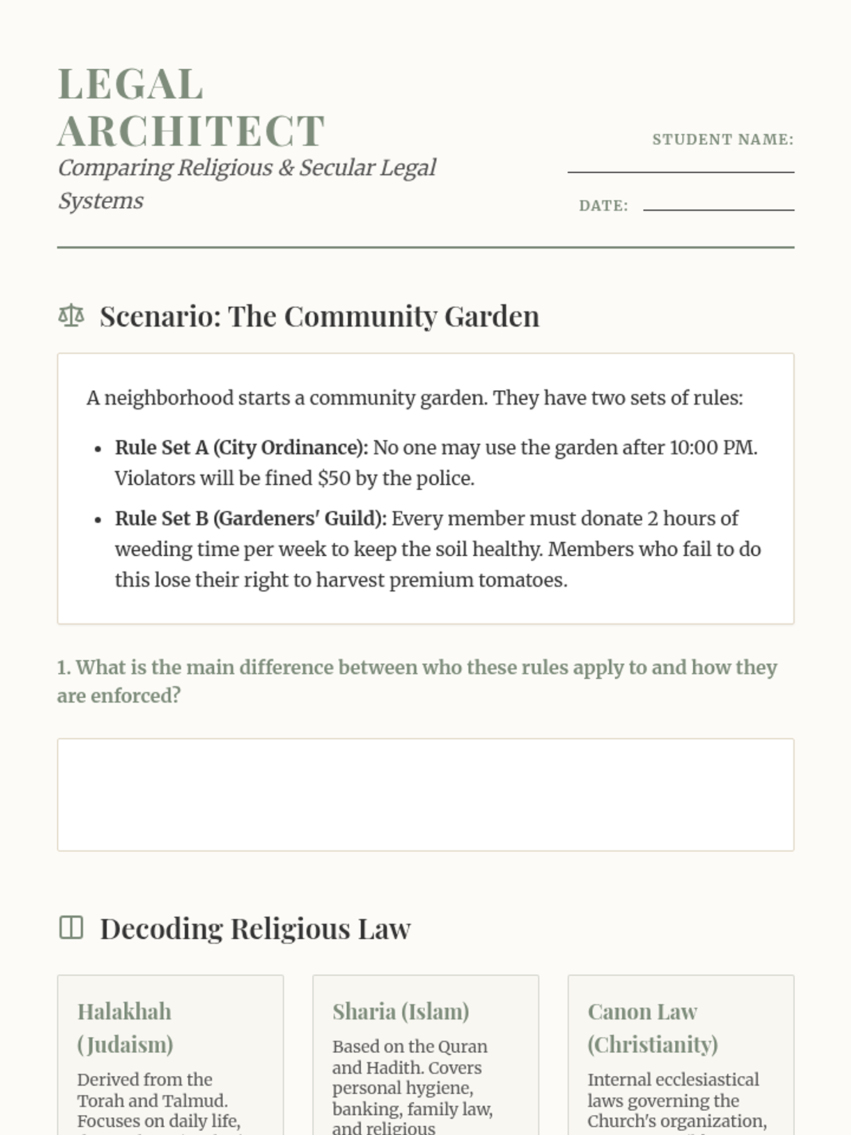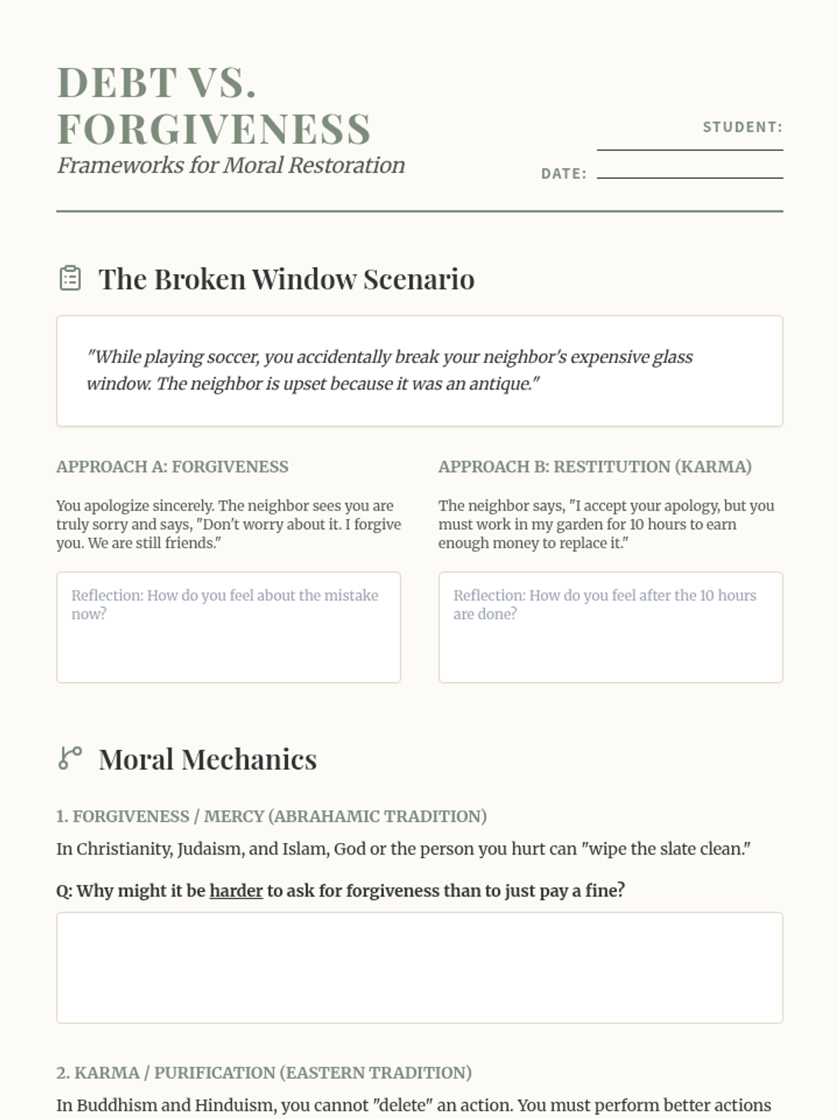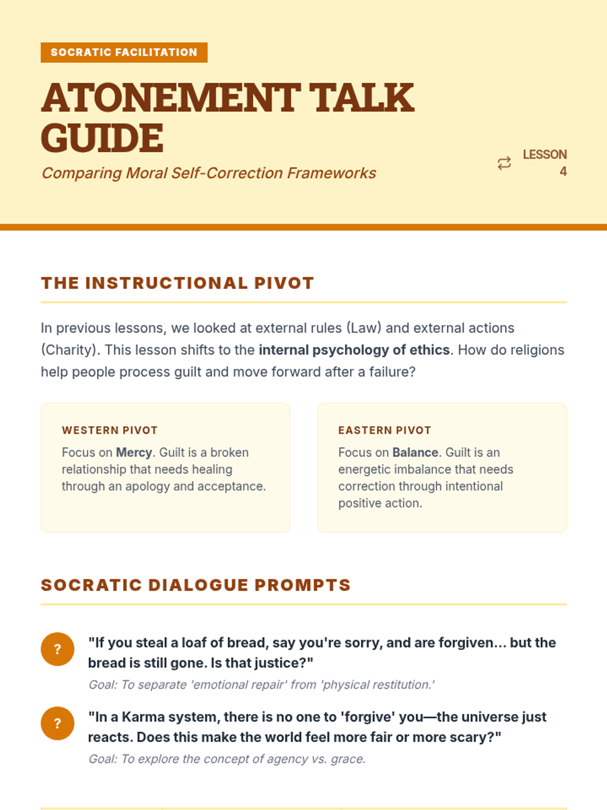 This sequence explores the ethical frameworks and moral systems of major world religions. Students compare religious laws, charitable mandates, non-violence principles, and concepts of atonement to understand how faith influences decision-making and social justice.