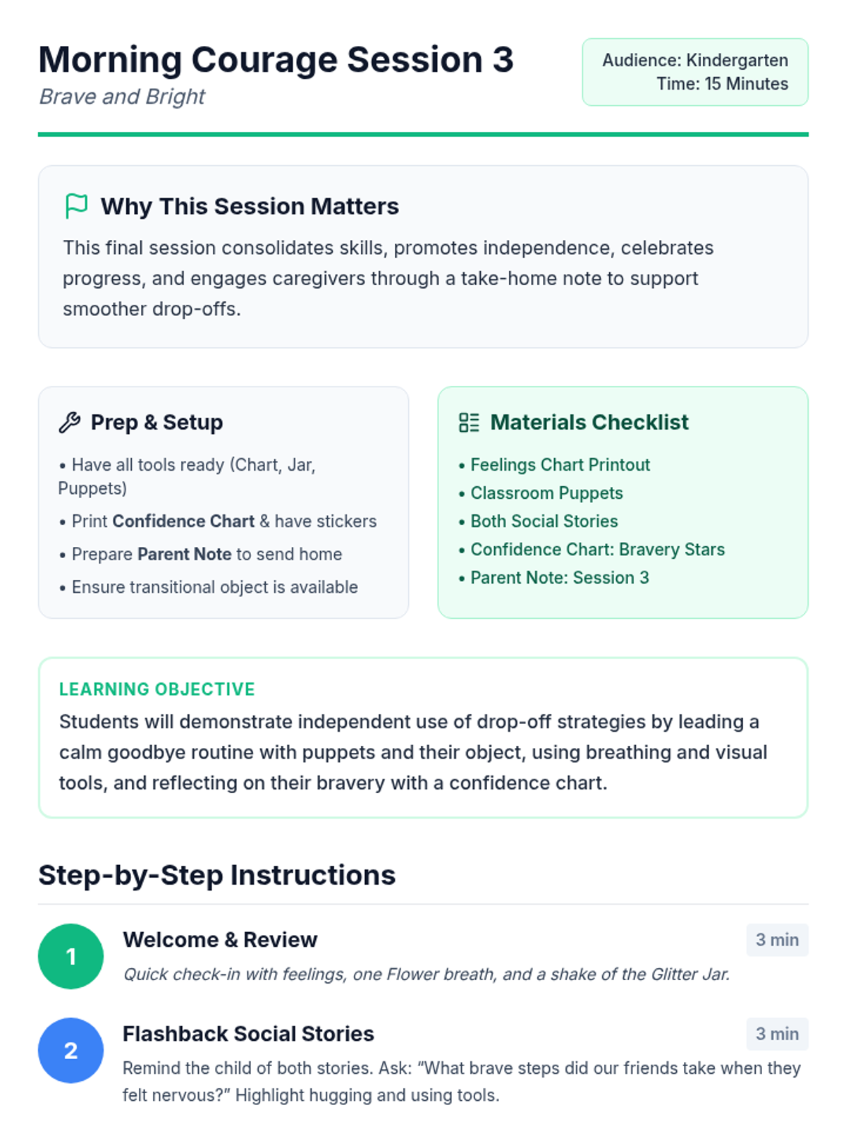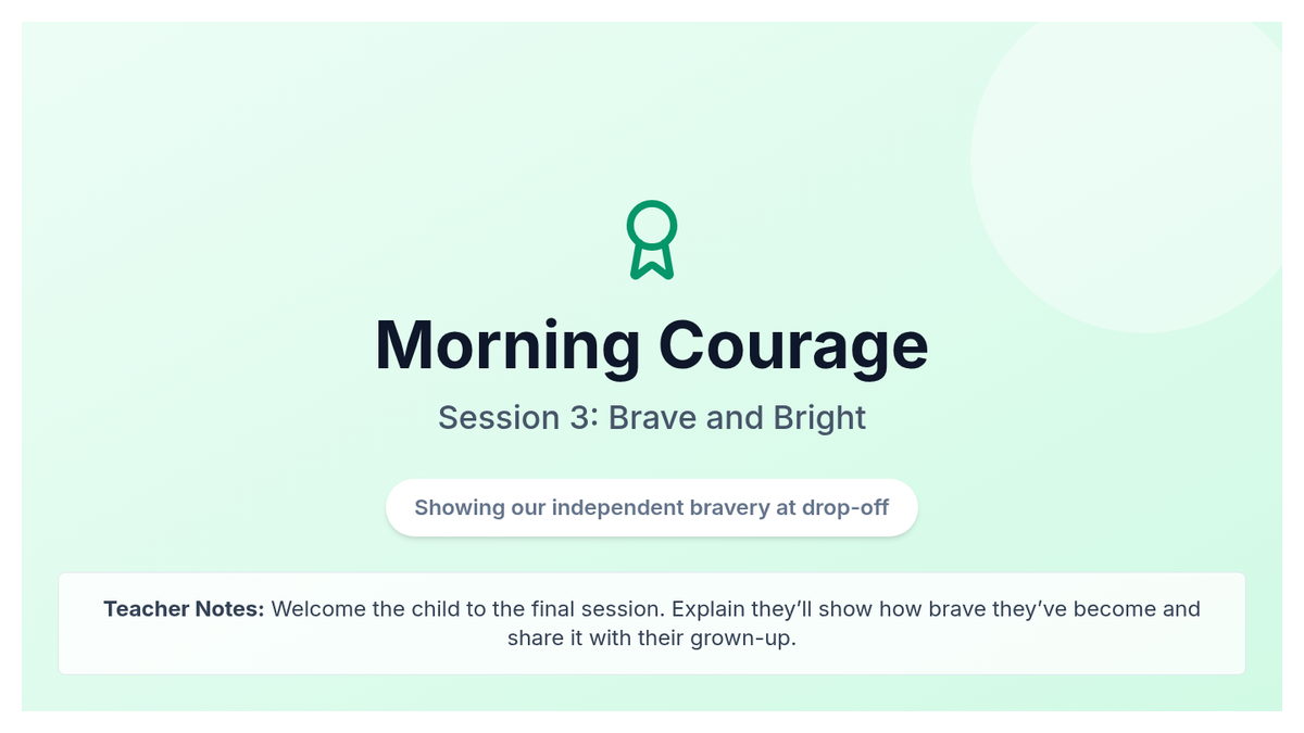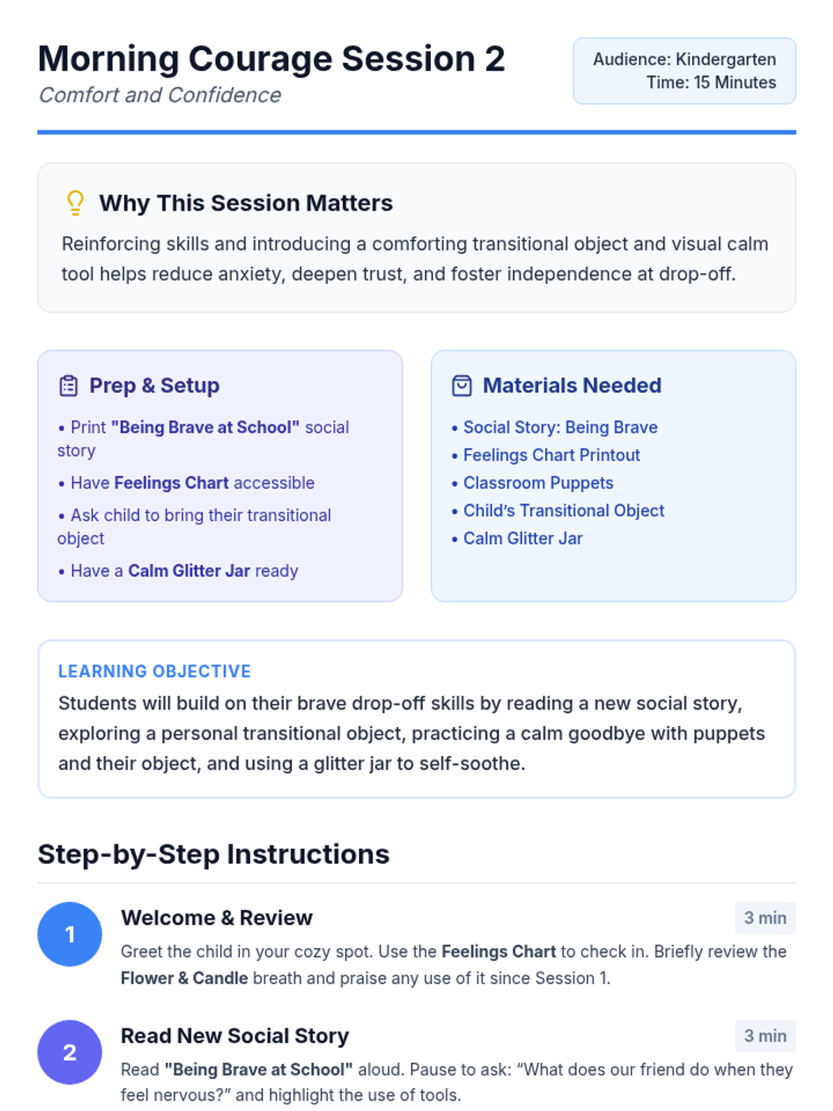 A 3-session individual support program (Tier 3) designed to help kindergarten students build coping skills and confidence for smoother morning drop-offs through social stories, role-play, and calming techniques.