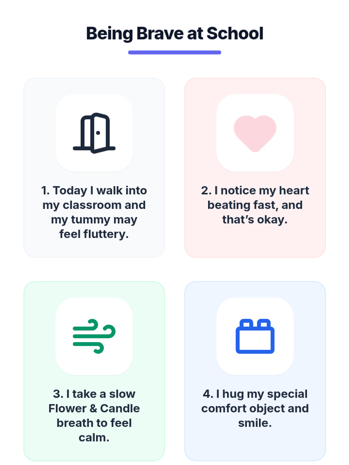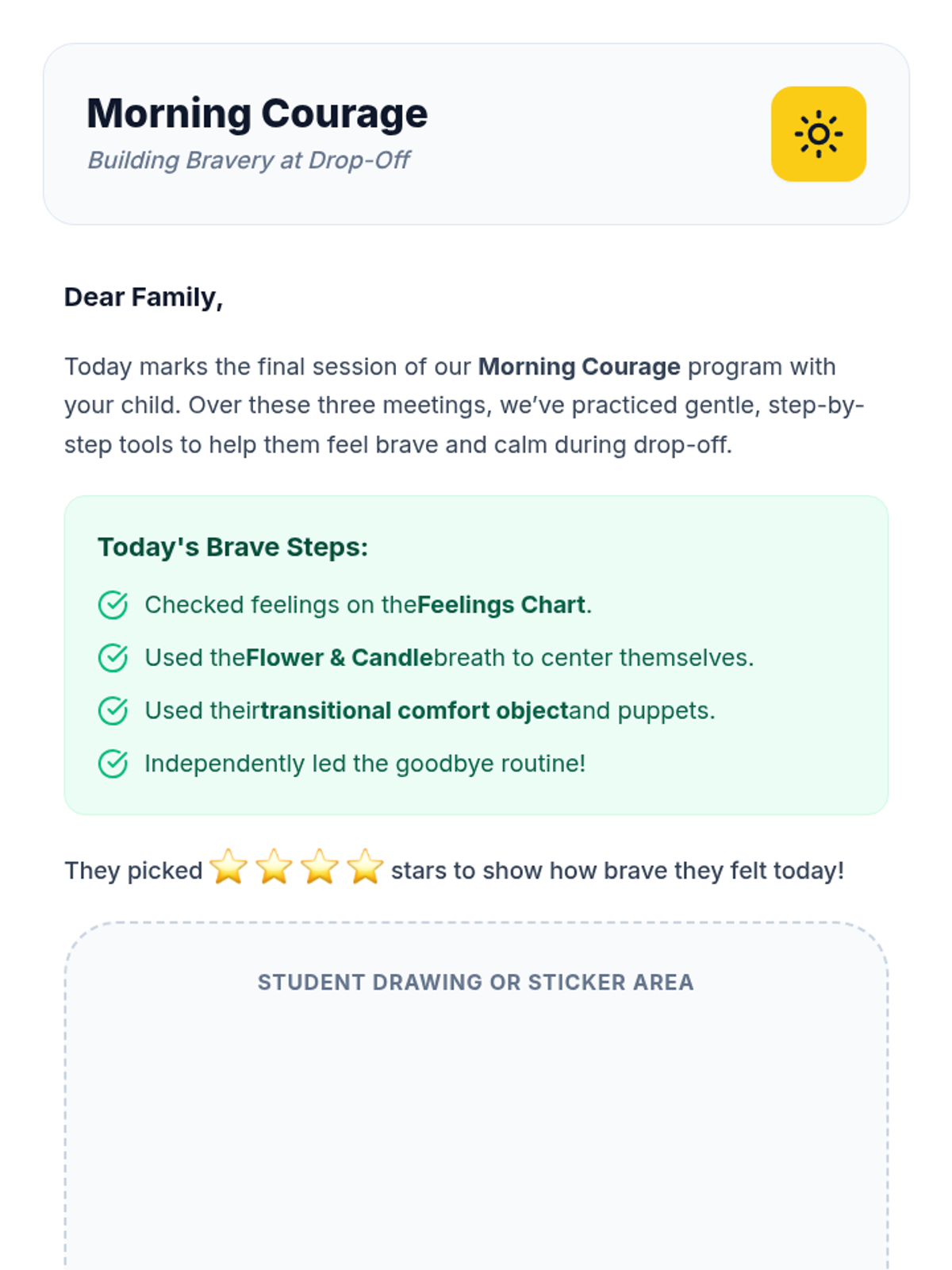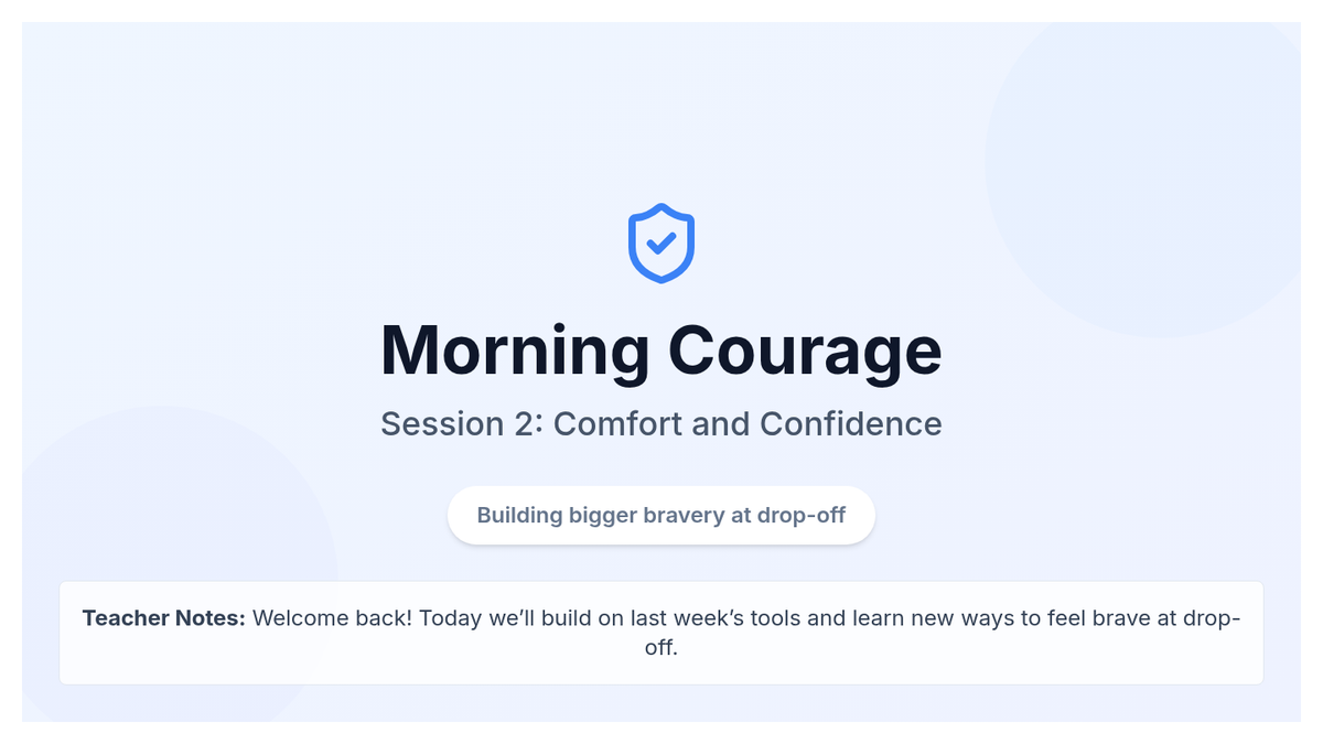 A 3-session individual support program (Tier 3) designed to help kindergarten students build coping skills and confidence for smoother morning drop-offs through social stories, role-play, and calming techniques.