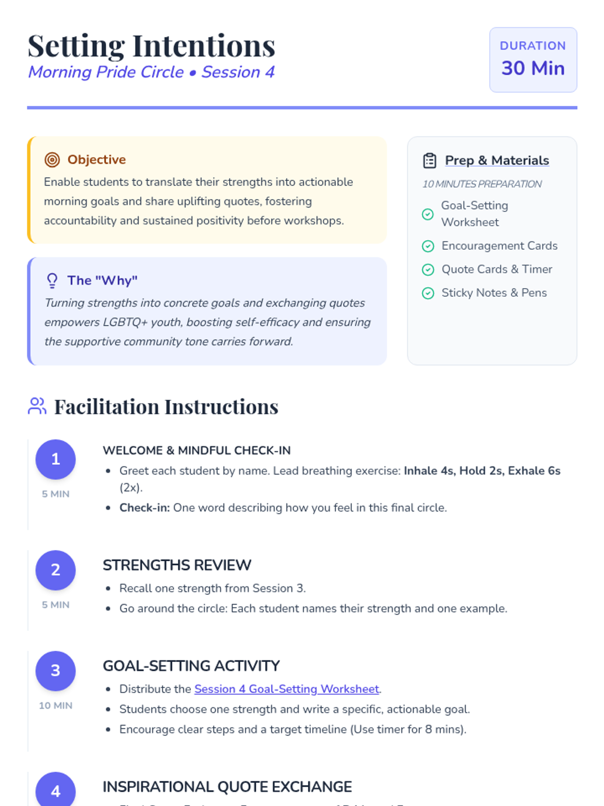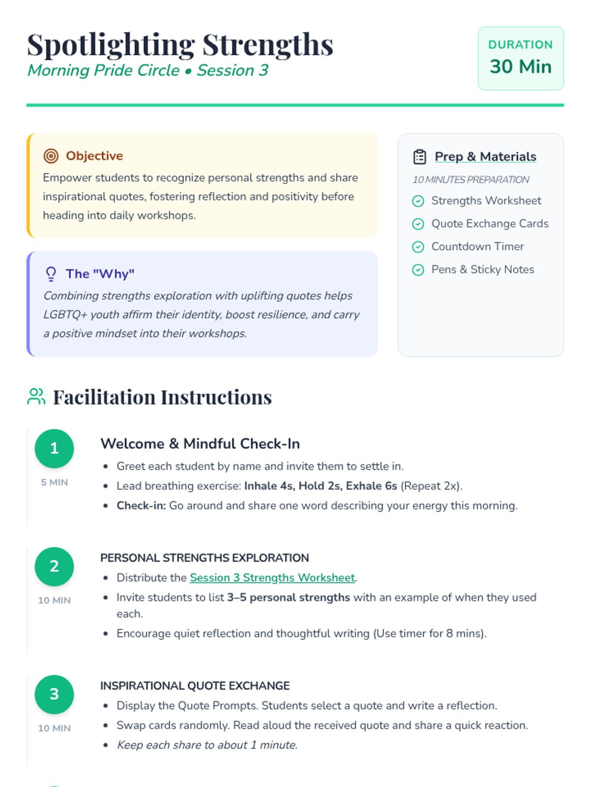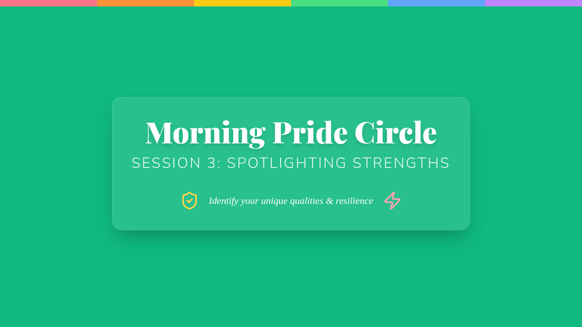 A series of four 30-minute morning gatherings for LGBTQ+ youth focused on building community, self-affirmation, and positive momentum through shared reflections, strengths exploration, and peer support.