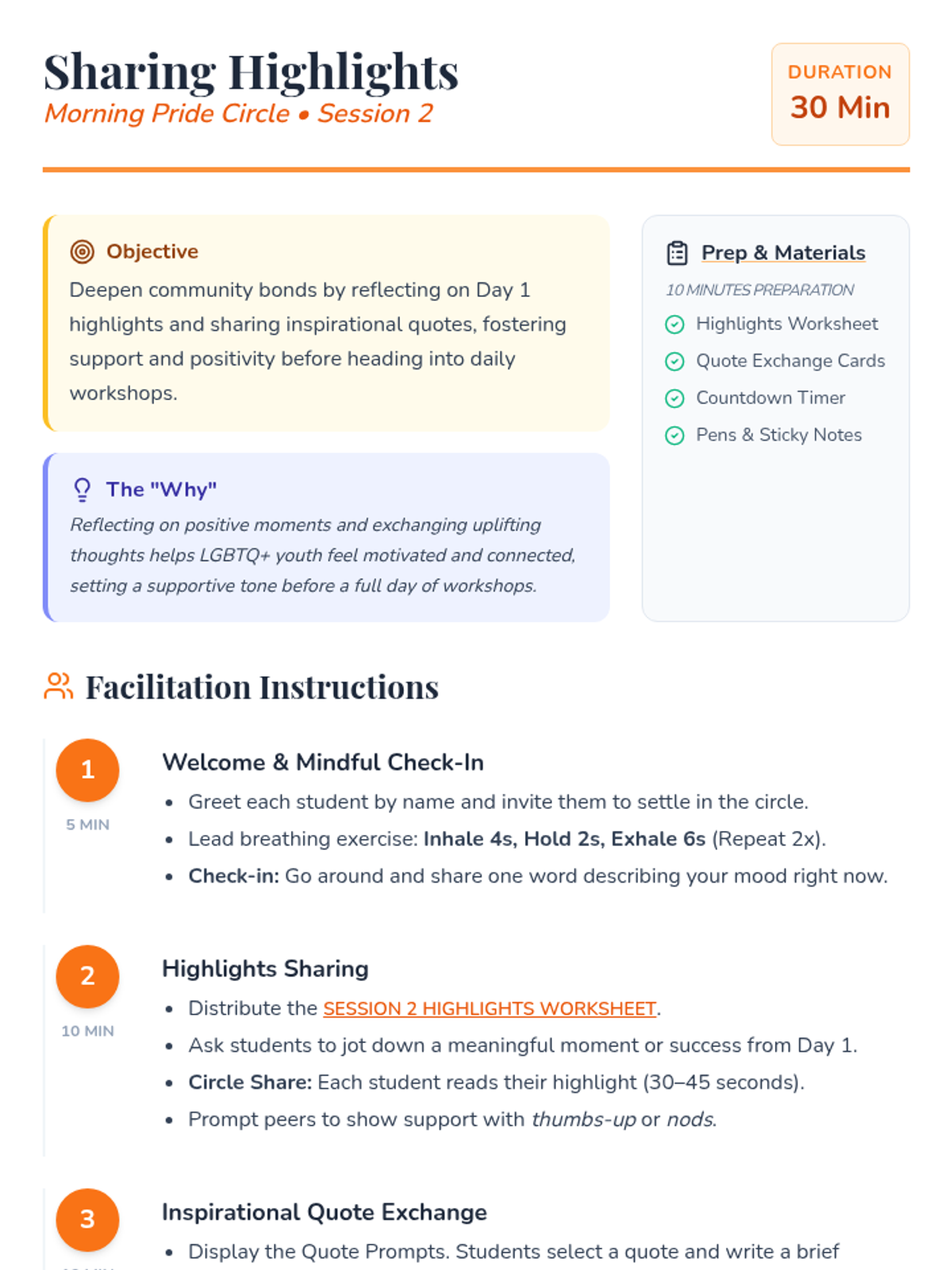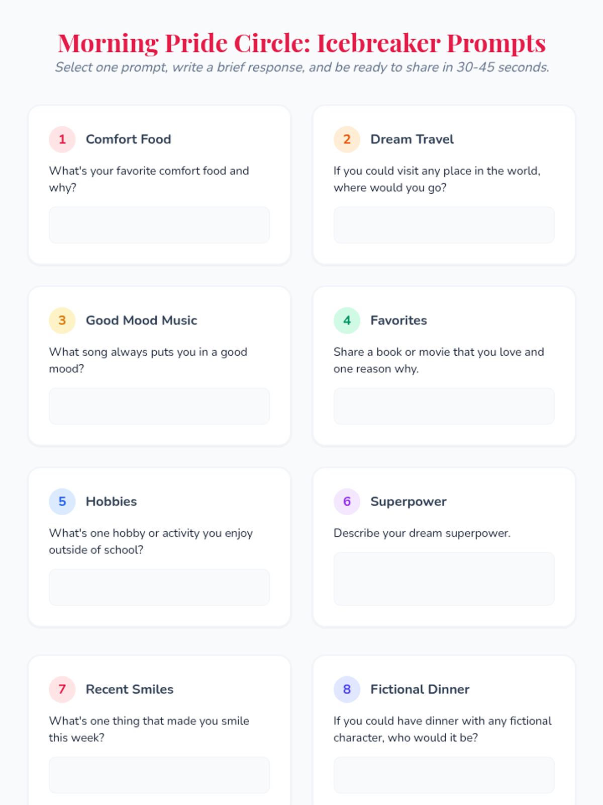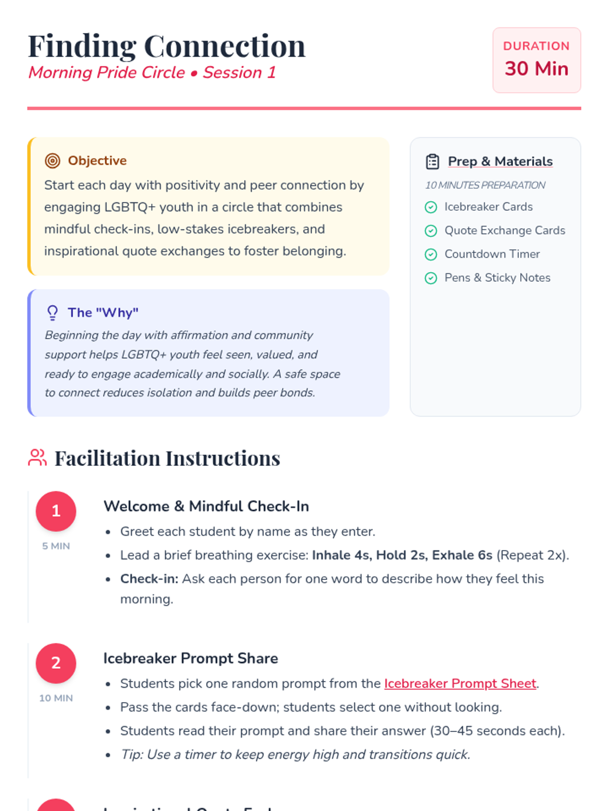 A series of four 30-minute morning gatherings for LGBTQ+ youth focused on building community, self-affirmation, and positive momentum through shared reflections, strengths exploration, and peer support.