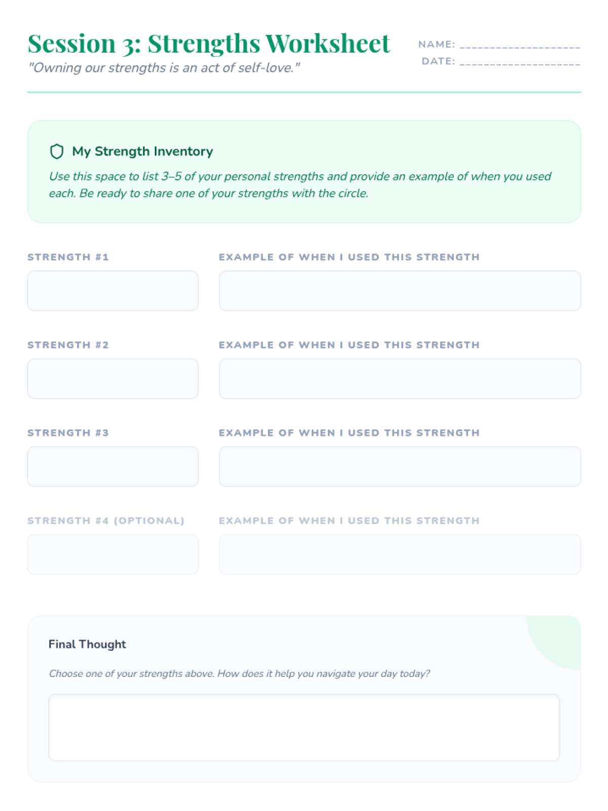 A 4-session small group counseling program for high school girls focused on identifying anxiety triggers, practicing mindfulness, and developing a personalized toolkit of coping strategies. The sequence emphasizes peer support, empowerment, and practical application within the school environment.