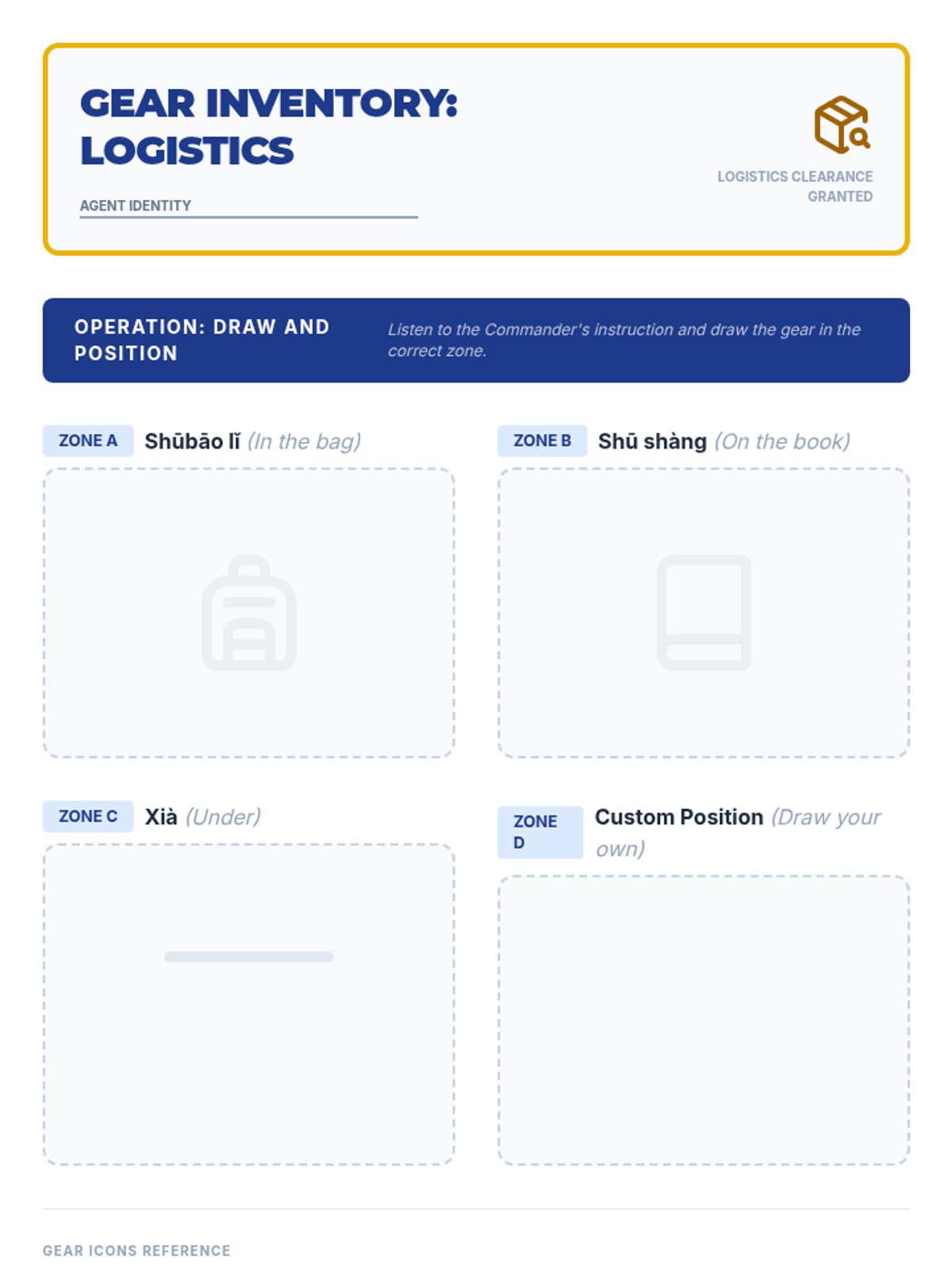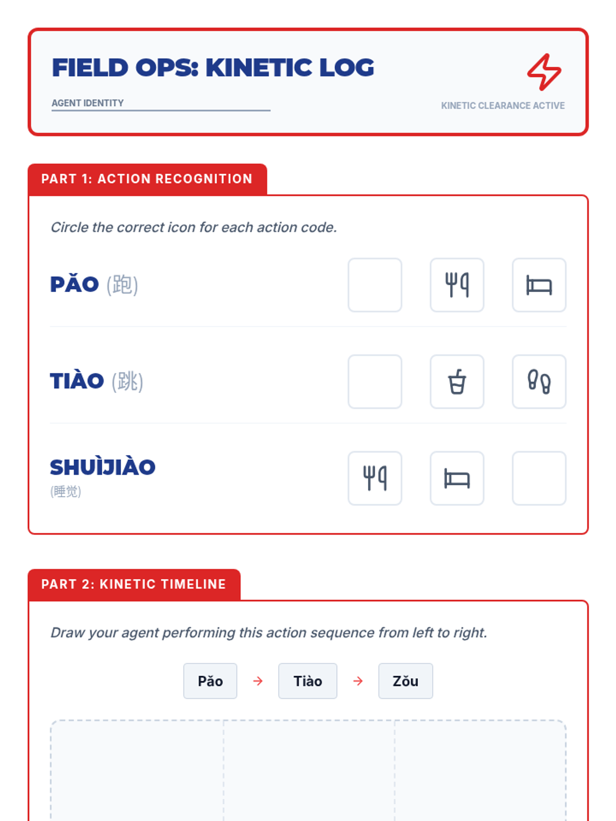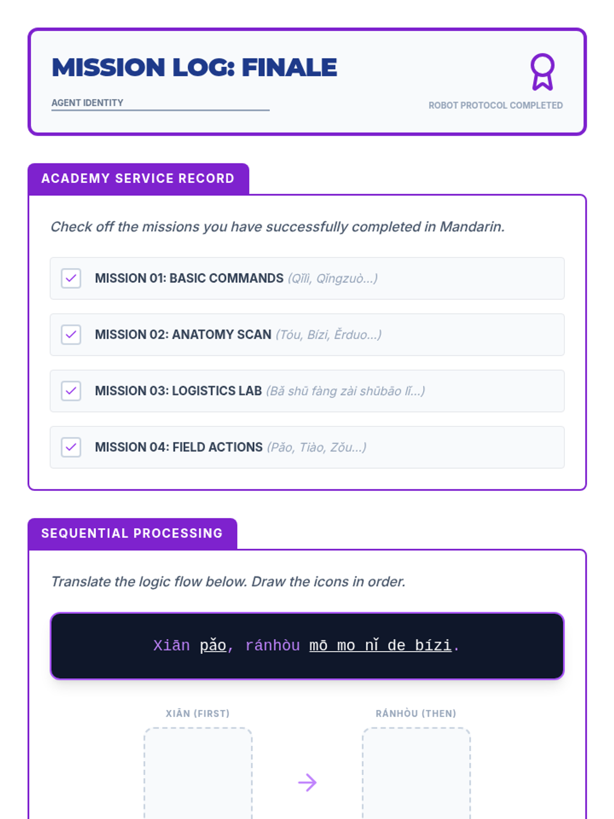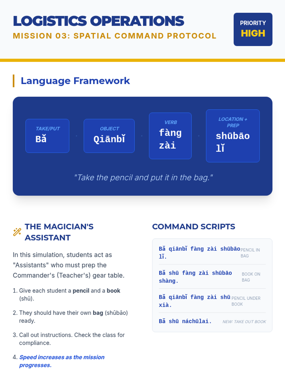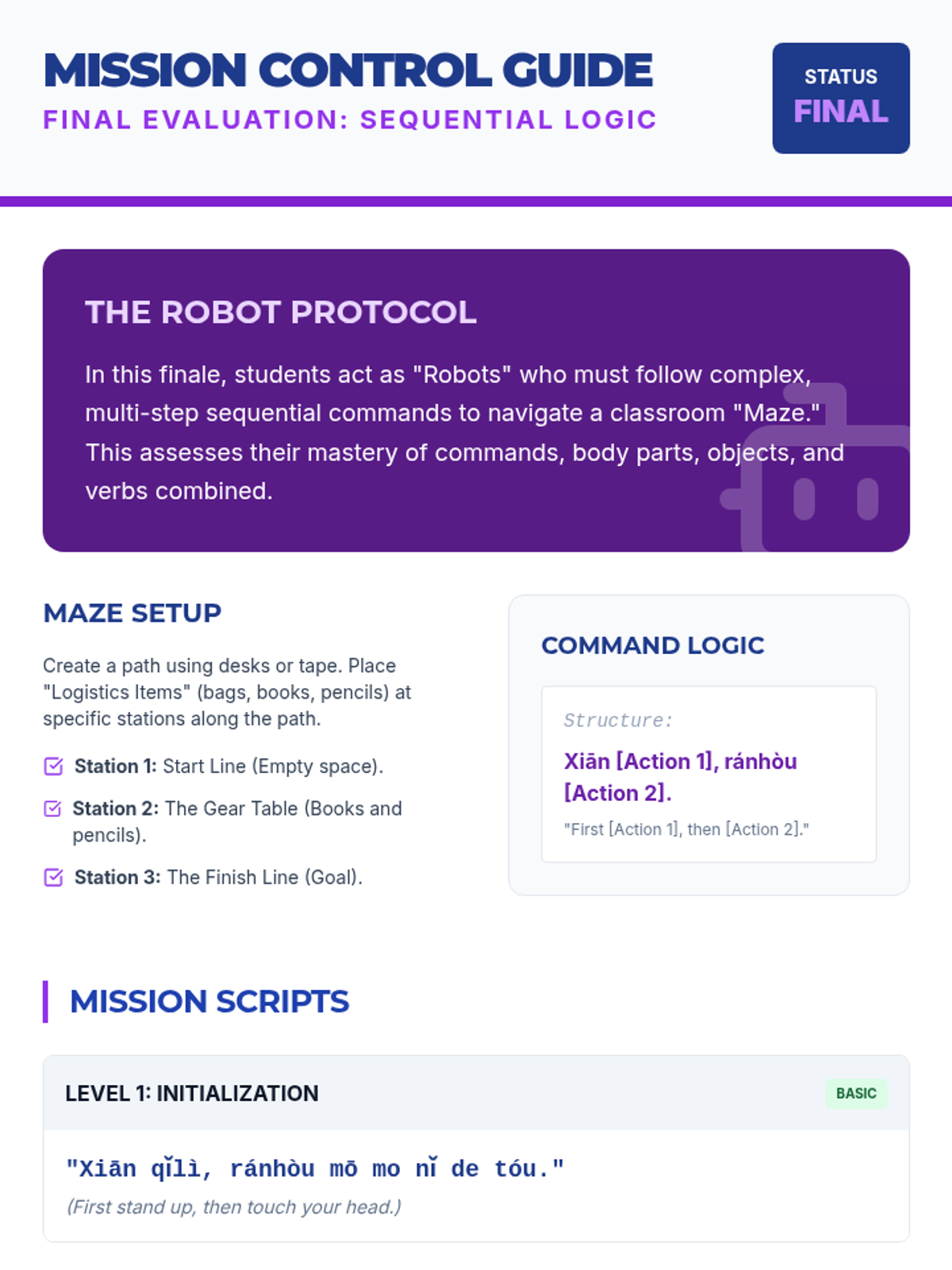 A 5th-grade Mandarin Chinese listening sequence focusing on classroom instructions, routines, and physical actions through Total Physical Response (TPR). Students build direct meaning-sound connections by responding to commands, identifying body parts, and manipulating objects in an immersive 'Agent Academy' setting.