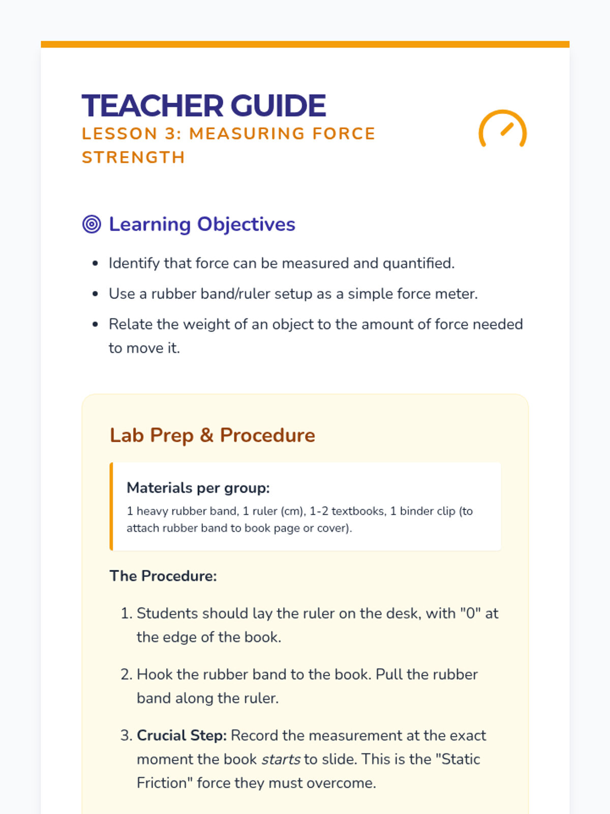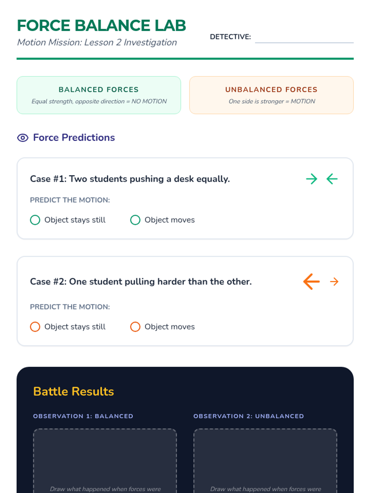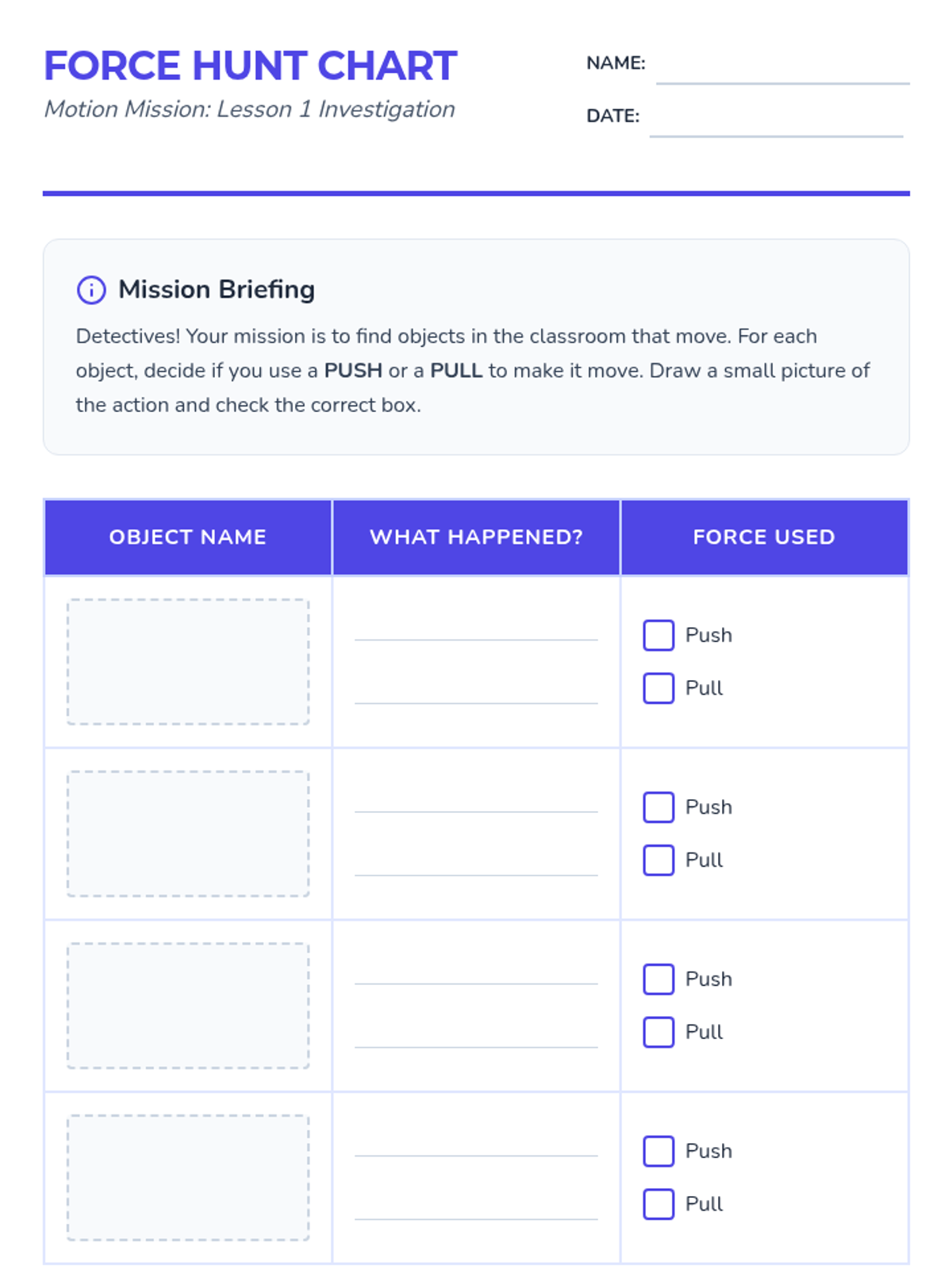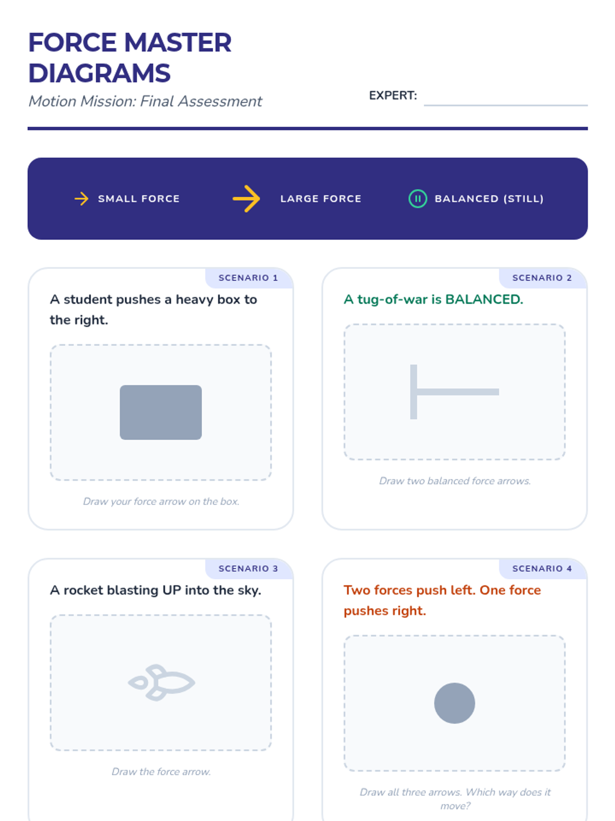 A comprehensive 5-lesson sequence for 3rd-grade students exploring the physics of force and motion. Students investigate pushes and pulls, distinguish between balanced and unbalanced forces, measure force strength, and learn to diagram forces using arrows to predict motion.