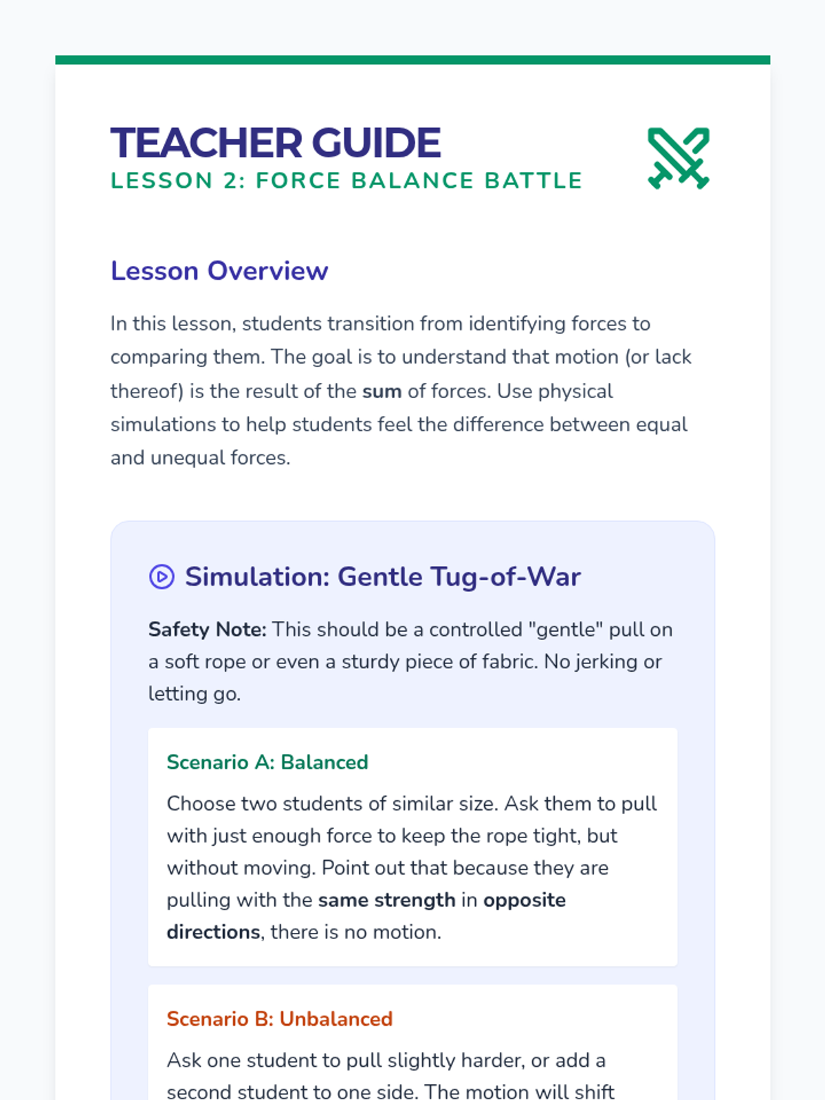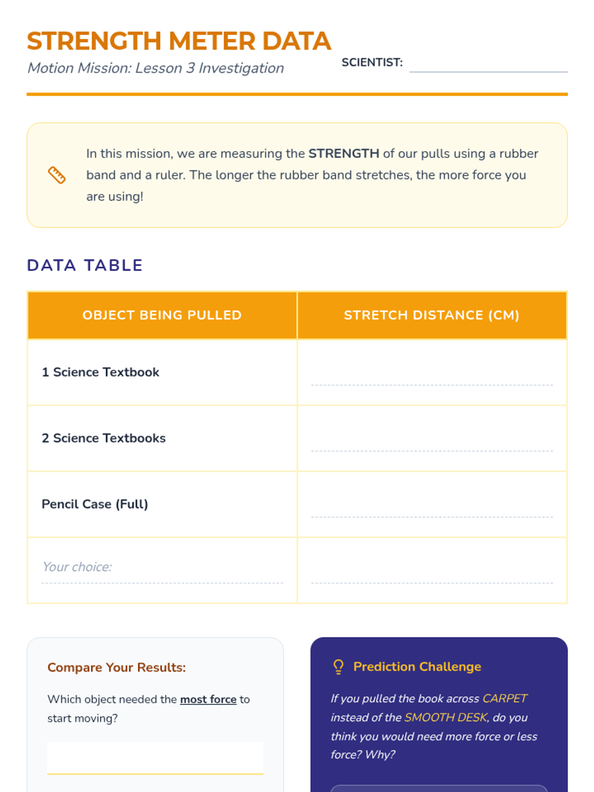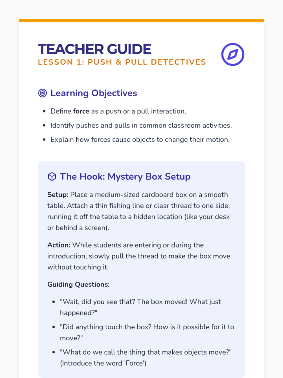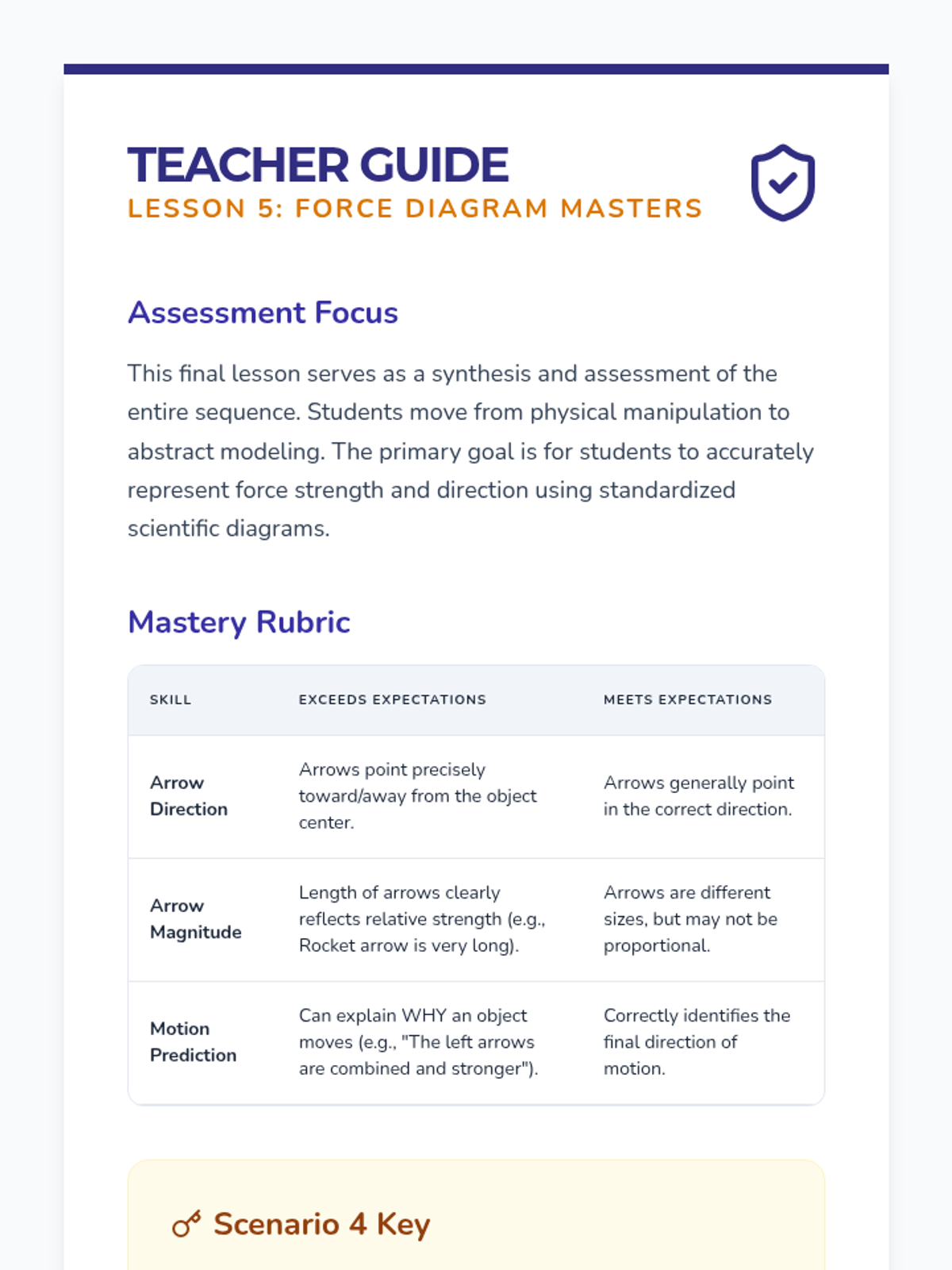 A comprehensive 5-lesson sequence for 3rd-grade students exploring the physics of force and motion. Students investigate pushes and pulls, distinguish between balanced and unbalanced forces, measure force strength, and learn to diagram forces using arrows to predict motion.