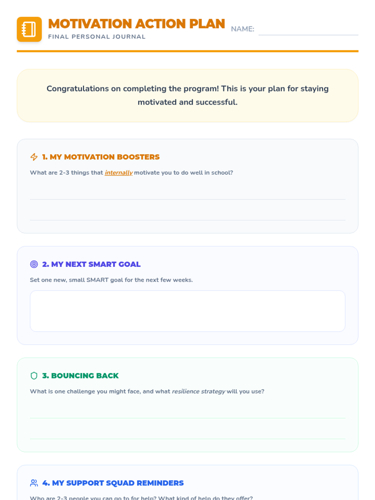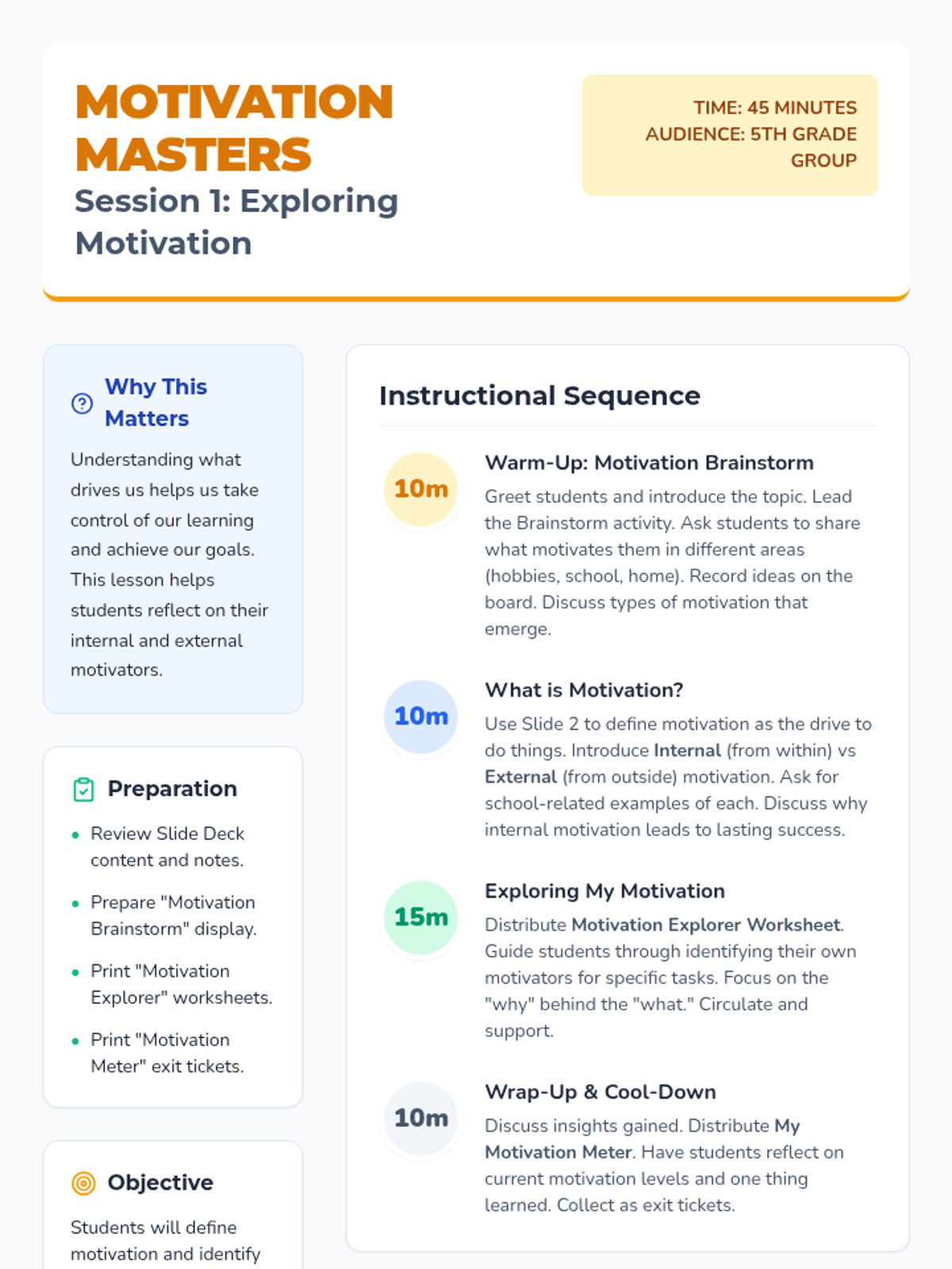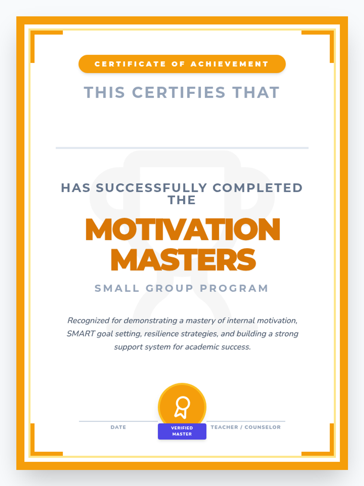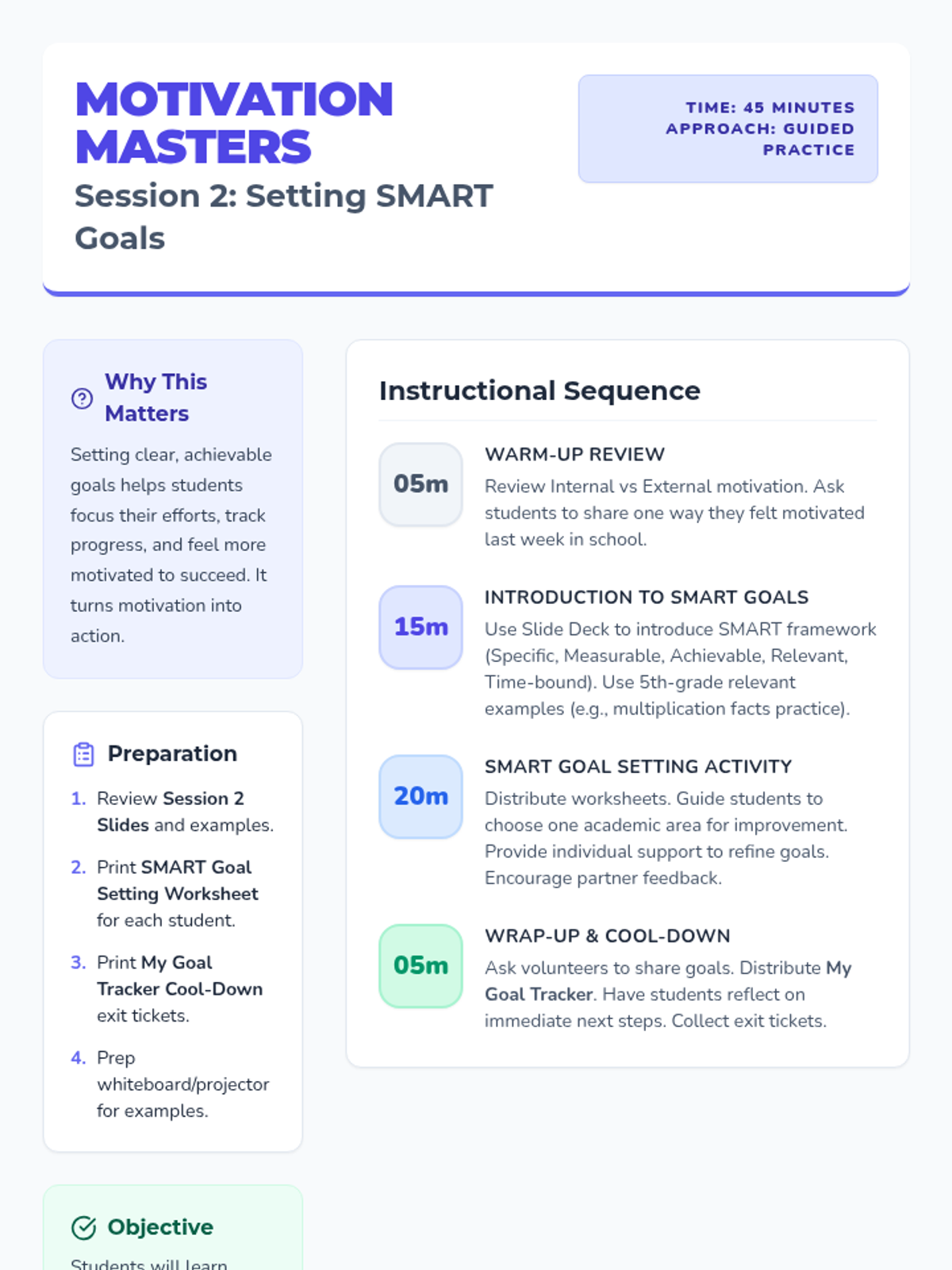 A comprehensive 5-session small group counseling program for 5th graders focused on internal/external motivation, SMART goal setting, resilience, and support systems. Based on the ASCA model to drive academic success and intrinsic drive.