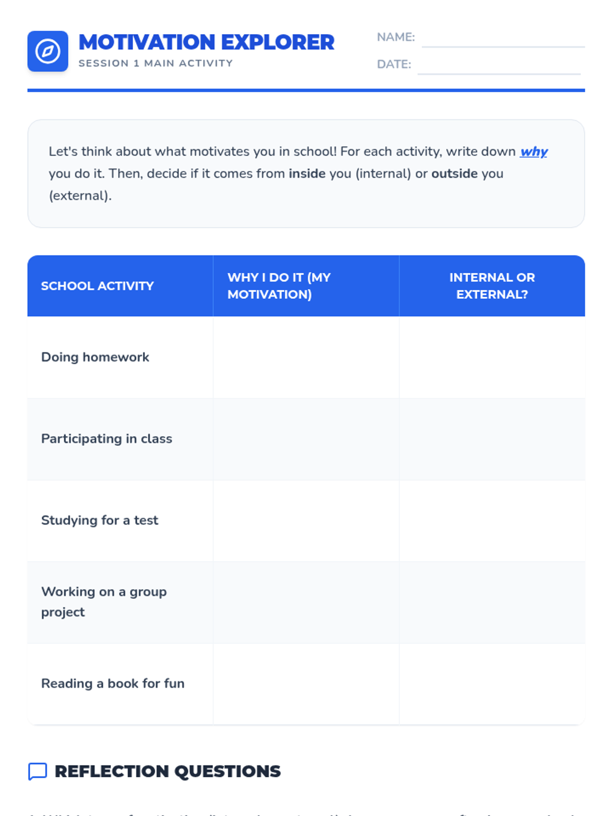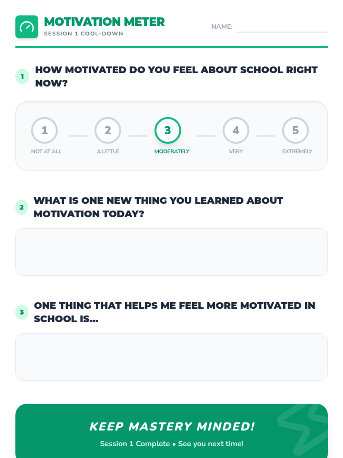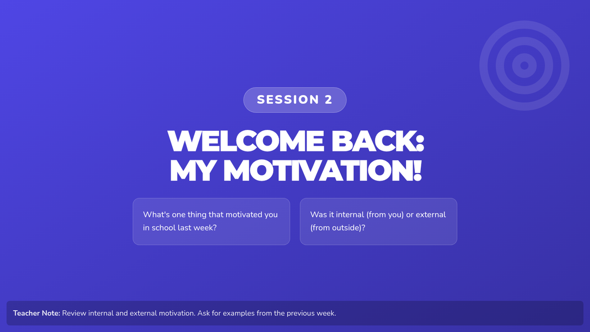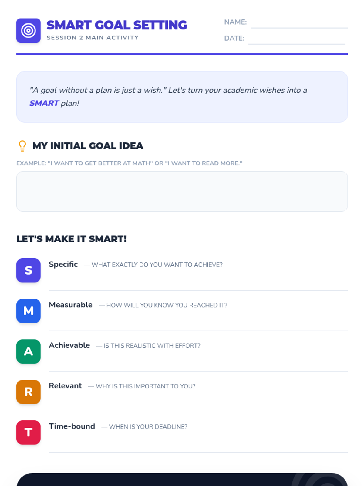 A comprehensive 5-session small group counseling program for 5th graders focused on internal/external motivation, SMART goal setting, resilience, and support systems. Based on the ASCA model to drive academic success and intrinsic drive.