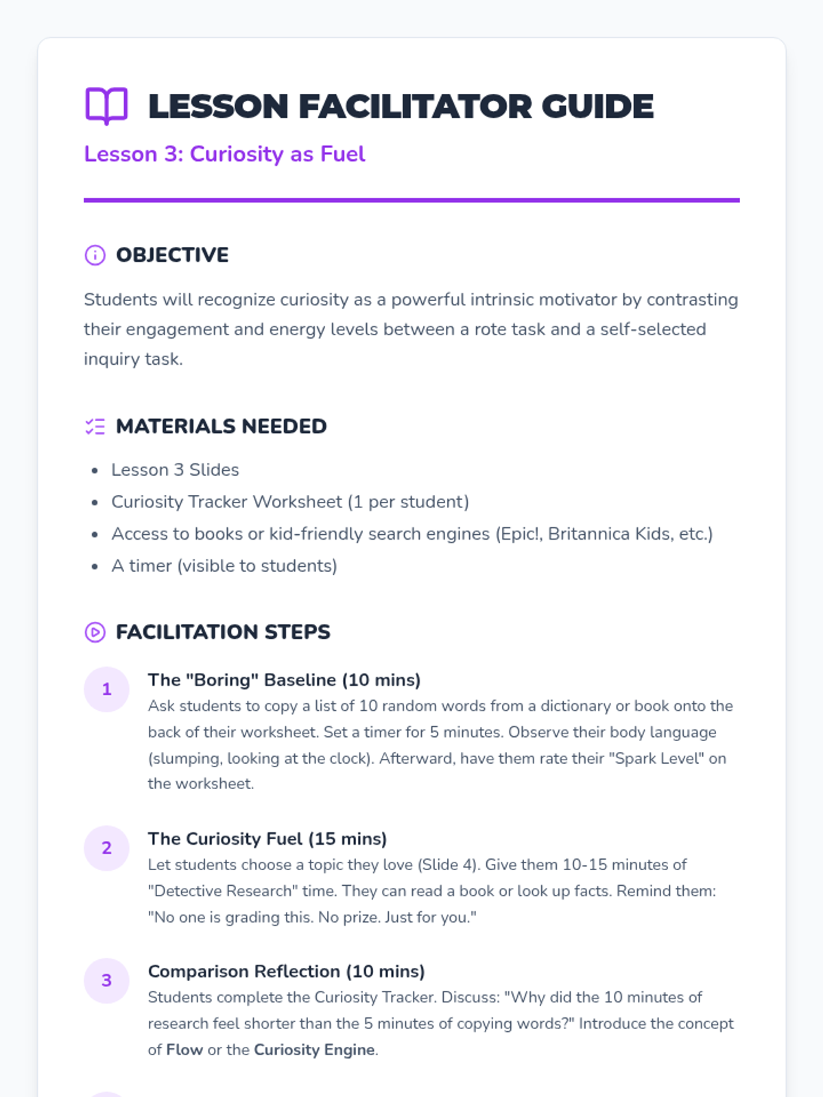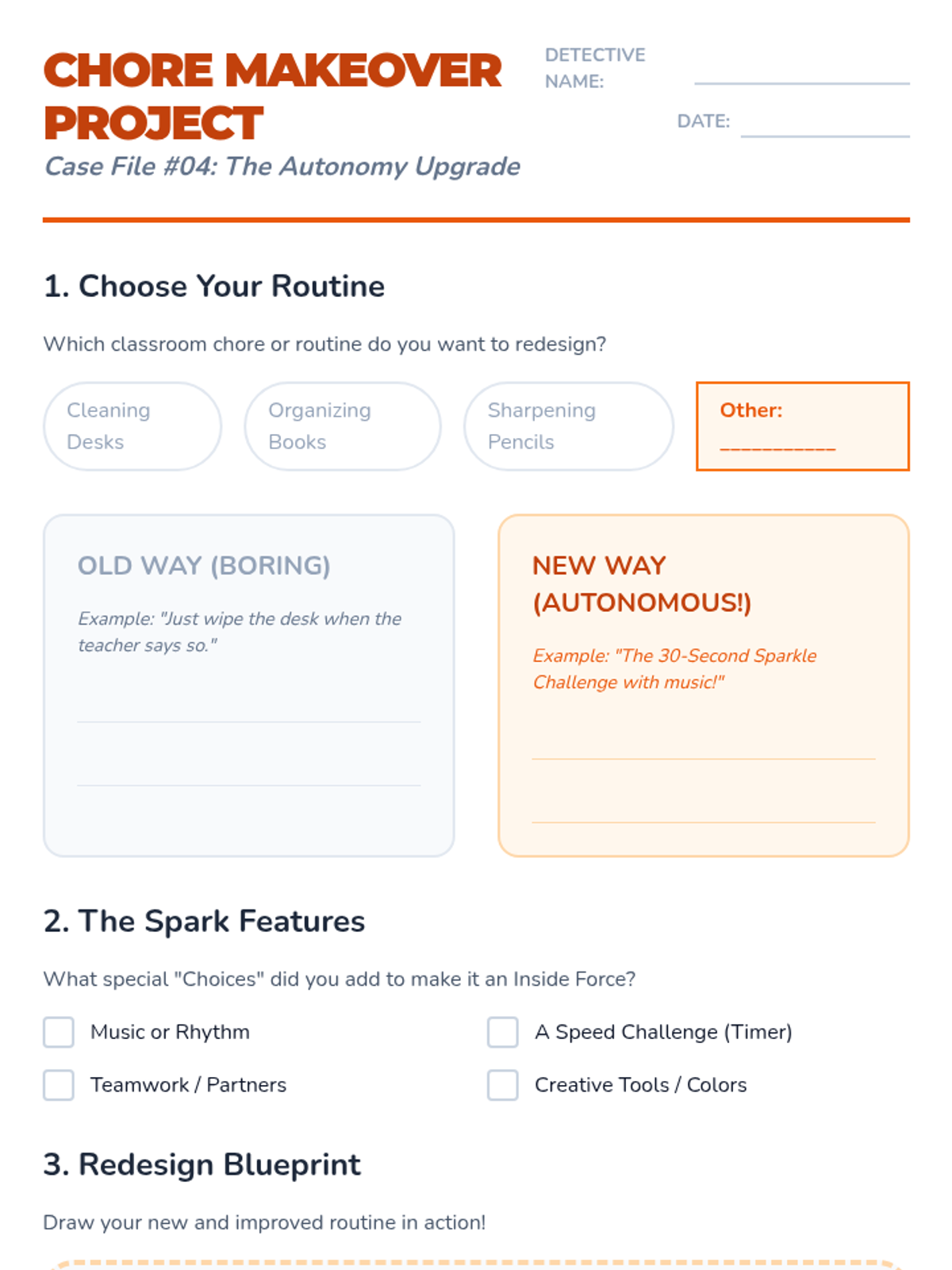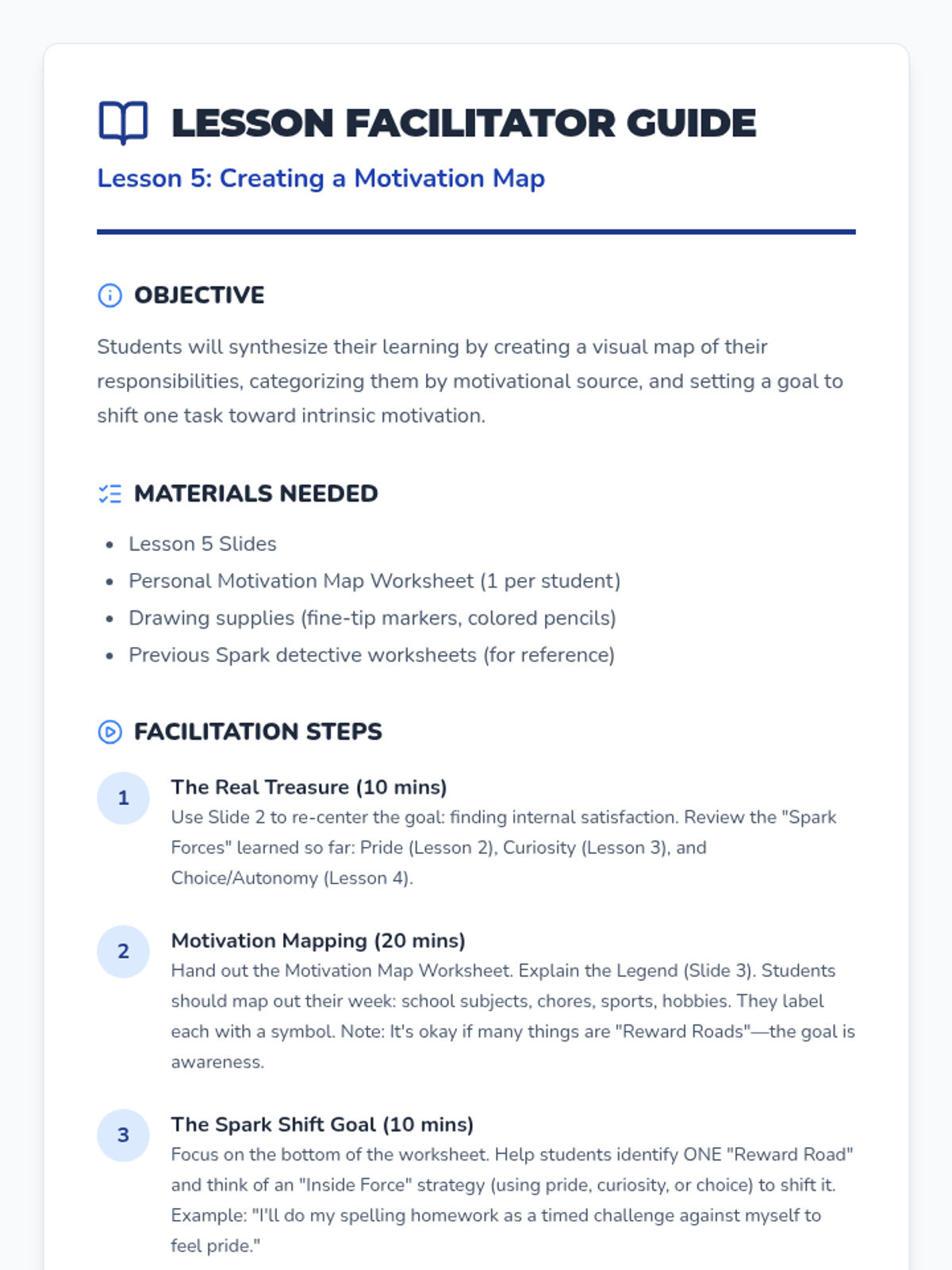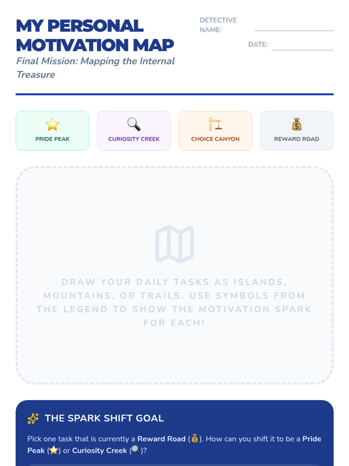 A 5-lesson unit for 3rd-grade students exploring the differences between intrinsic and extrinsic motivation through the lens of a detective agency. Students investigate 'Inside Forces' and 'Outside Forces' to discover what truly drives their best efforts.