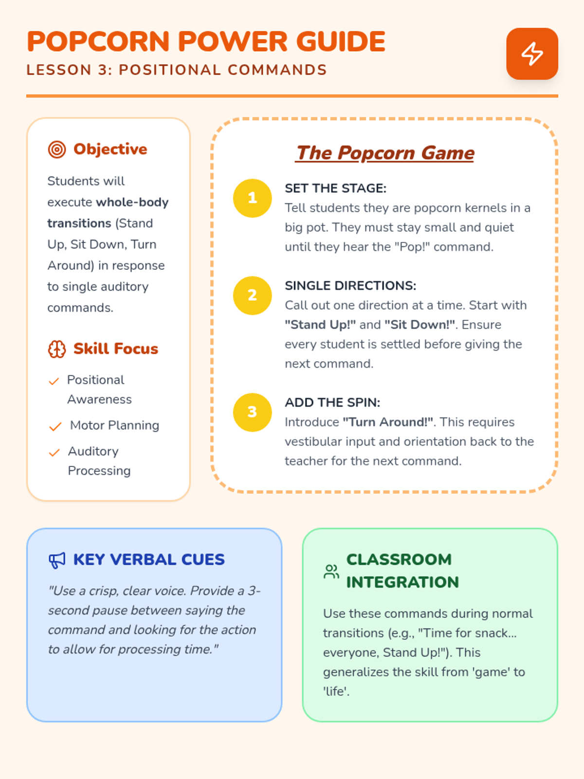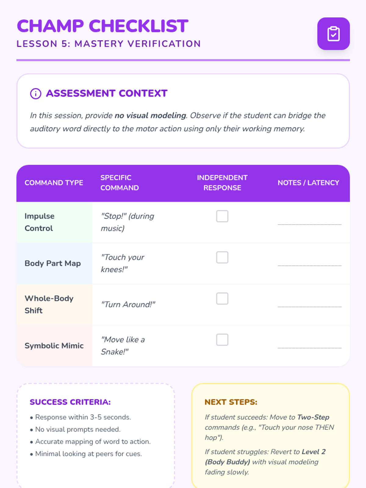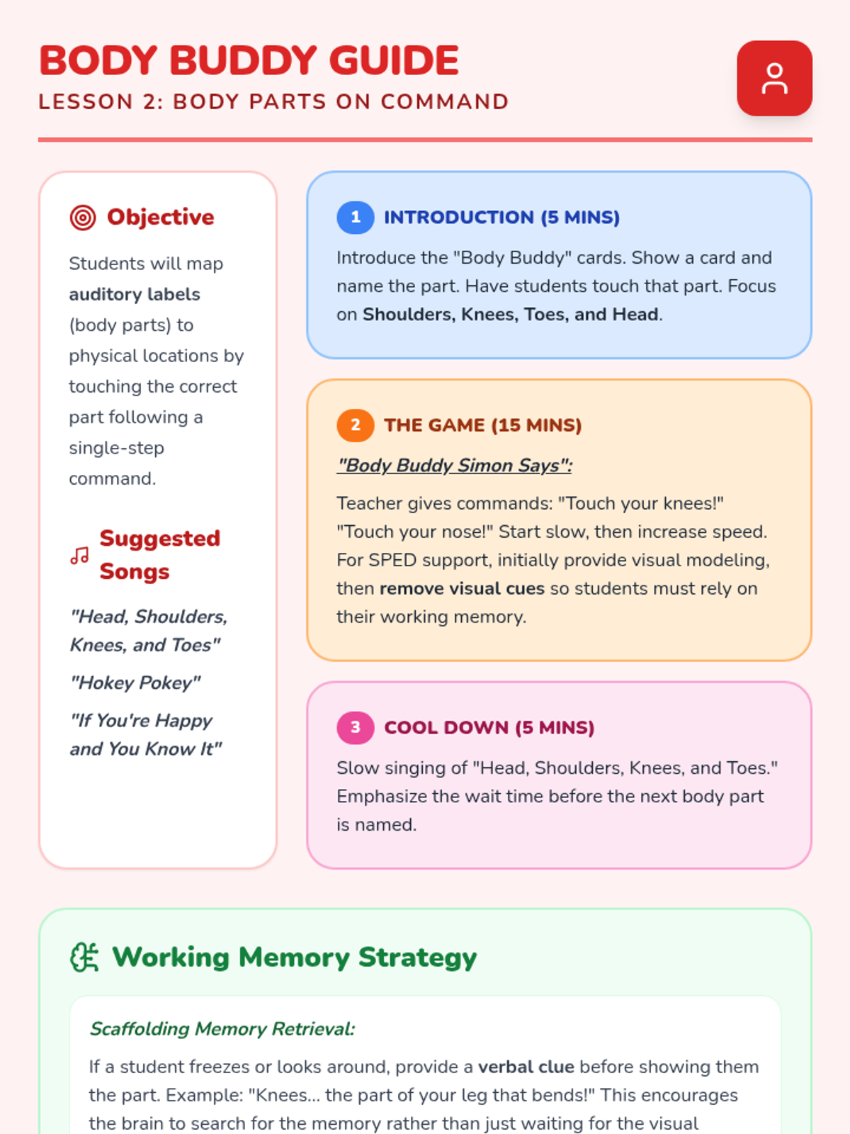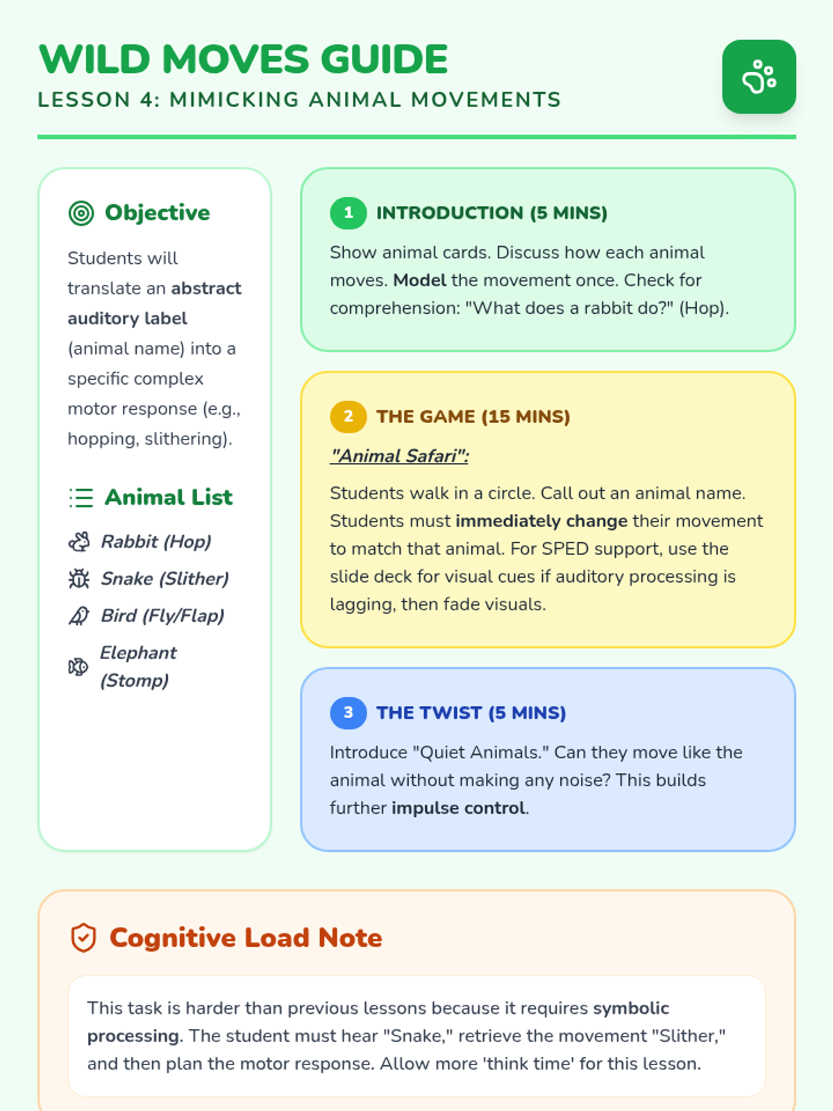 This sequence targets working memory and auditory processing for Pre-K students with special needs. It uses gross motor games to build the ability to follow single-step directions, moving from simple stop/go cues to complex symbolic animal movements.