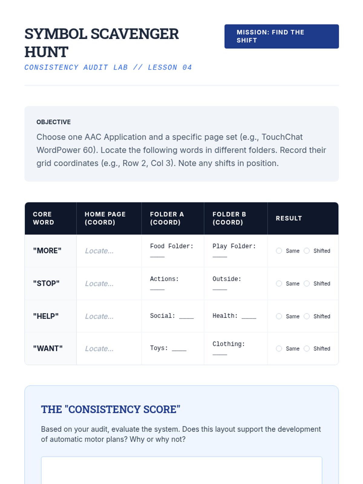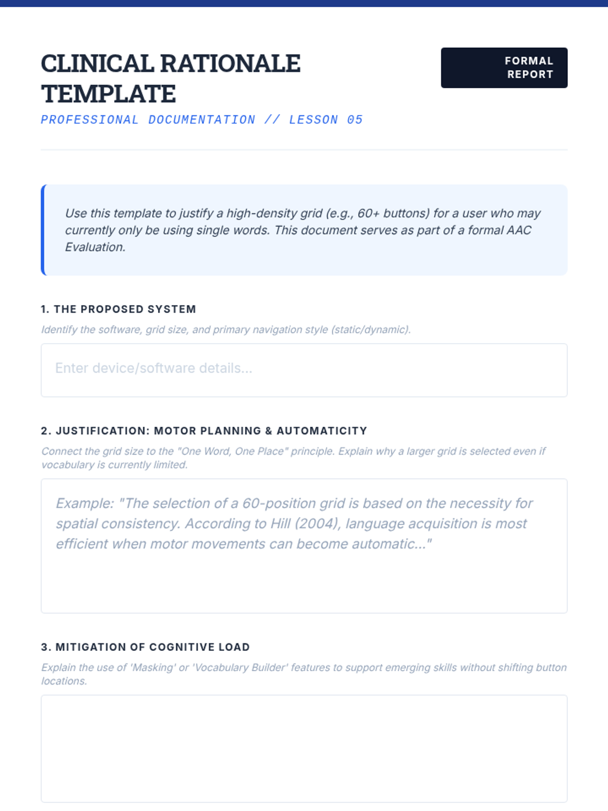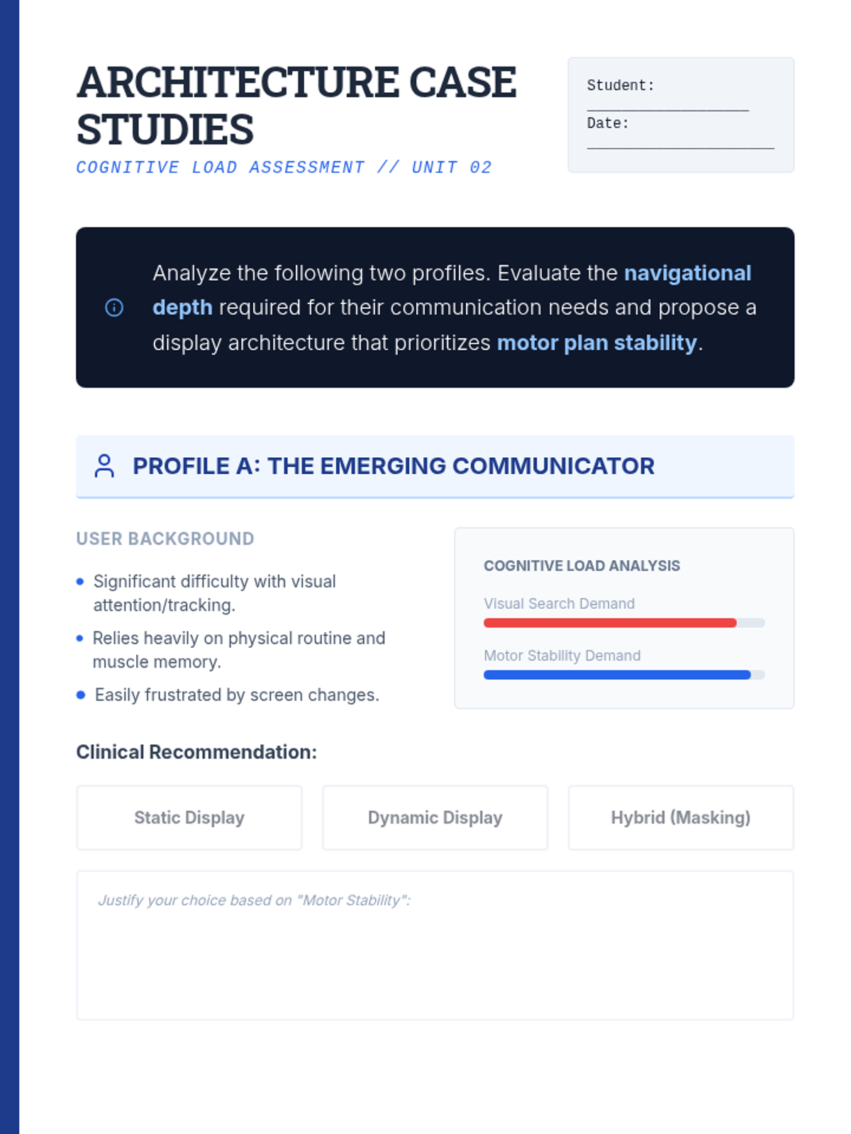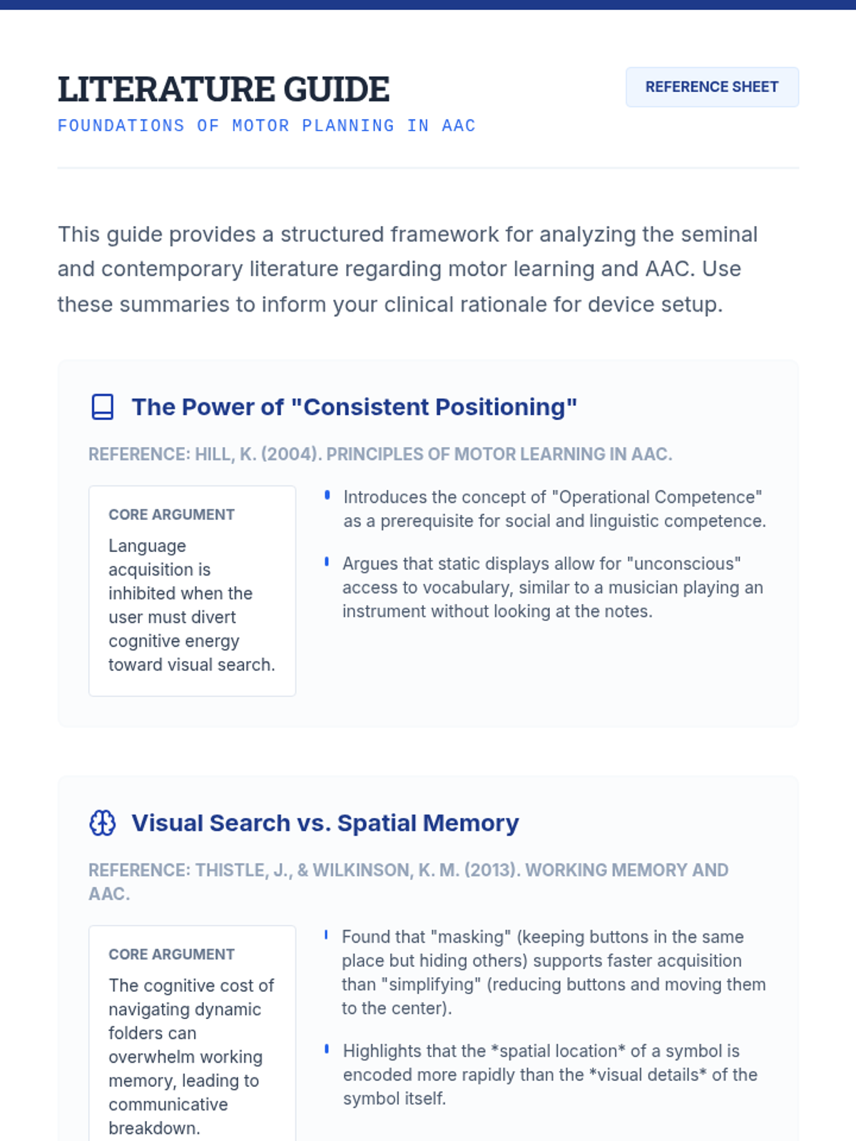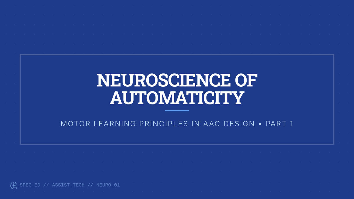 This graduate-level sequence connects motor learning principles (automaticity, motor planning, and cognitive load) to the architectural design of AAC interfaces. Students will analyze how device layout impacts long-term operational competence and learn to justify clinical design decisions using evidence-based neurological principles.