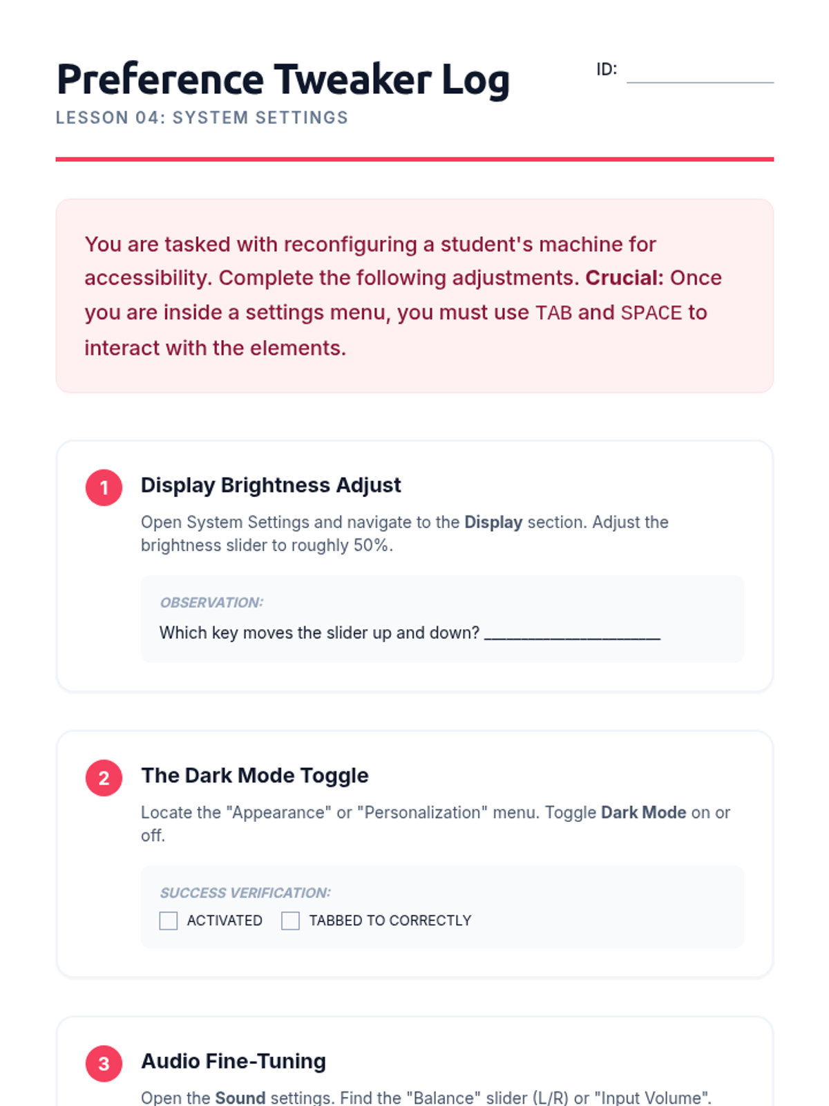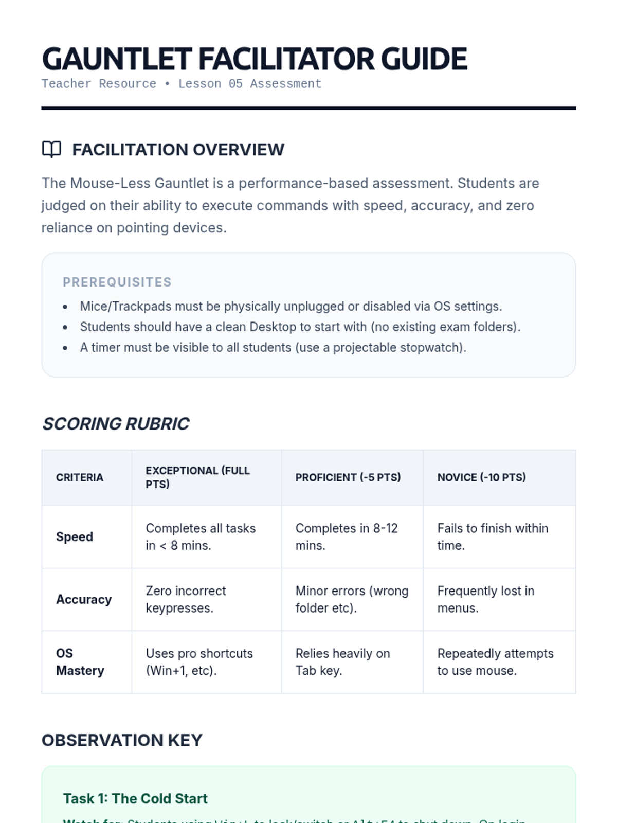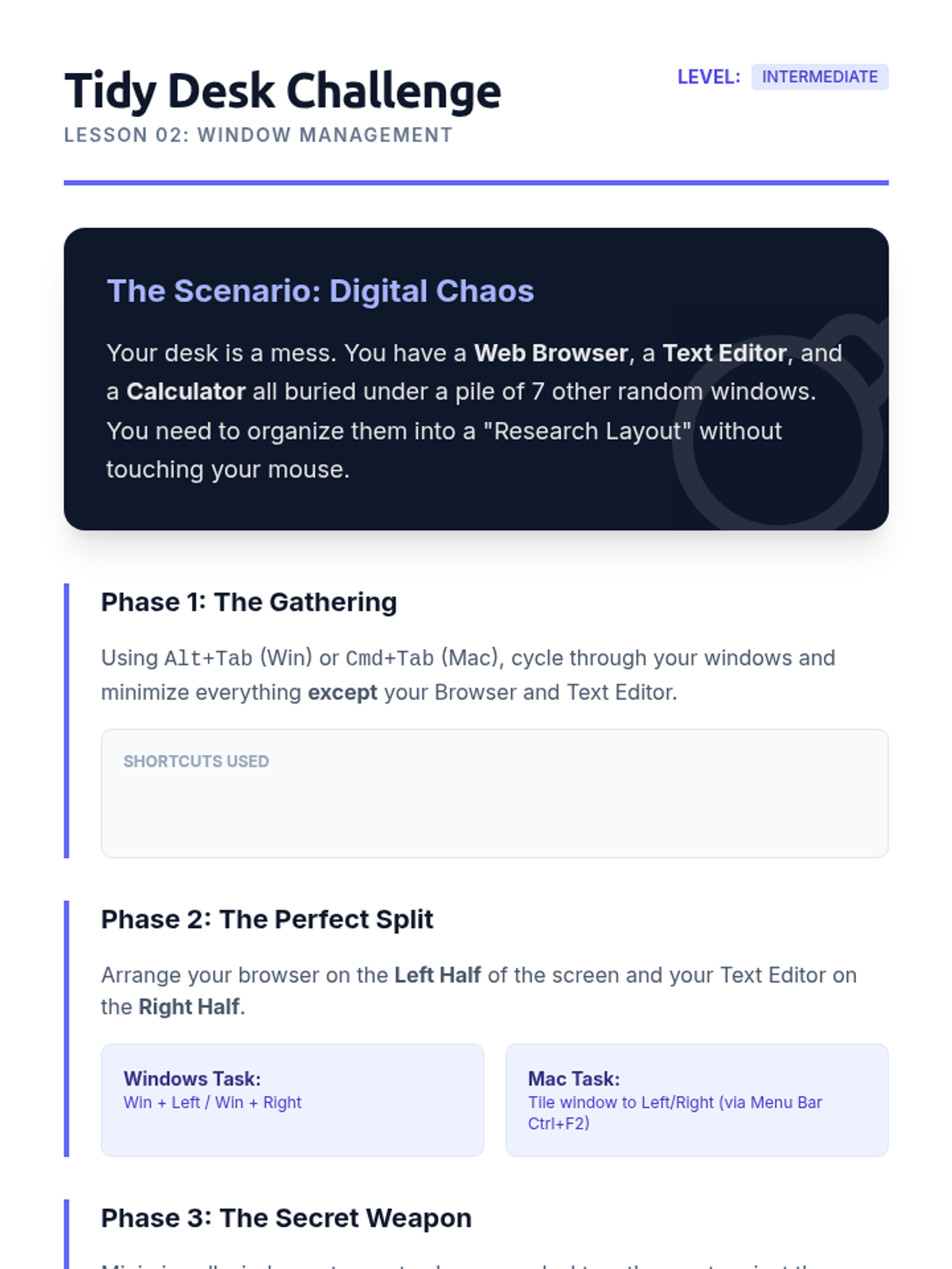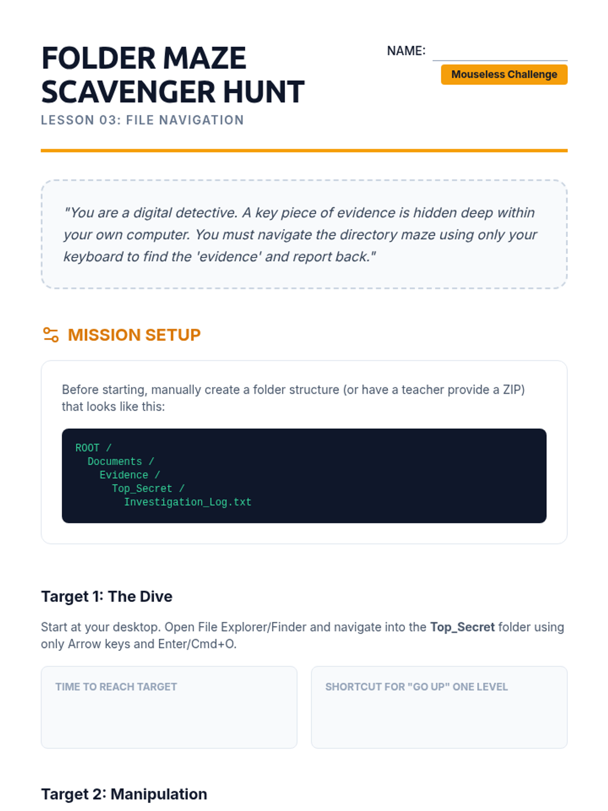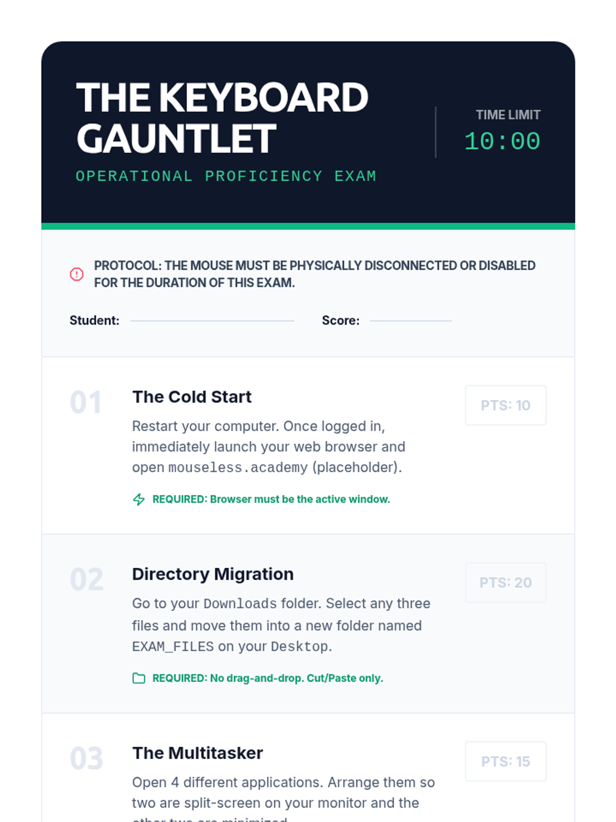 A mastery-based sequence for undergraduate students to learn mouse-less operating system navigation and file management. This series focuses on building muscle memory for keyboard shortcuts to improve accessibility and efficiency.