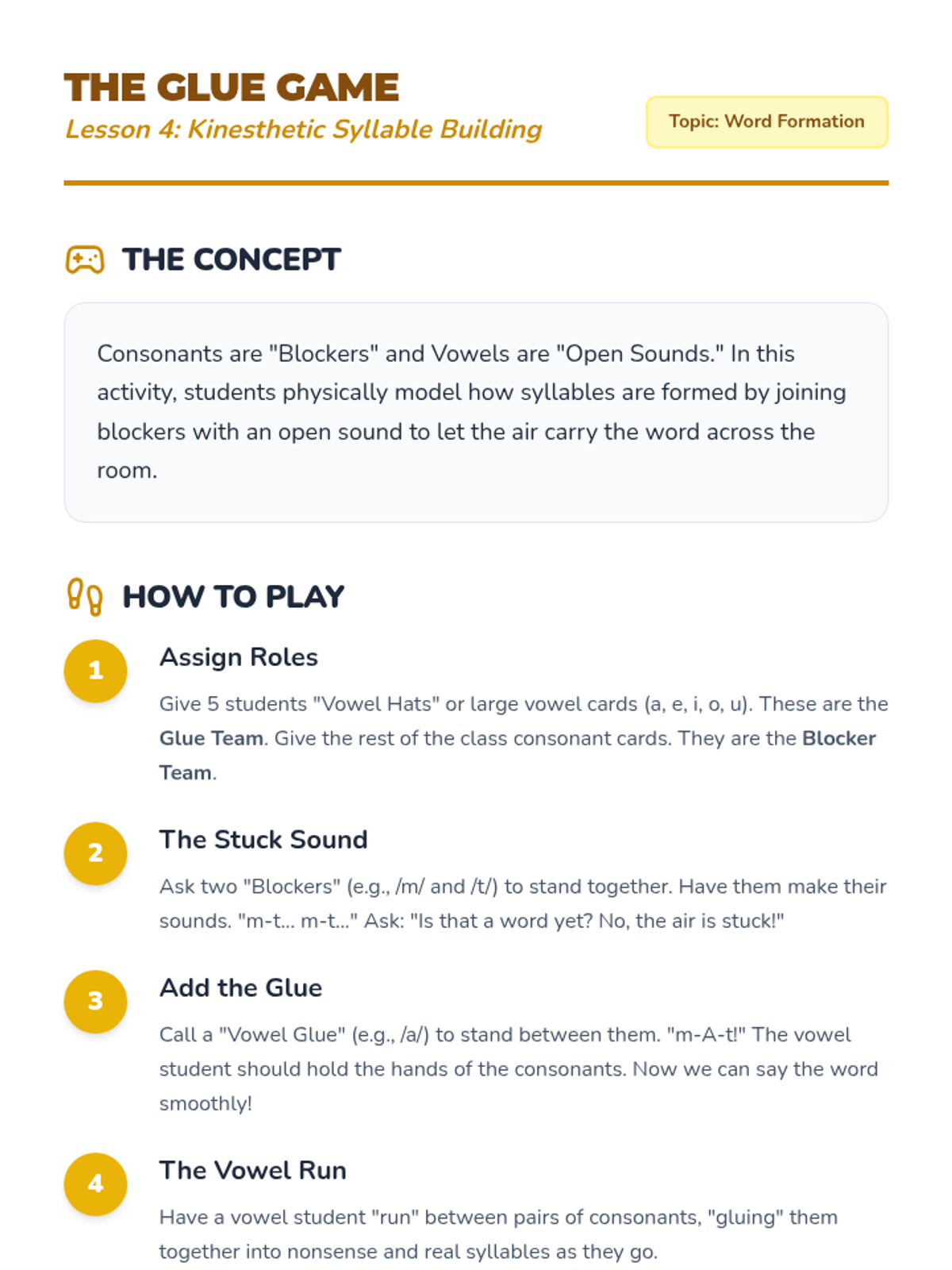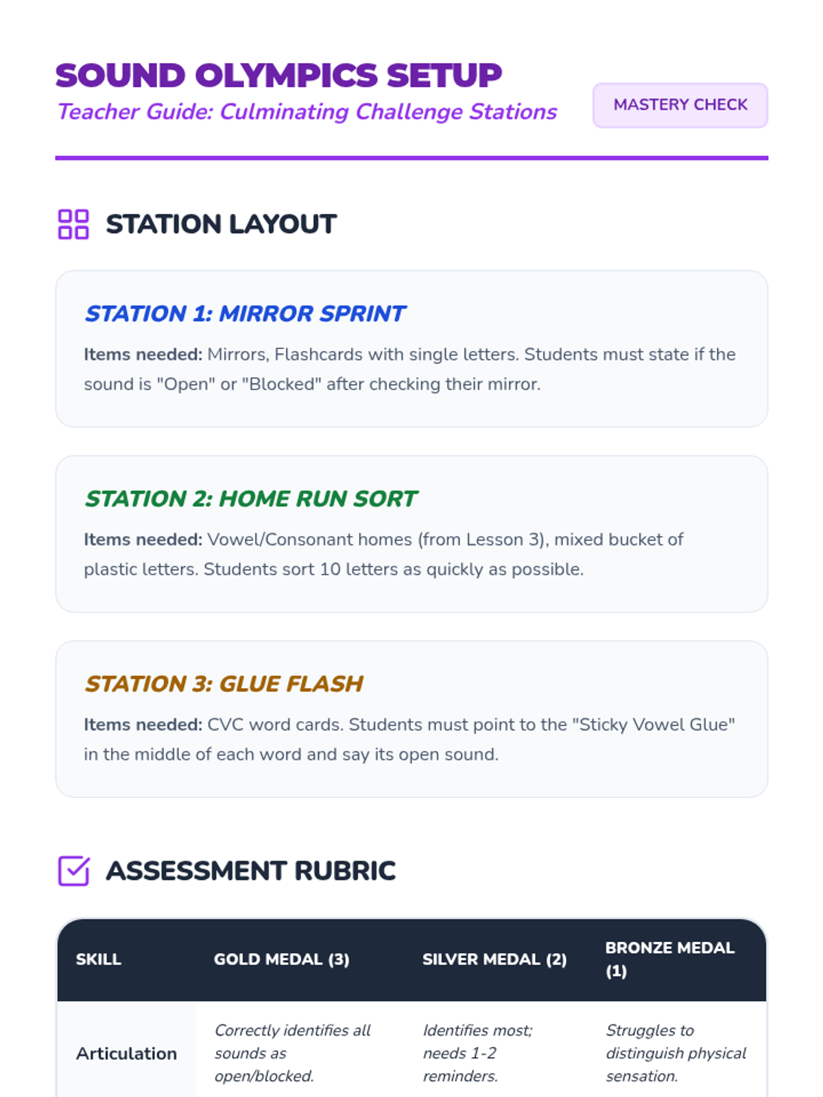 A Kindergarten phonics sequence focusing on the physical articulation of speech sounds. Students use mirrors and tactile exploration to distinguish between 'open' vowel sounds and 'blocked' consonant sounds, building a foundation for phonemic awareness and letter-sound correspondence.