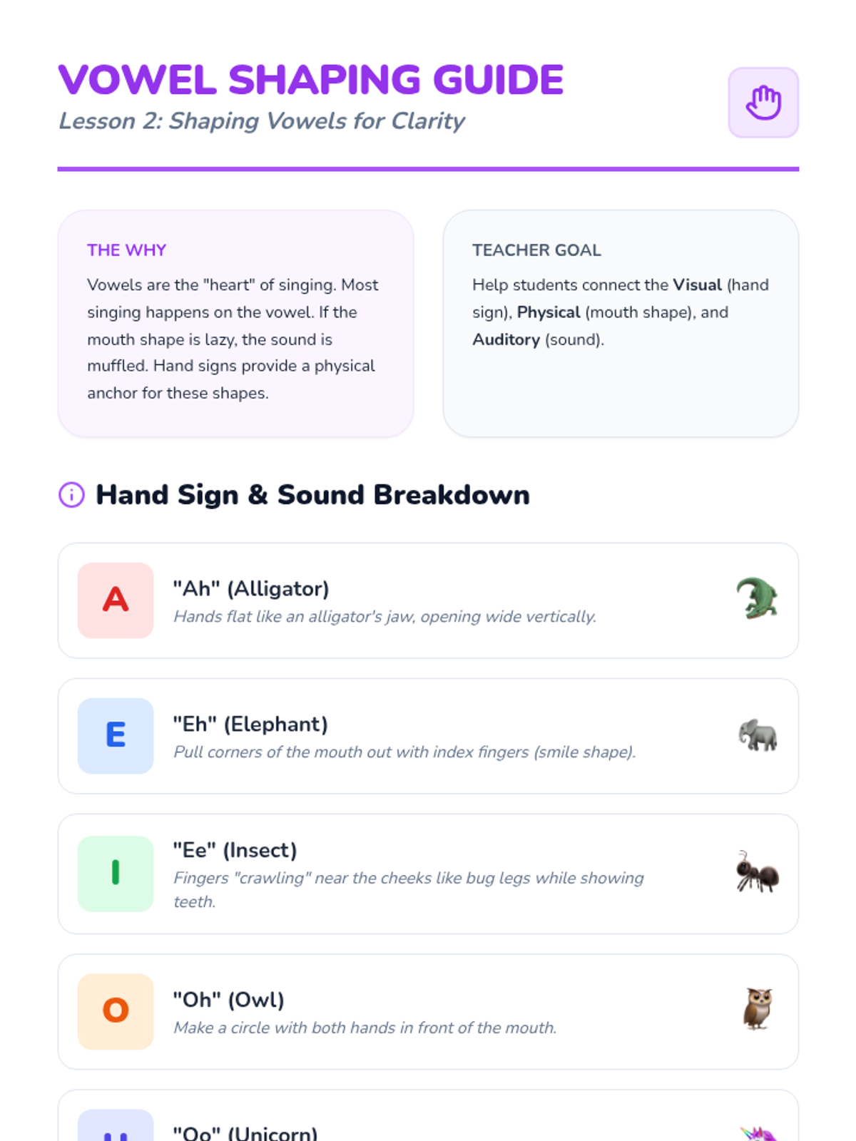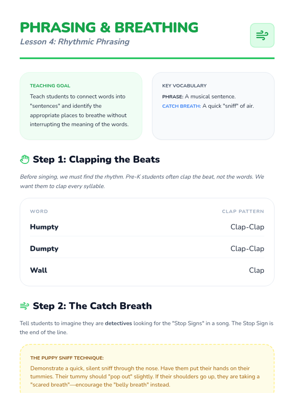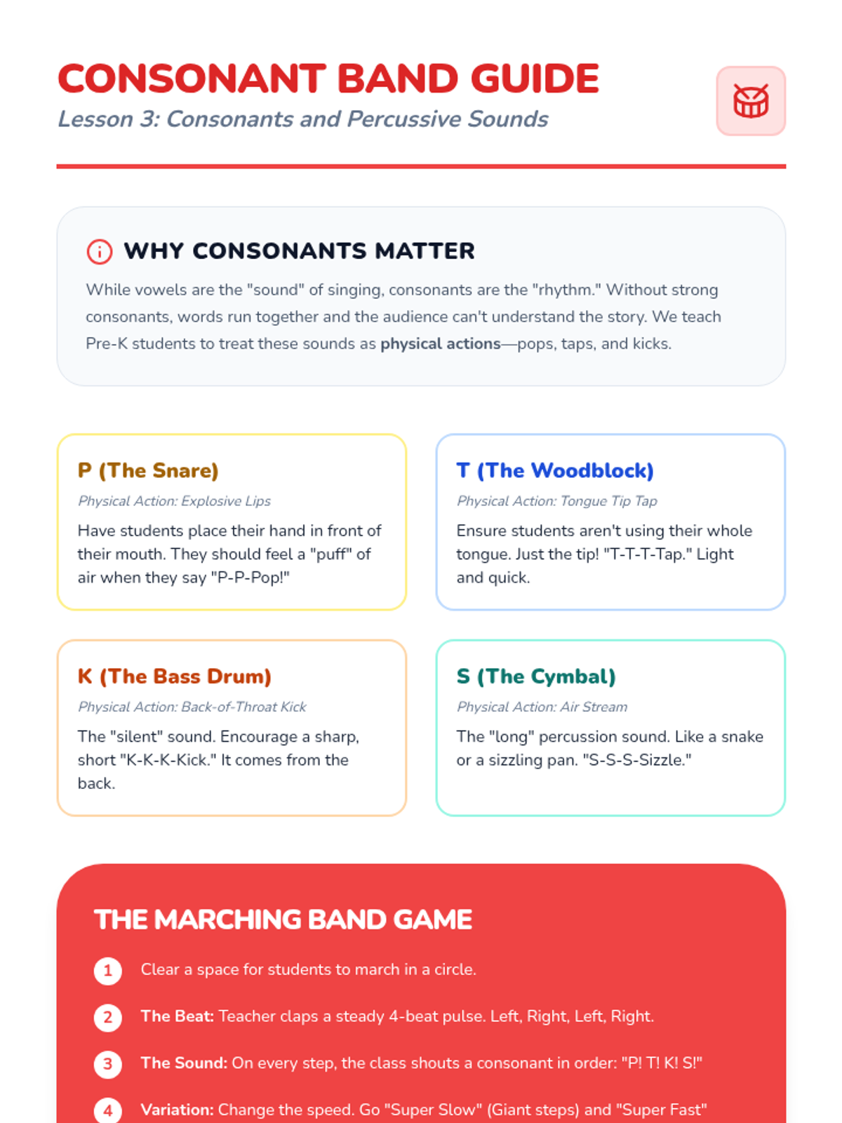 A fun, interactive music sequence for Pre-K students focused on developing clear articulation and rhythmic precision in singing through games, mouth gymnastics, and nursery rhymes.