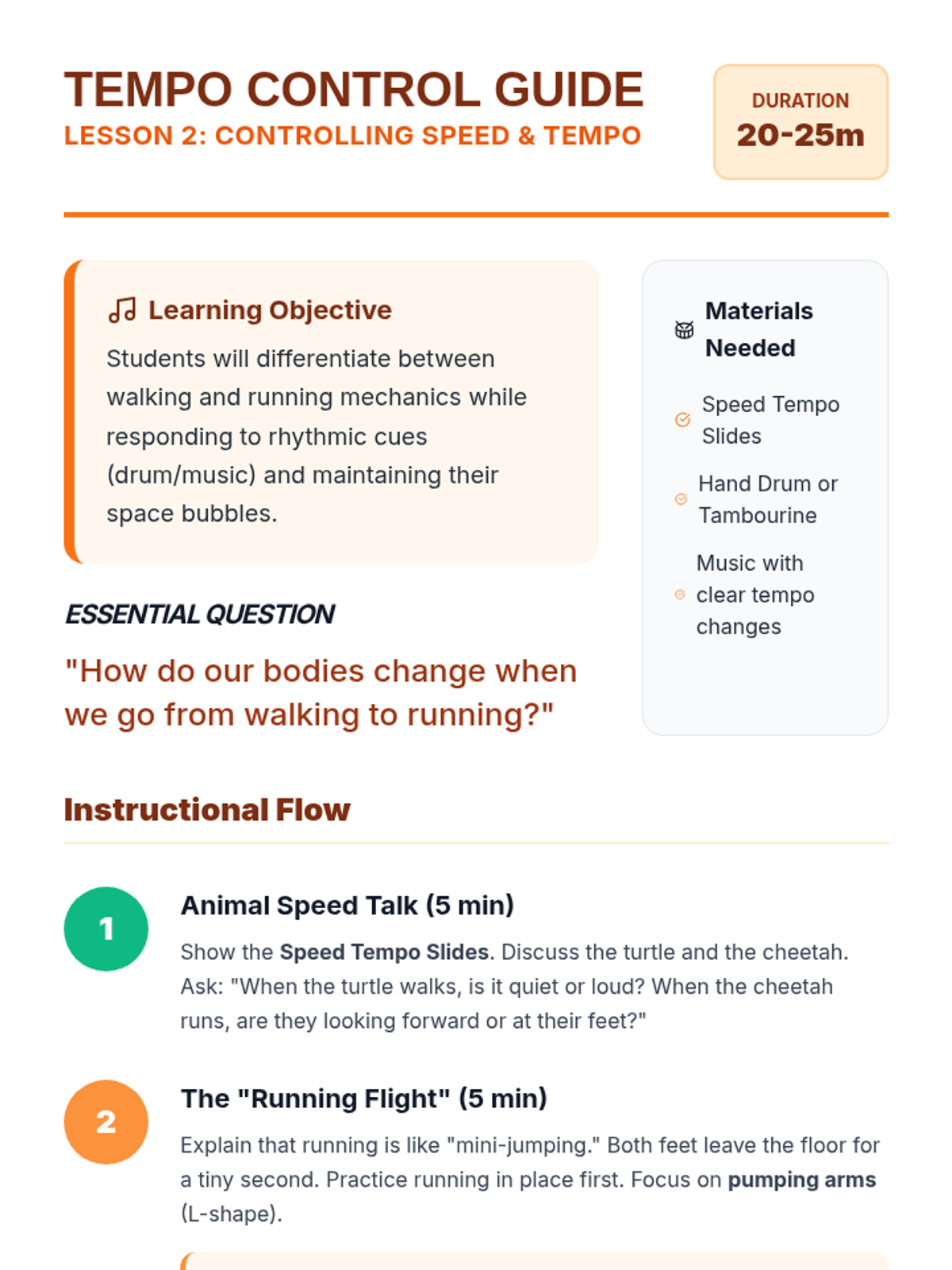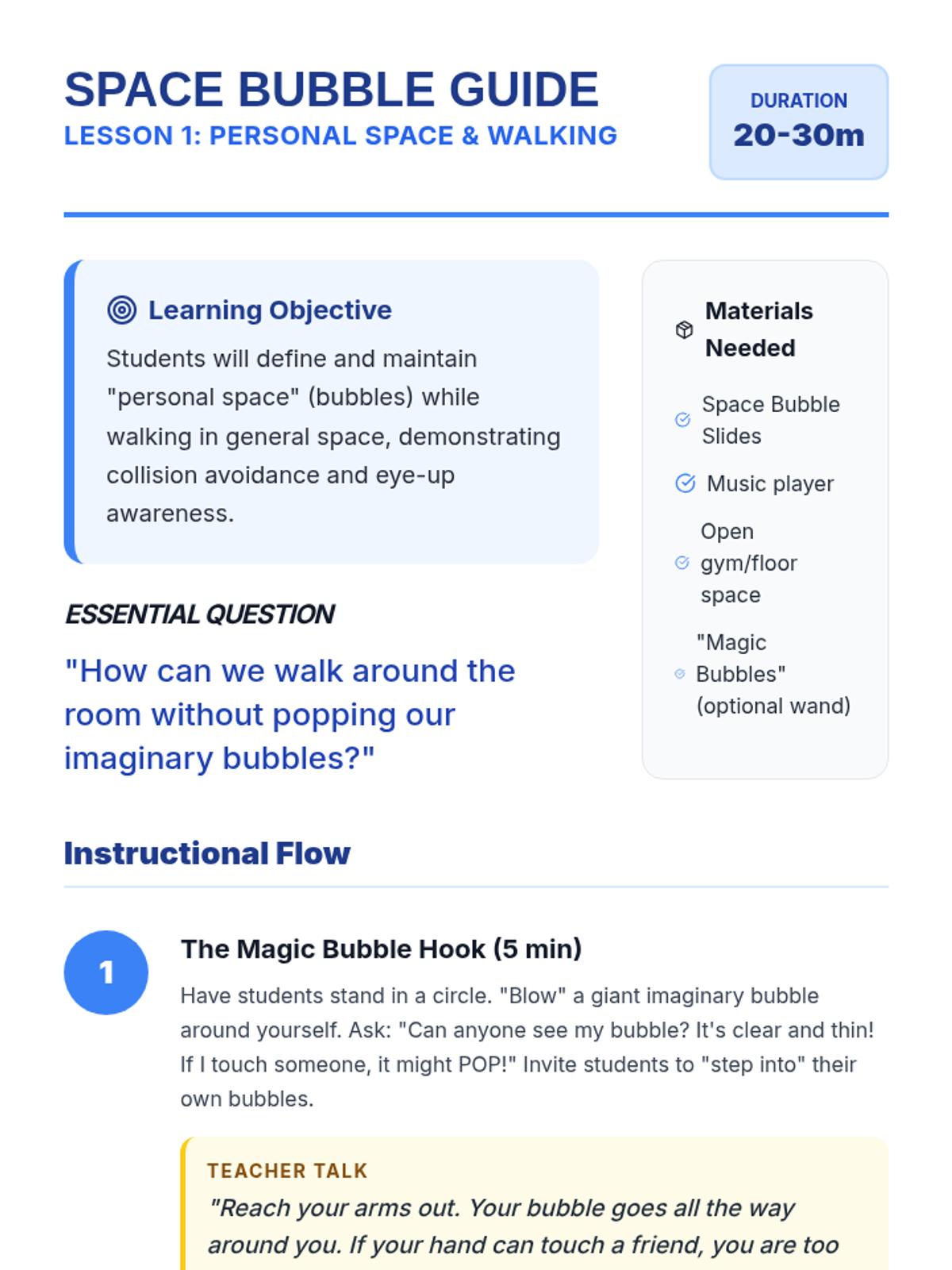 A foundational locomotor skills sequence for Pre-K students focusing on walking and running with safety, spatial awareness, and speed control. Students explore personal space through 'bubbles', differentiate between speeds, and master instant stops.