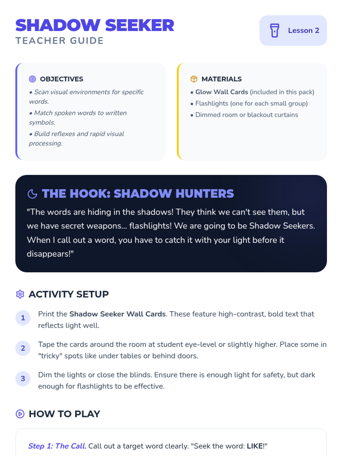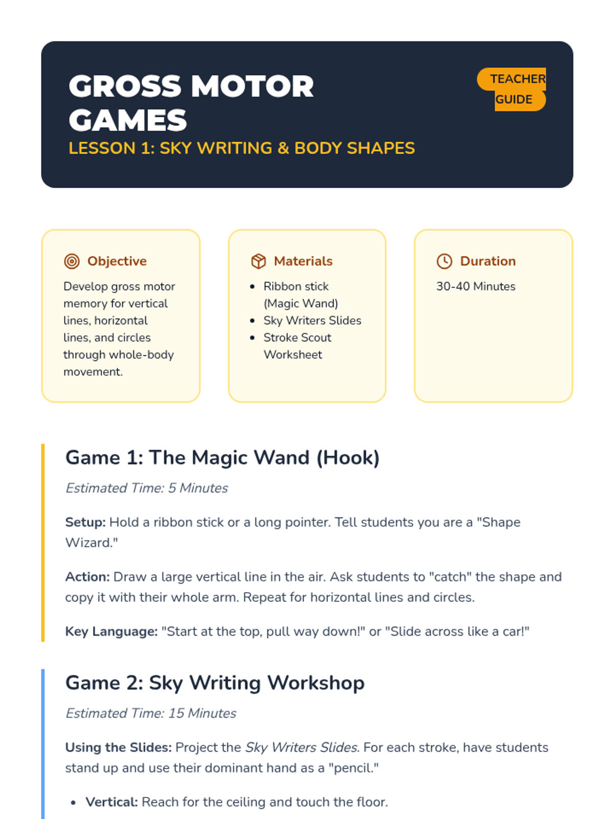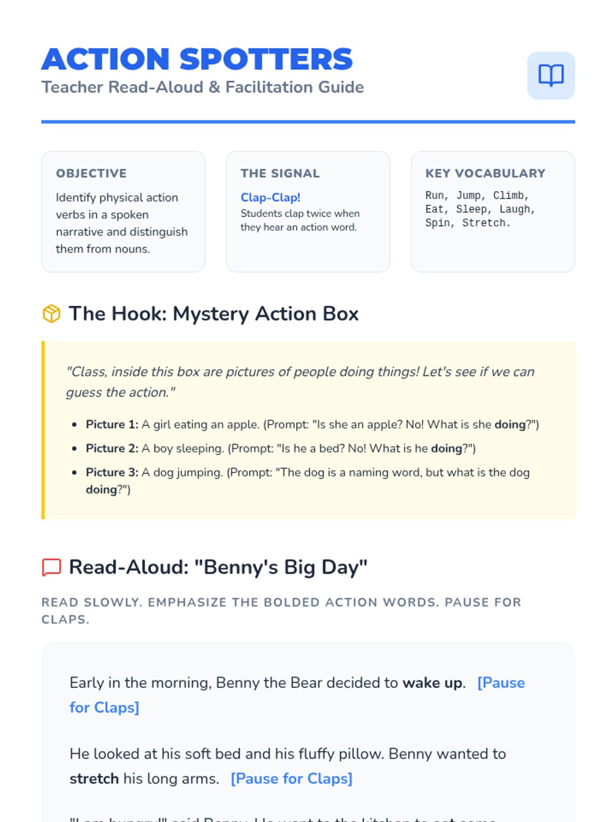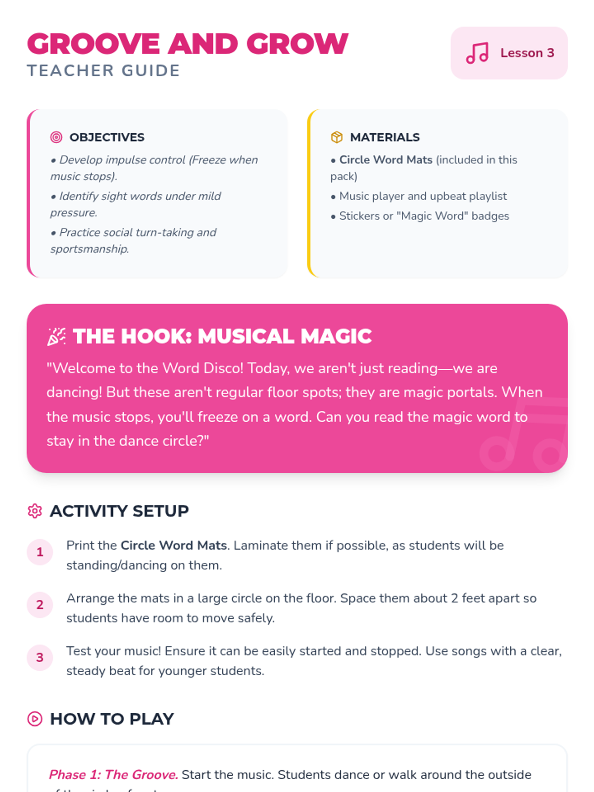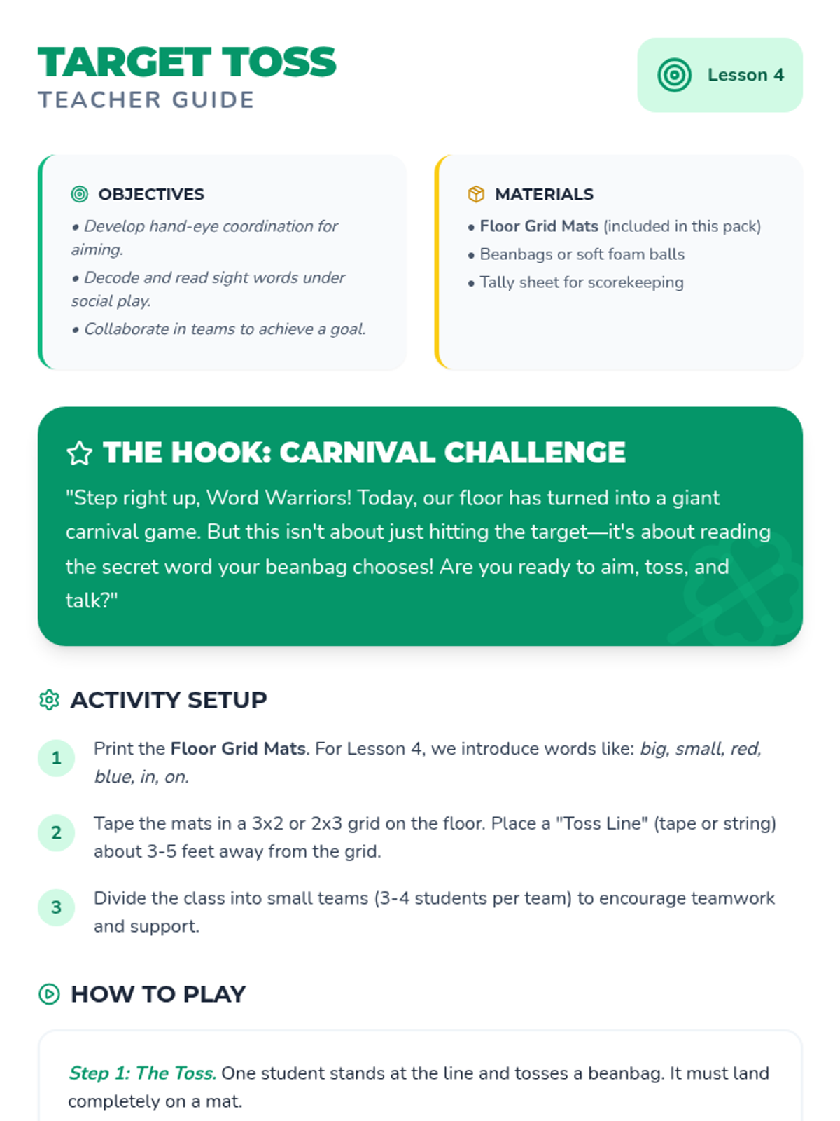 A kinesthetic ELA sequence for Pre-K students that teaches sight words through gross motor movement, including jumping, searching, dancing, and racing. Students connect physical action with rapid word recognition to build reading foundations in a high-energy, engaging environment.