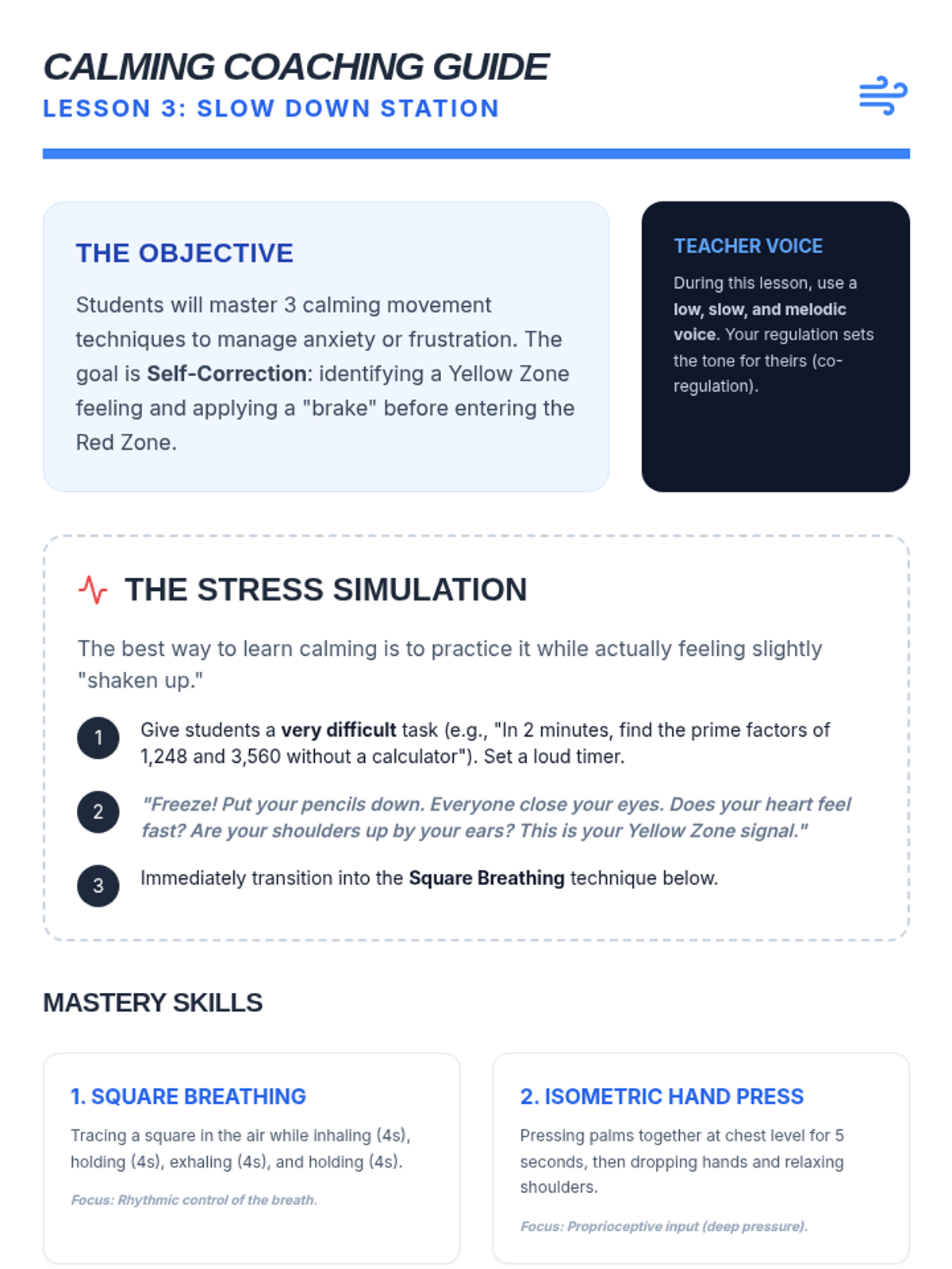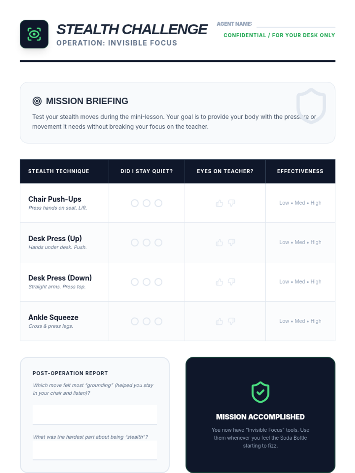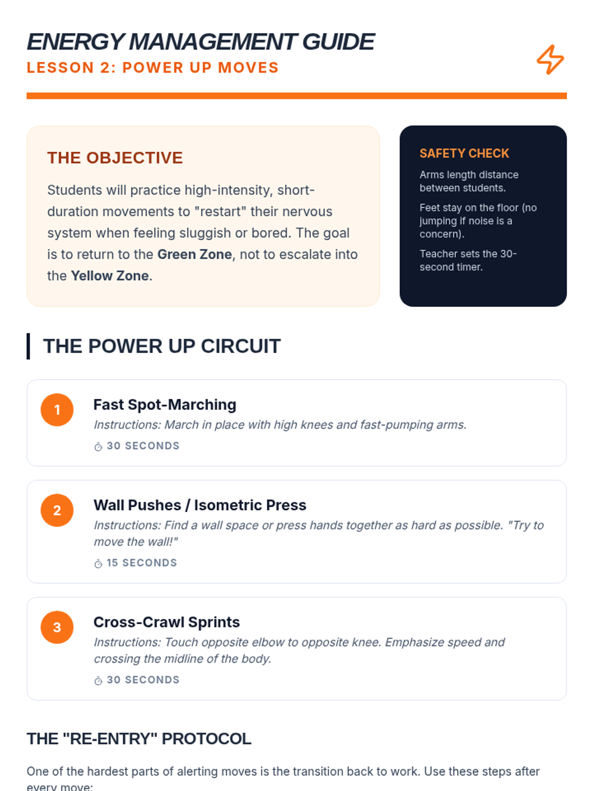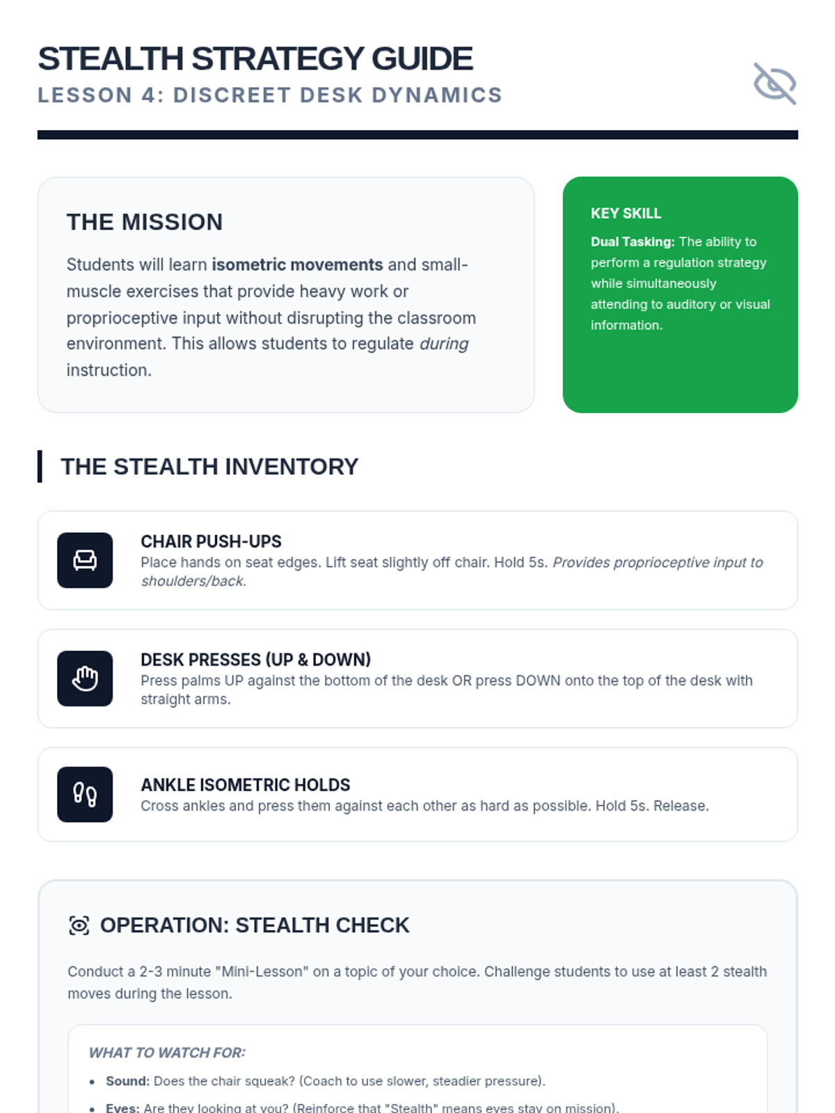 A workshop-style sequence for 5th graders to build personalized self-regulation strategies through purposeful movement breaks. Students progress from identifying triggers to mastering discreet desk-based techniques and creating a final personal toolkit.