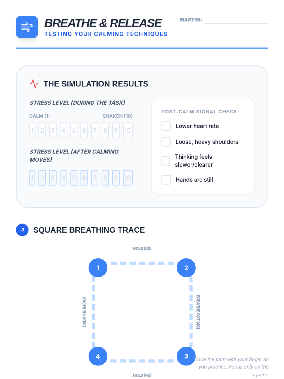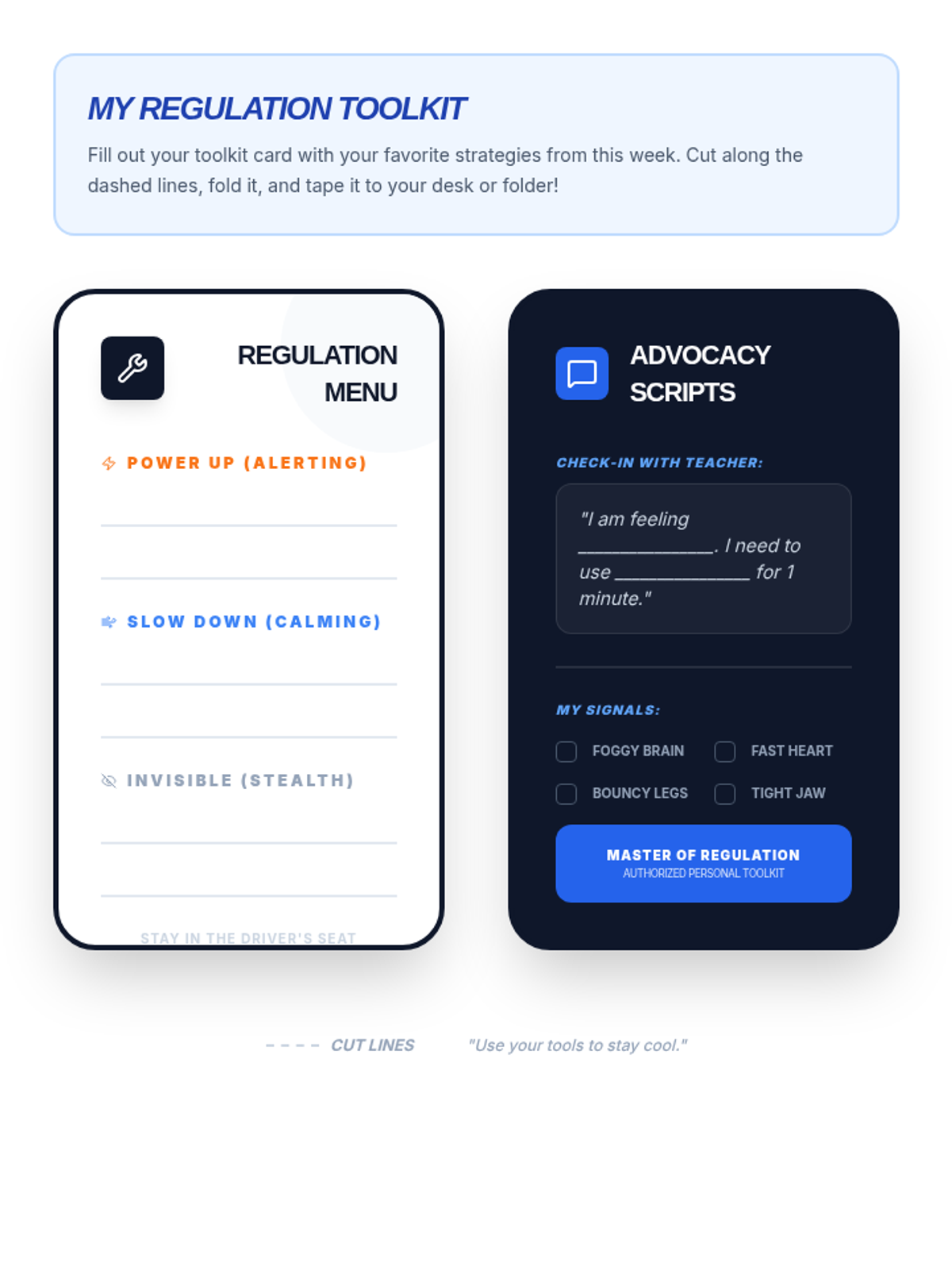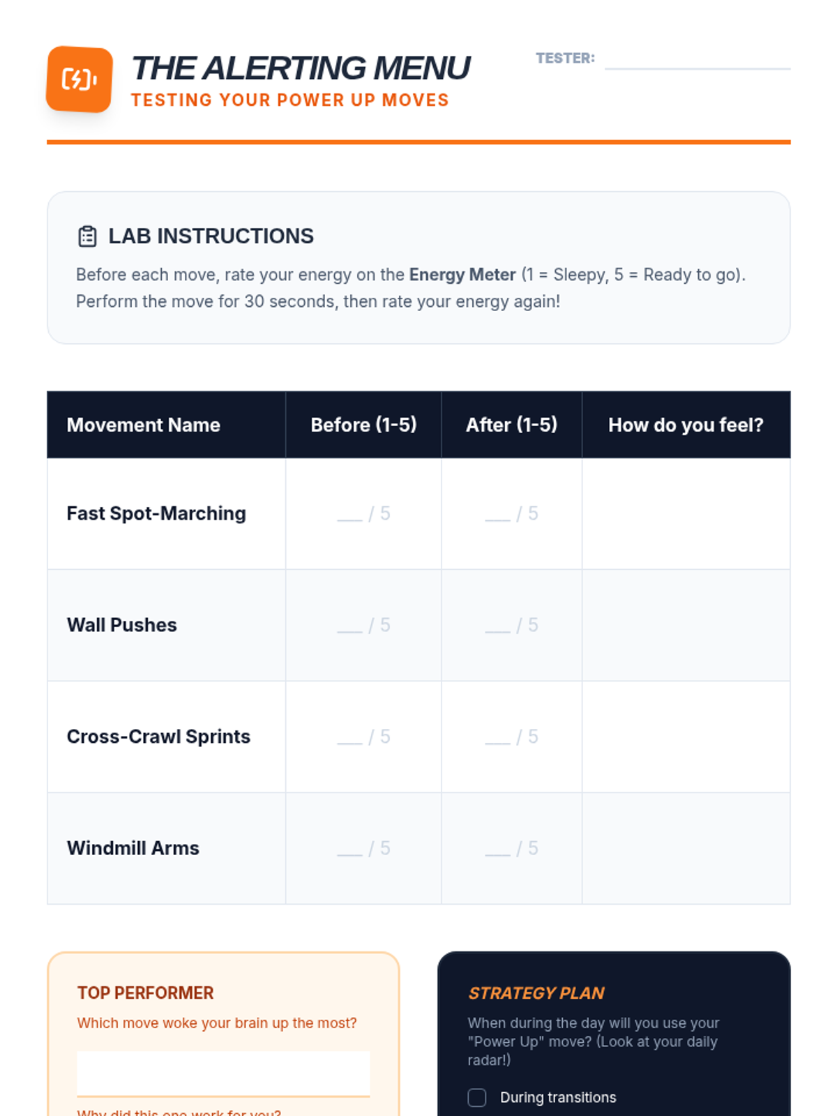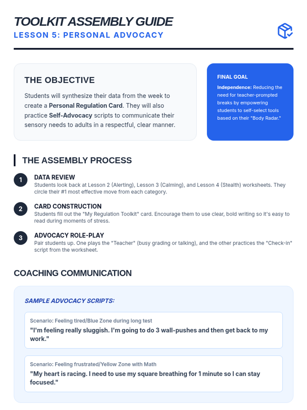 A workshop-style sequence for 5th graders to build personalized self-regulation strategies through purposeful movement breaks. Students progress from identifying triggers to mastering discreet desk-based techniques and creating a final personal toolkit.