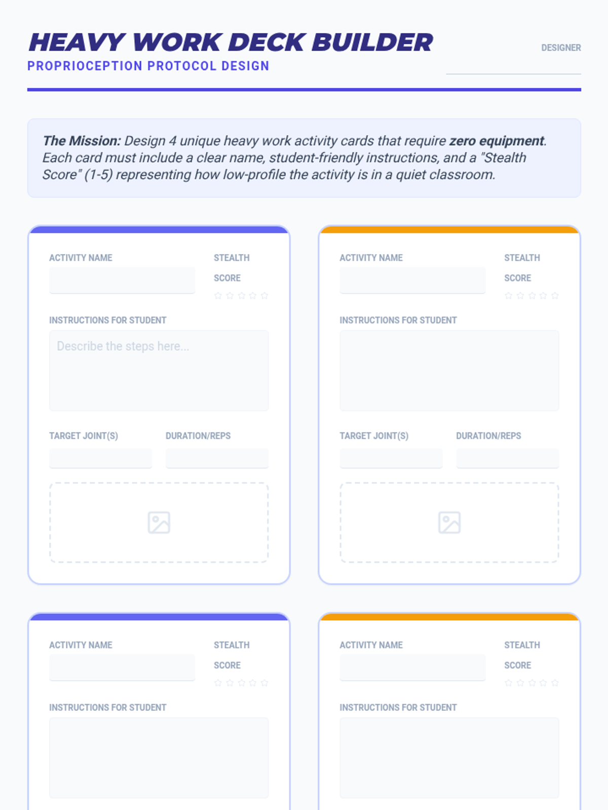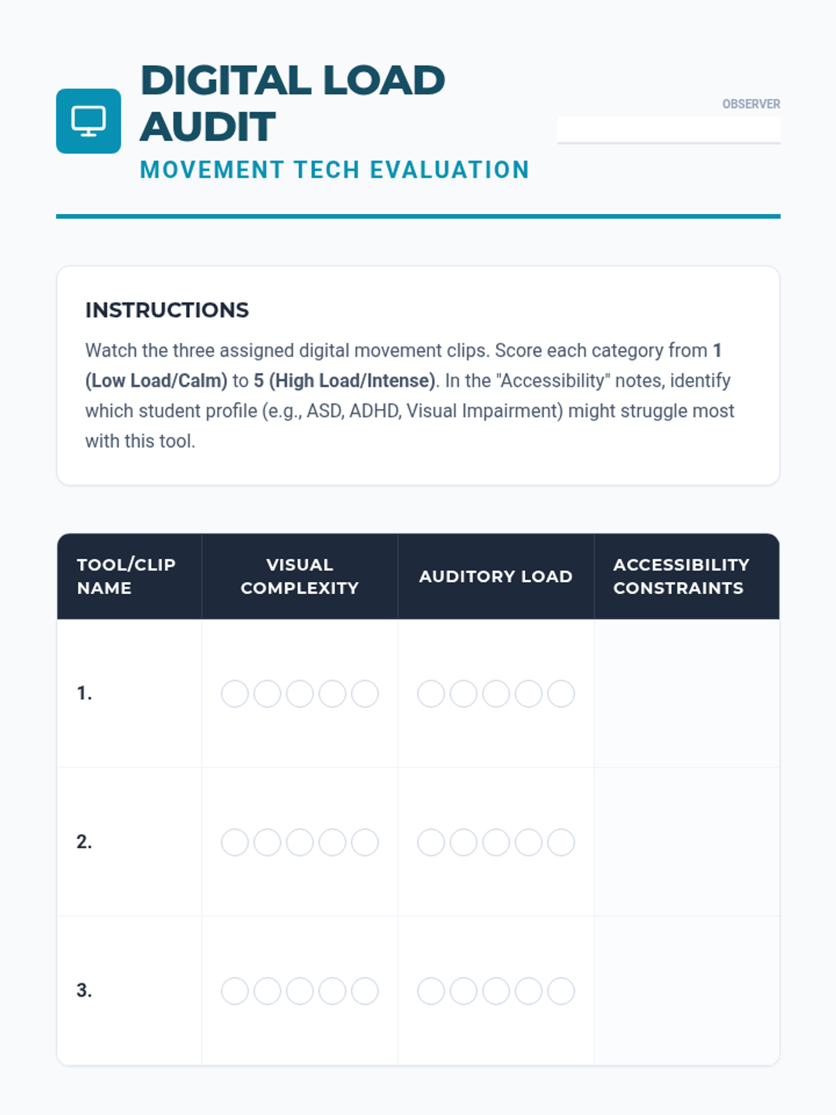 An undergraduate sequence exploring the design and implementation of sensory-informed movement breaks in the general education classroom. Students progress from environmental assessment to designing specialized protocols and high-tech interventions, culminating in a professional 'Movement Menu' project.