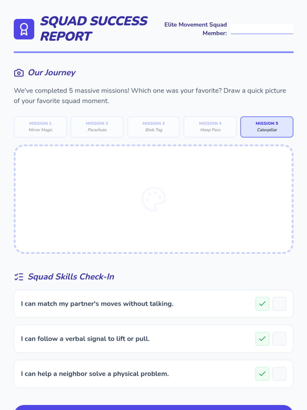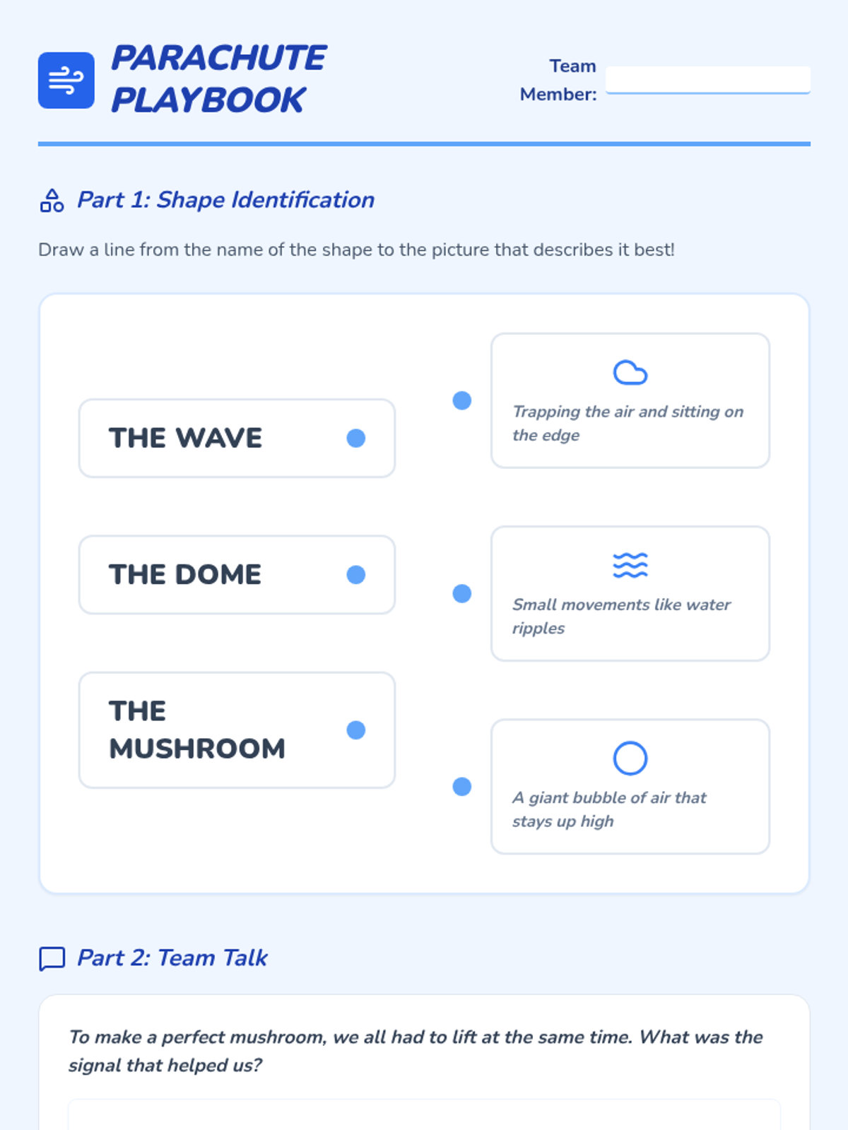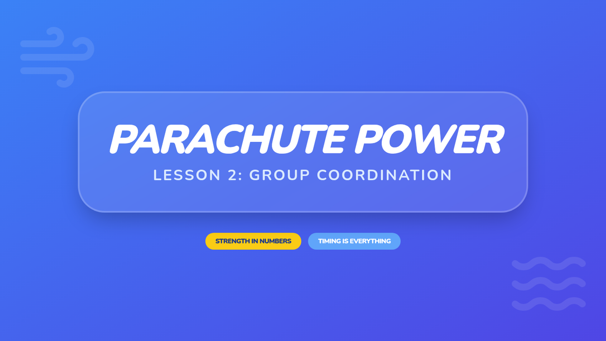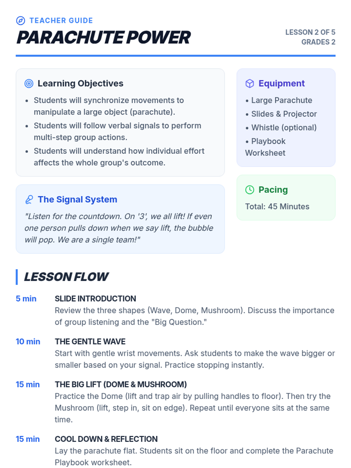 A high-energy sequence for 2nd graders focusing on cooperative movement, synchronization, and team-based physical challenges. Students progress from partner mirroring to large-scale group coordination using parachutes and linked movement.