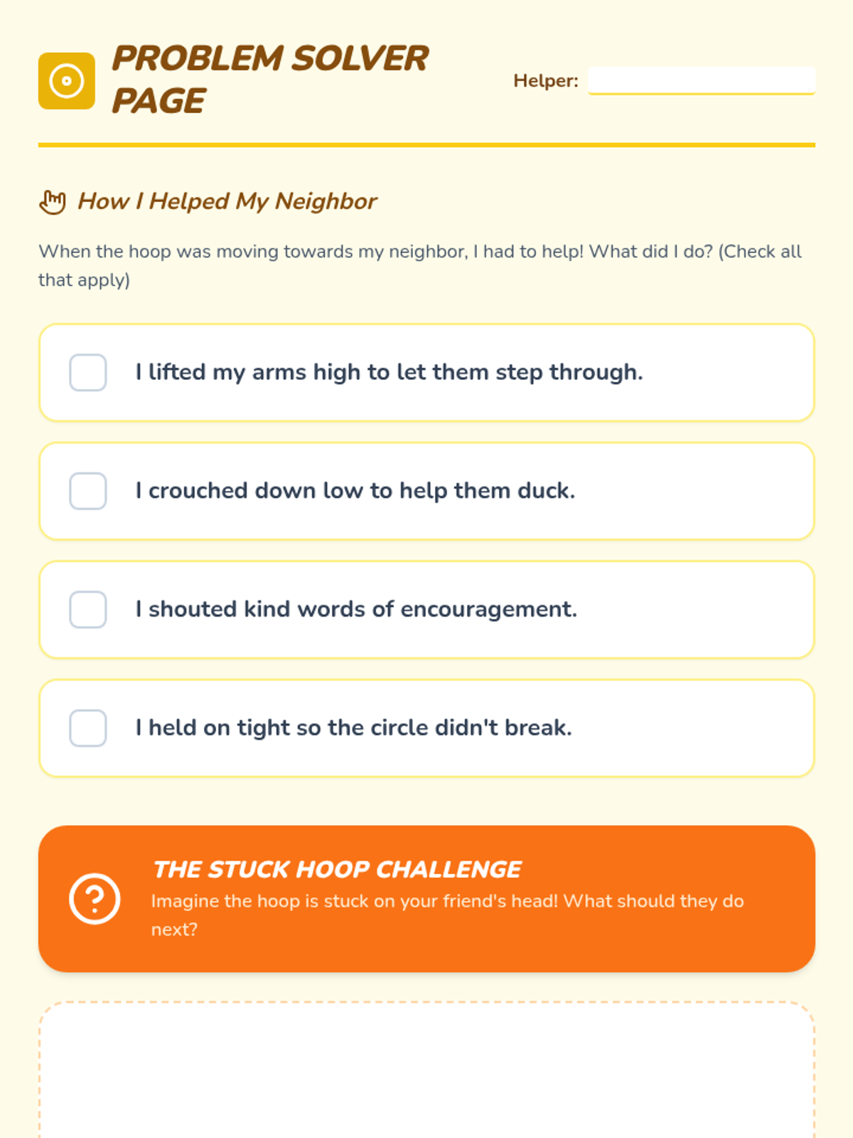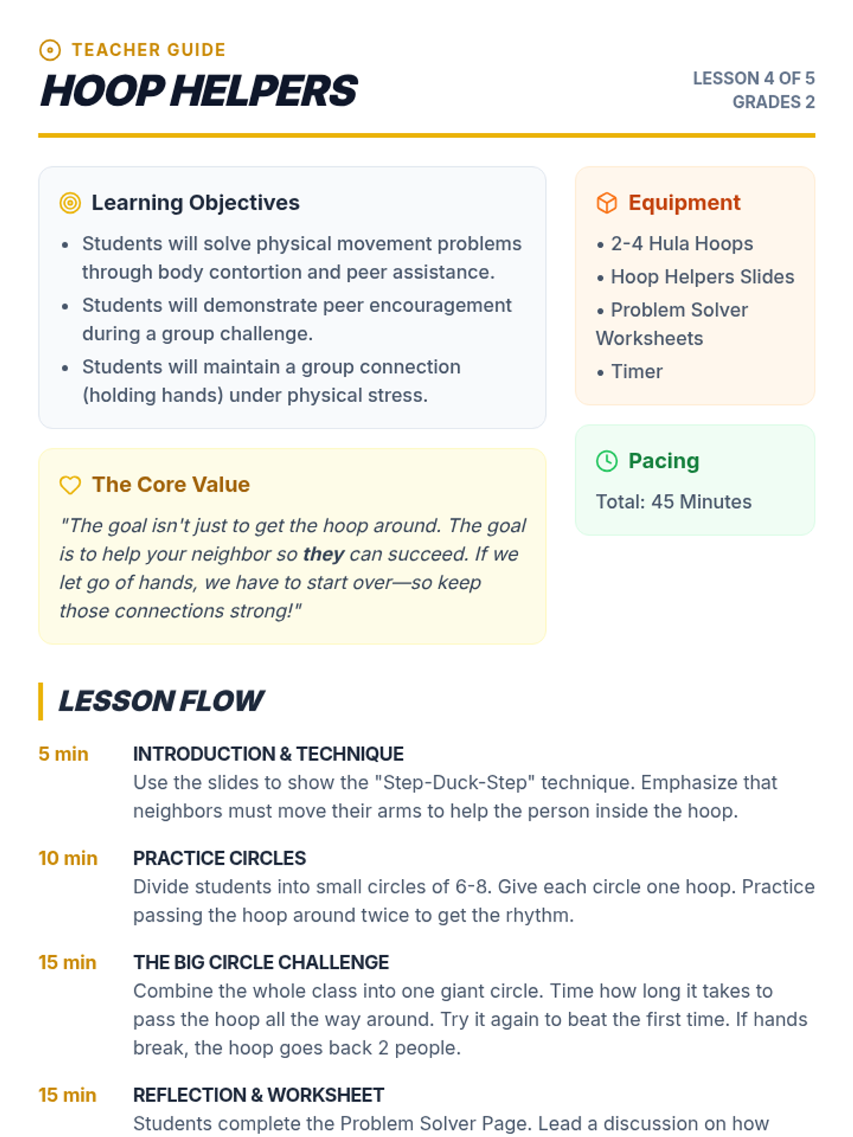 A pair of 10-minute assembly lessons focused on friendship, safety, and community respect for K-2 and 3-5 students, addressing physical and verbal behavior.