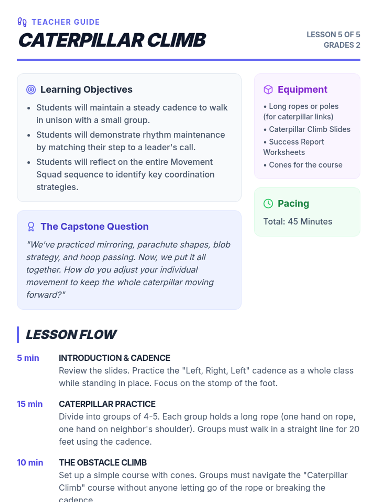 A 2nd-grade gymnastics sequence focused on developing stability, core strength, and confidence on elevated surfaces or narrow lines. Students explore static balances, dynamic travel, level changes, and safe dismounts through inquiry-based and skill-building activities.