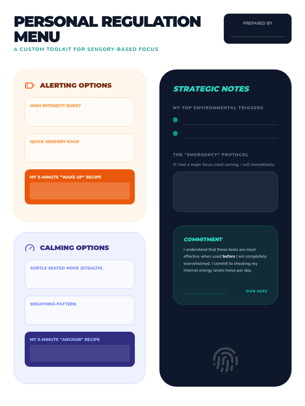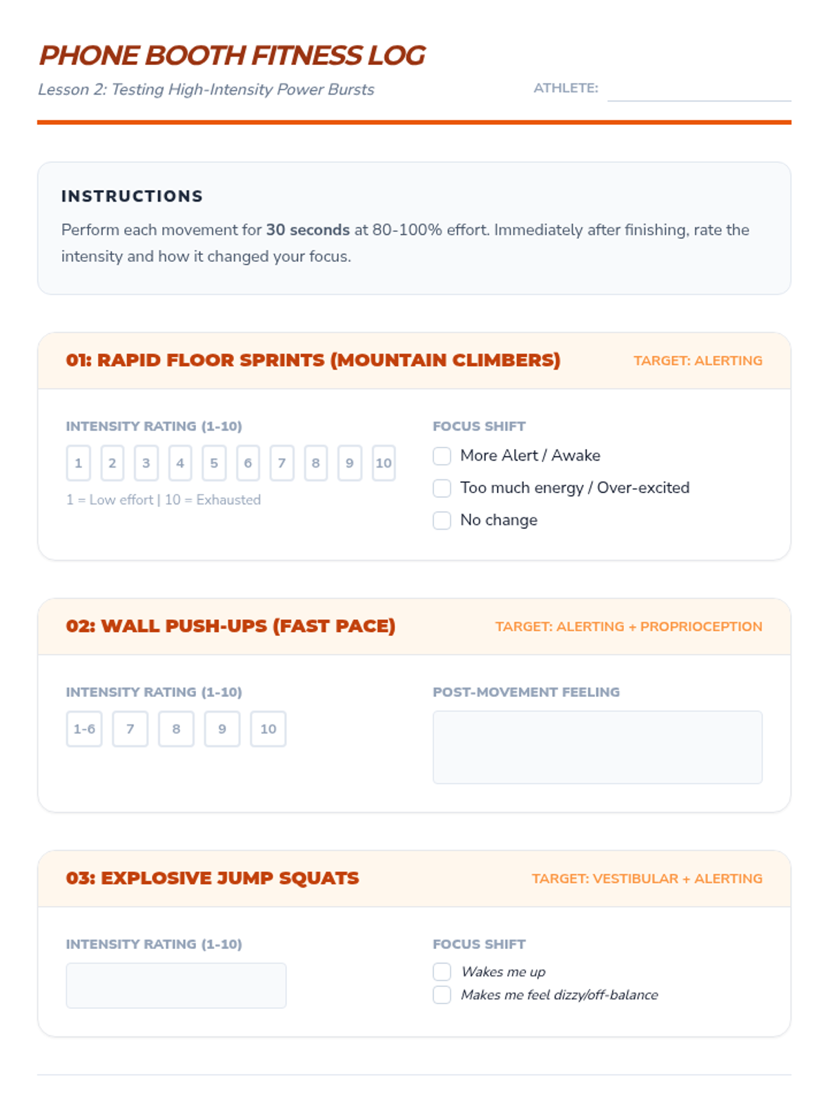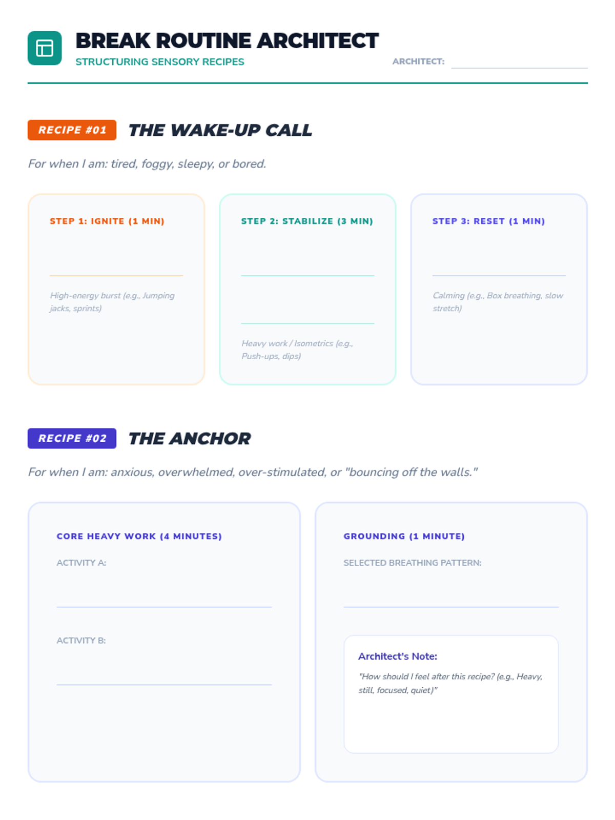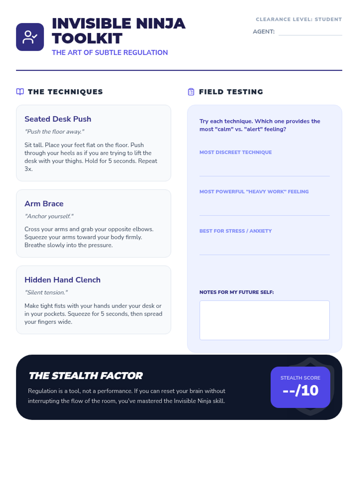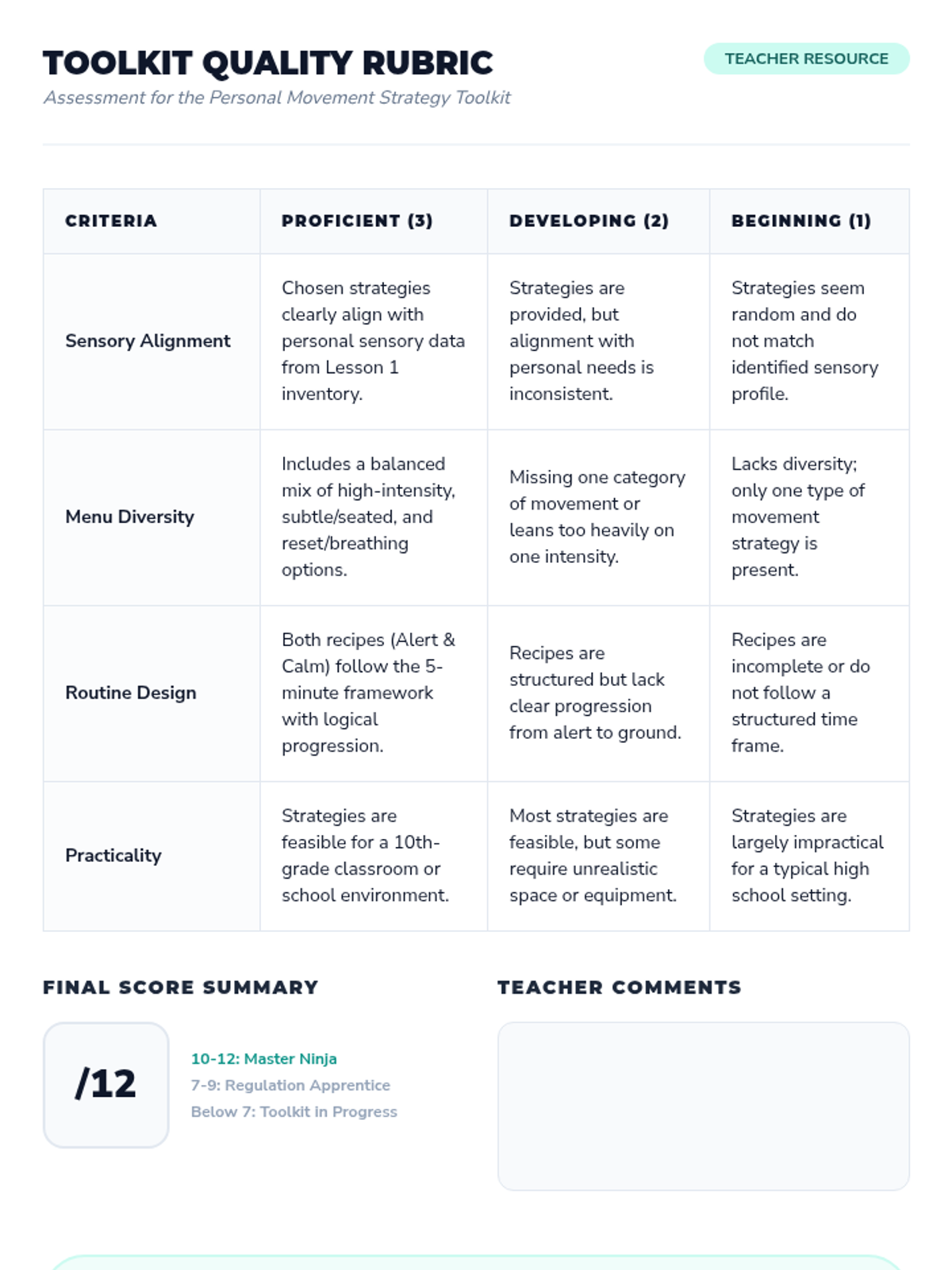 A workshop-style sequence for 10th-grade students to build a personalized library of movement regulation strategies. Students assess their sensory needs, test various movement intensities, and curate a physical or digital toolkit for immediate use in academic settings.