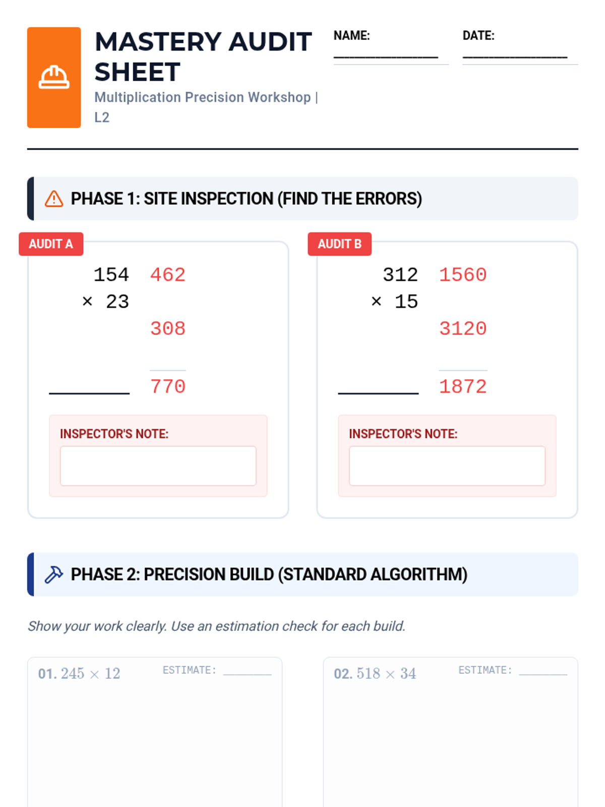 A four-day intensive unit on decomposing rectilinear figures to find total area, progressing from basic strategies to complex real-world architectural challenges. Students act as 'Blueprint Builders' to master vertical cuts, horizontal cuts, and additive/subtractive methods.
