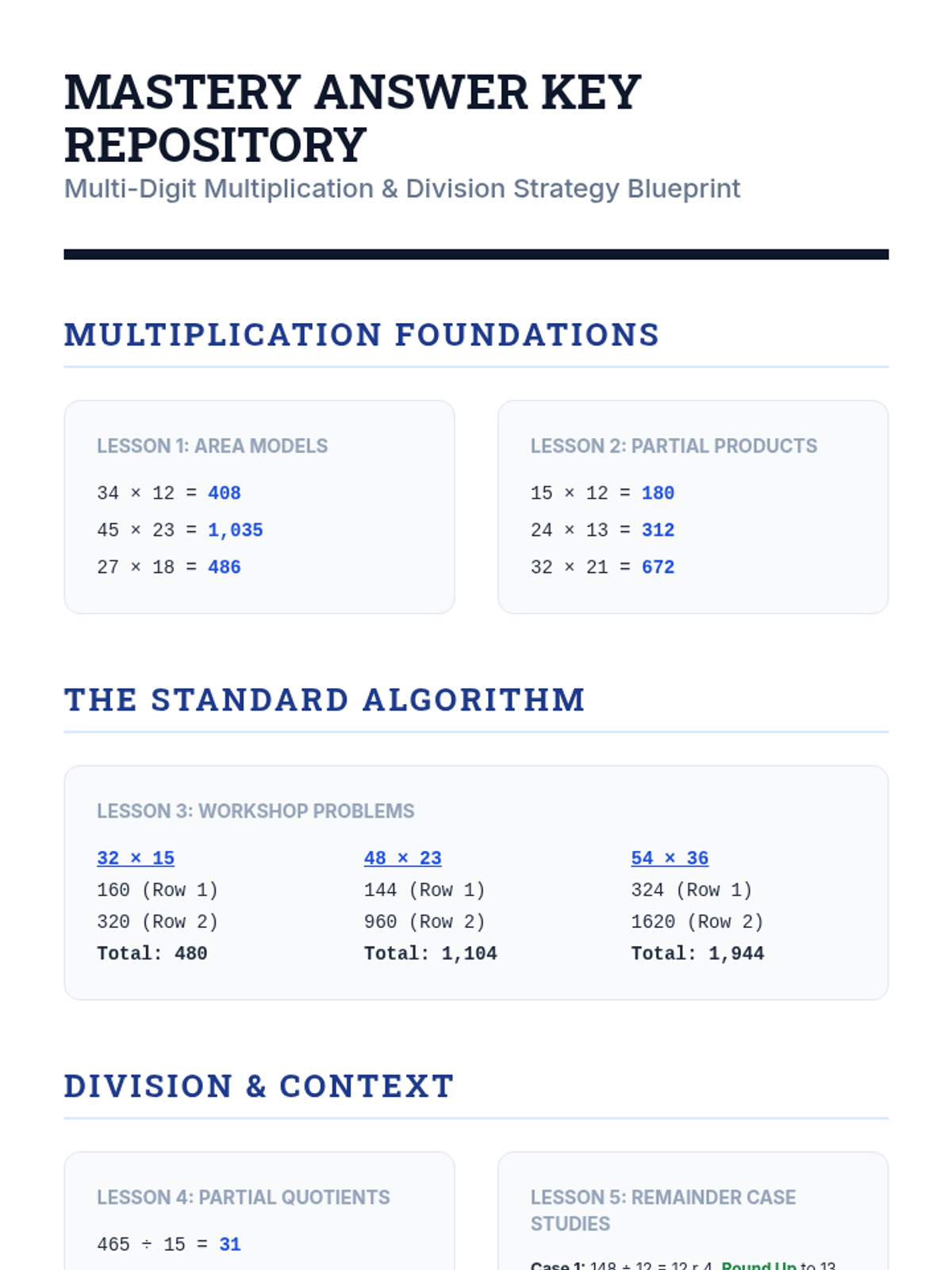 A comprehensive 5th-grade sequence focused on transitioning from conceptual area models and partial operations to the standard algorithms for multi-digit multiplication and division, utilizing the Concrete-Representational-Abstract (CRA) framework.