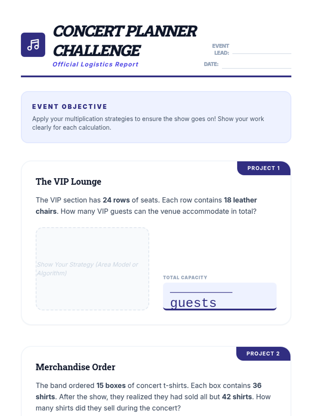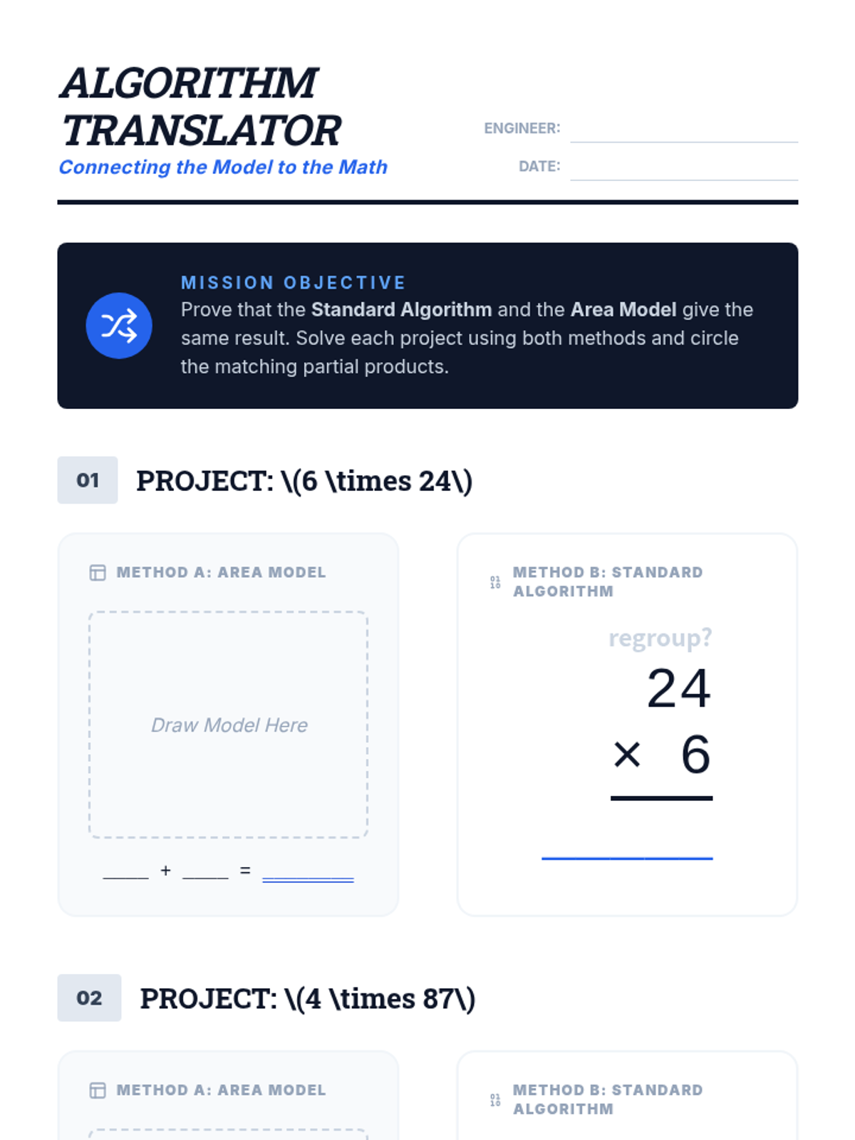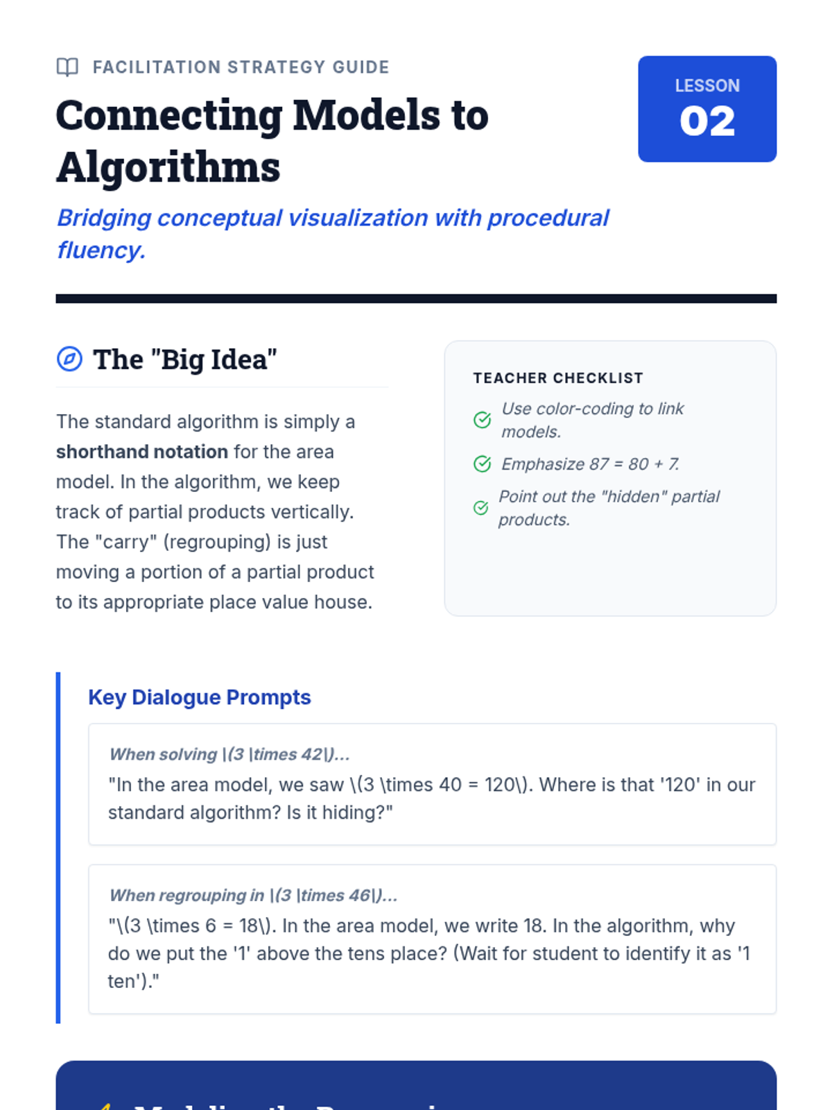 A 3-day math unit focused on multi-digit multiplication and division using visual strategies like area models and partial quotients, transitioning into standard algorithms. Includes scaffolds for diverse learners.