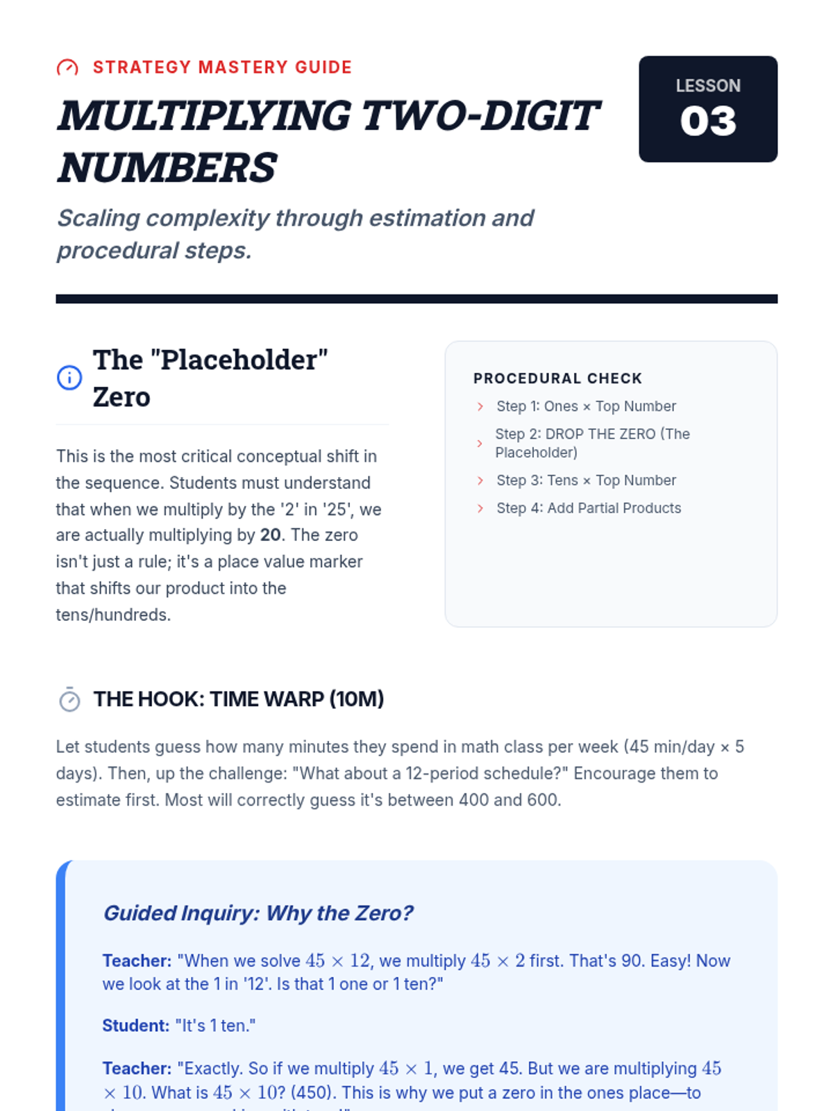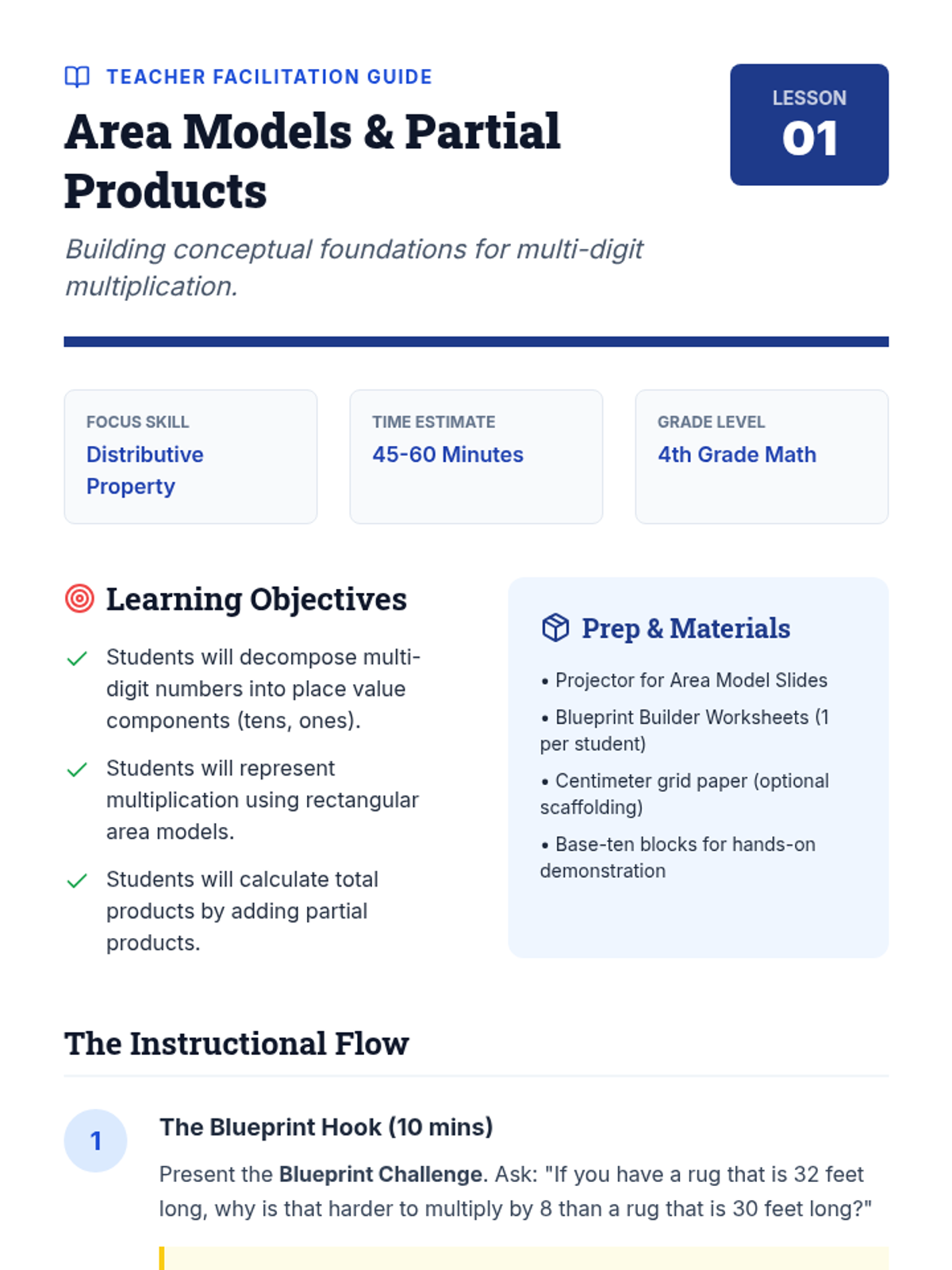 A 5-lesson sequence for 4th-grade students focusing on multi-digit multiplication strategies, transitioning from visual area models to the standard algorithm, with an emphasis on place value reasoning and real-world application.