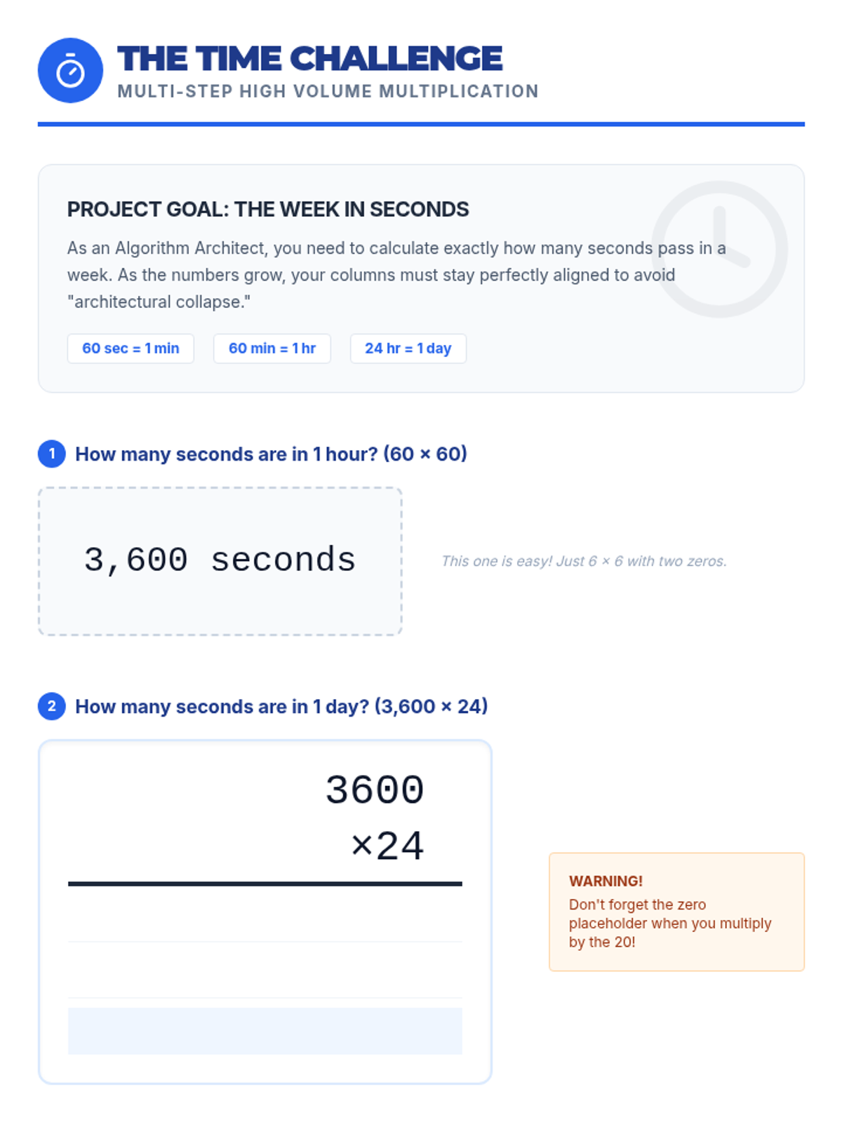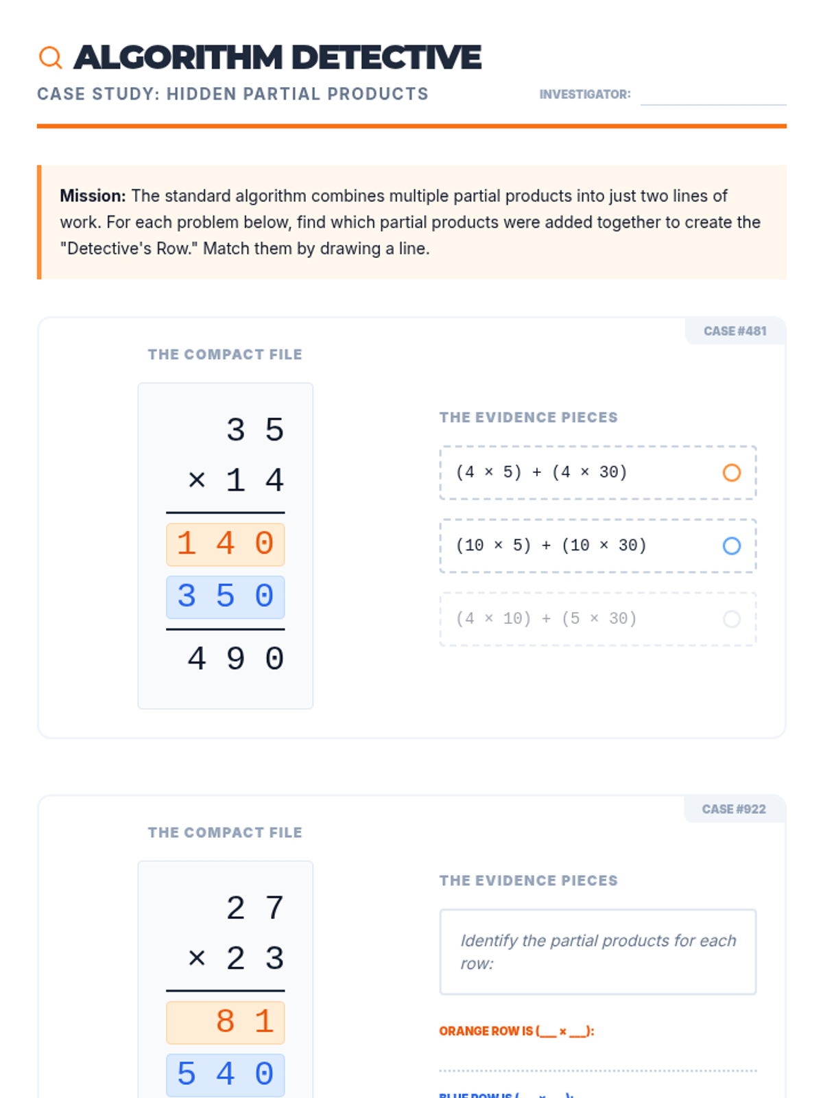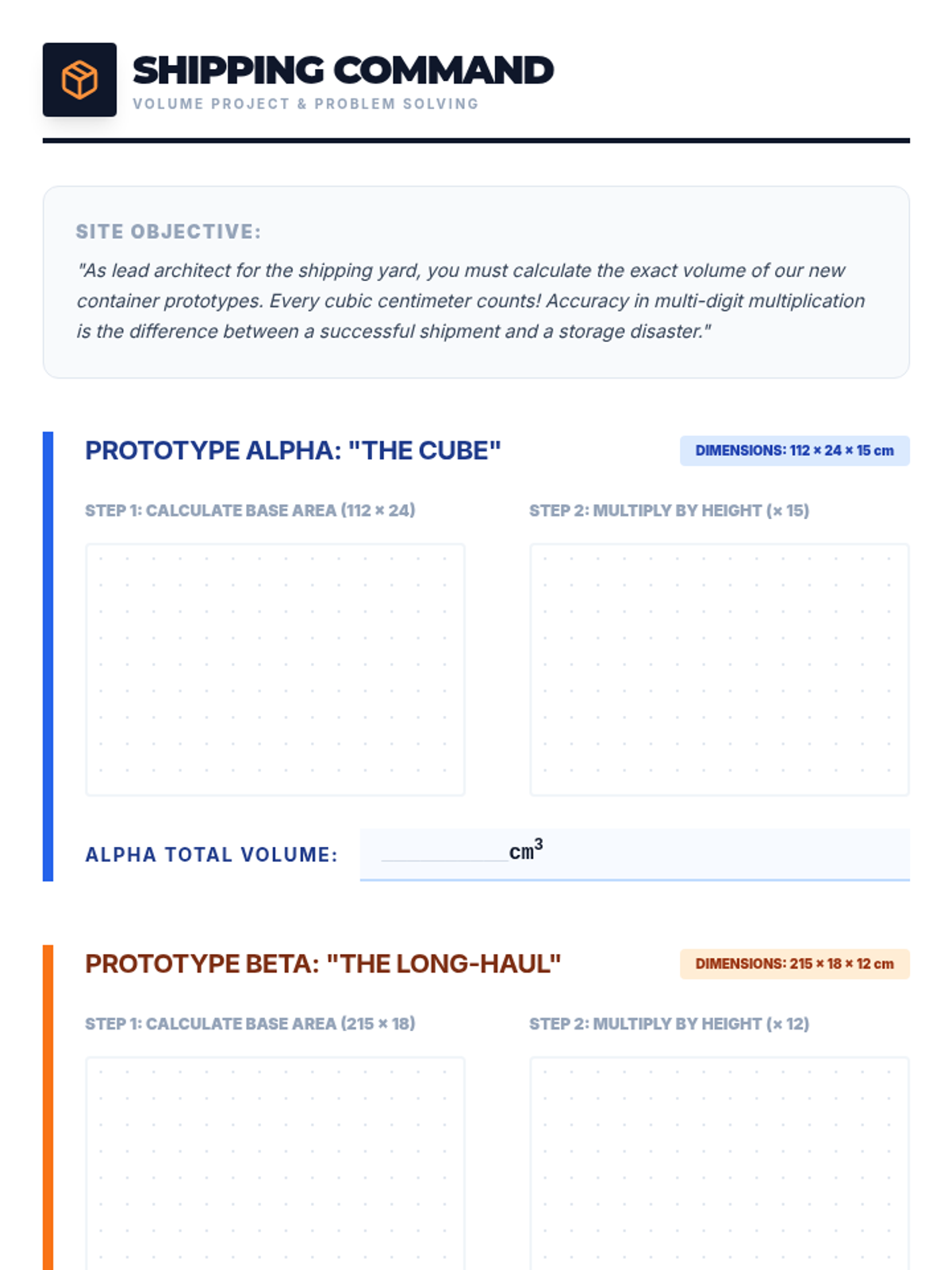This sequence guides 5th-grade students from conceptual understanding of multiplication using area models and partial products to procedural fluency with the standard algorithm. Students will explore 3-digit by 2-digit multiplication, perform error analysis, and apply their skills to real-world volume and area problems.