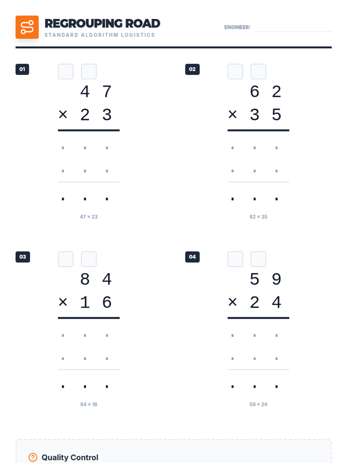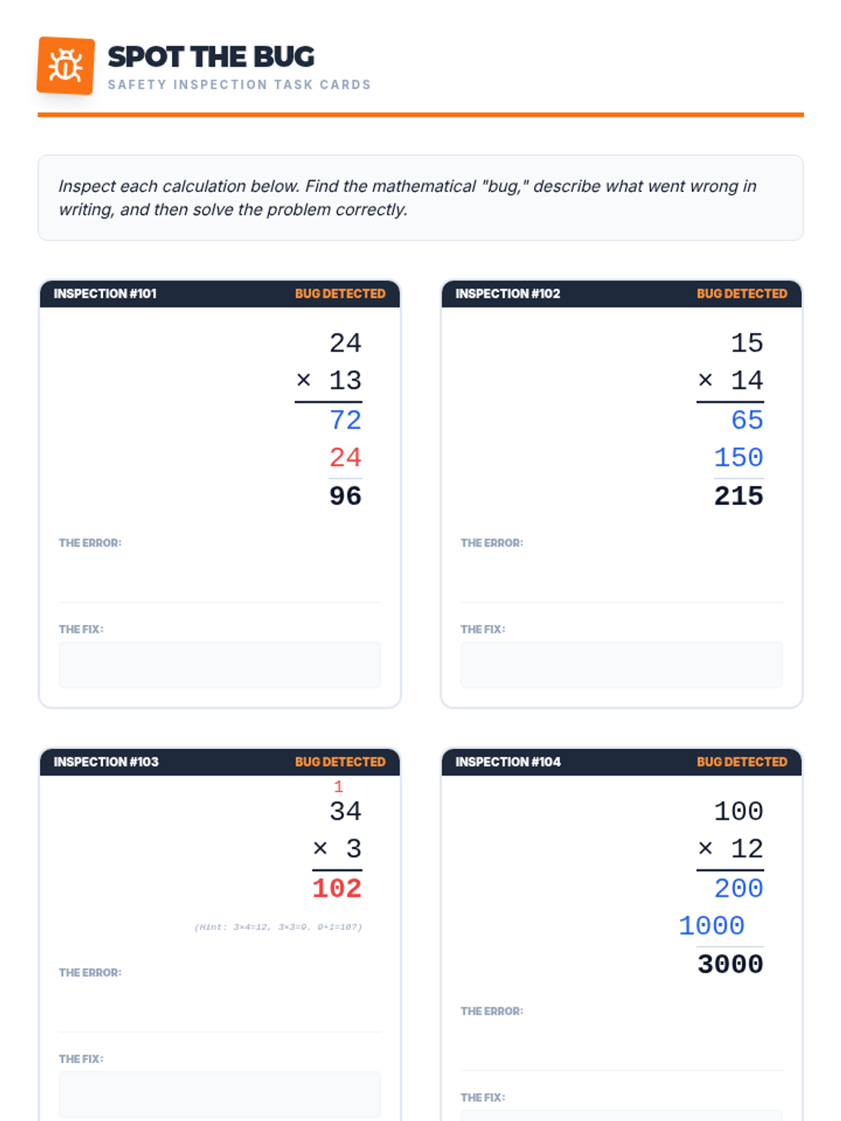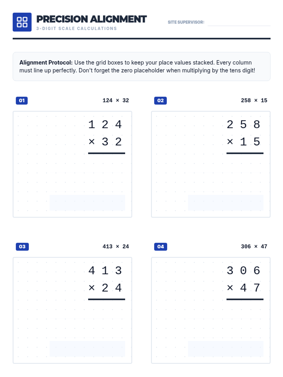 This sequence guides 5th-grade students from conceptual understanding of multiplication using area models and partial products to procedural fluency with the standard algorithm. Students will explore 3-digit by 2-digit multiplication, perform error analysis, and apply their skills to real-world volume and area problems.
