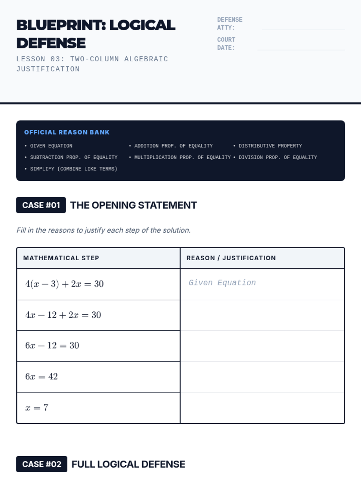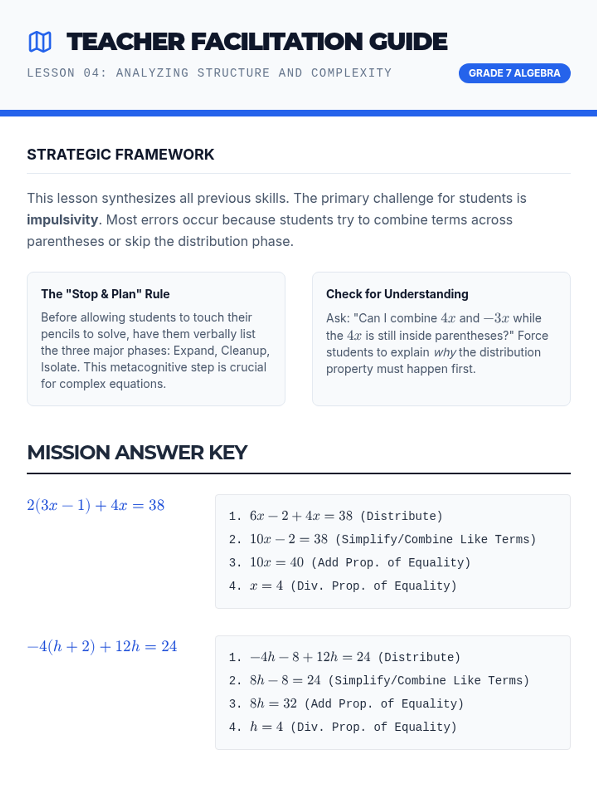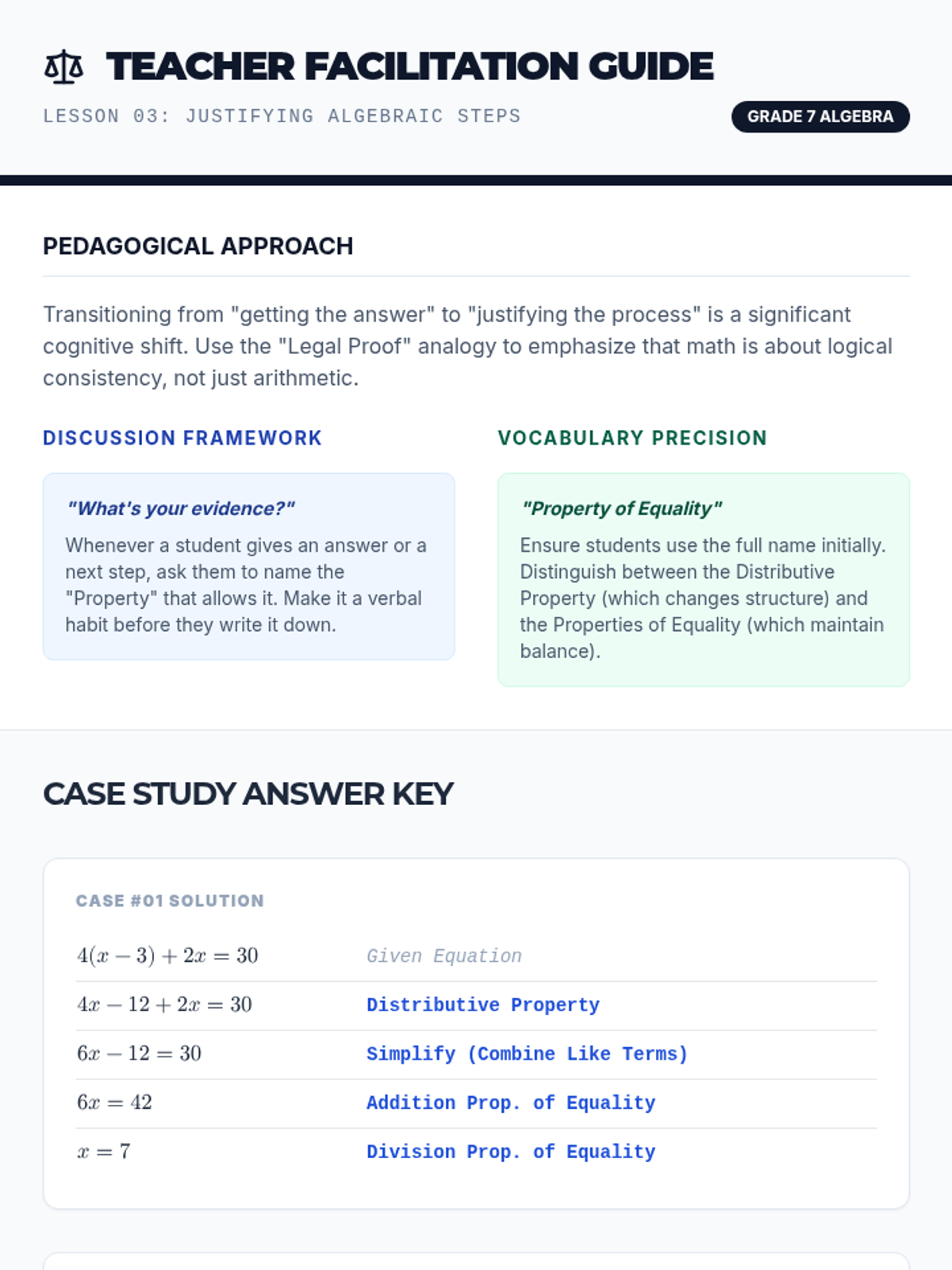 A comprehensive 7th-grade algebra sequence focusing on the logical reasoning behind solving multi-step equations, from distributive property to full algebraic justification and error analysis.