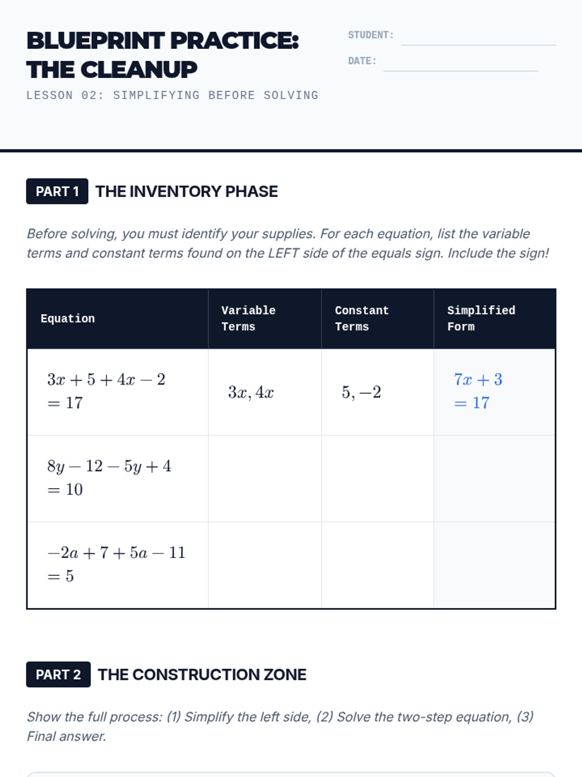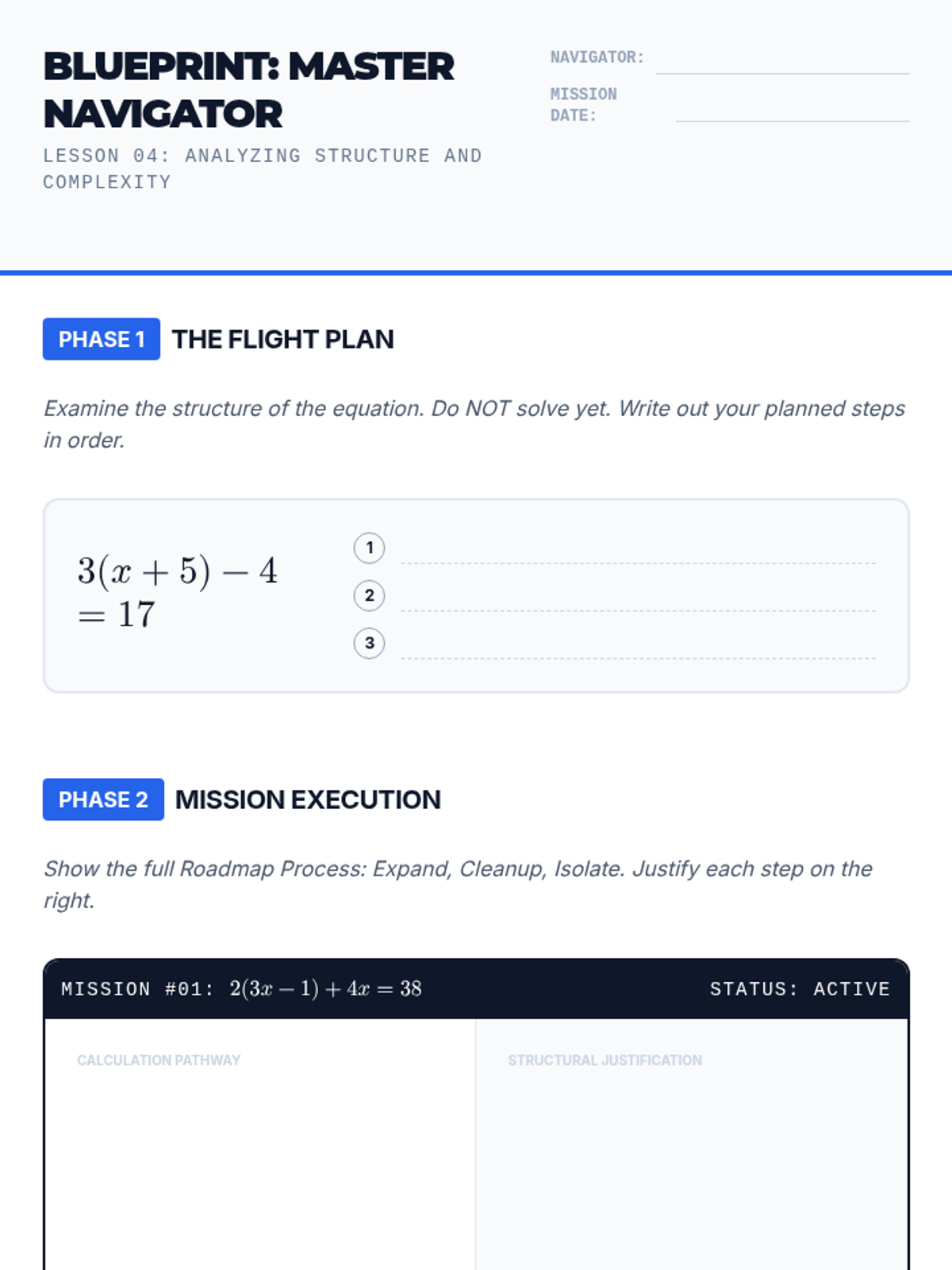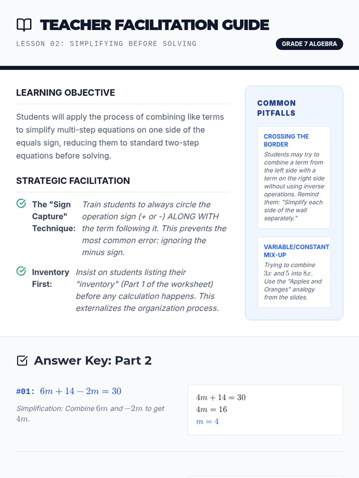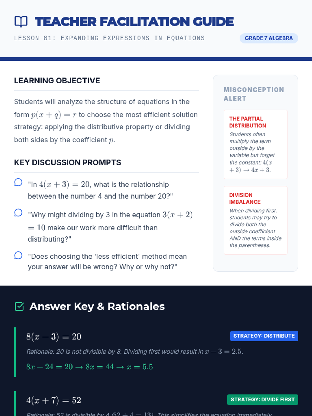 A comprehensive 7th-grade algebra sequence focusing on the logical reasoning behind solving multi-step equations, from distributive property to full algebraic justification and error analysis.