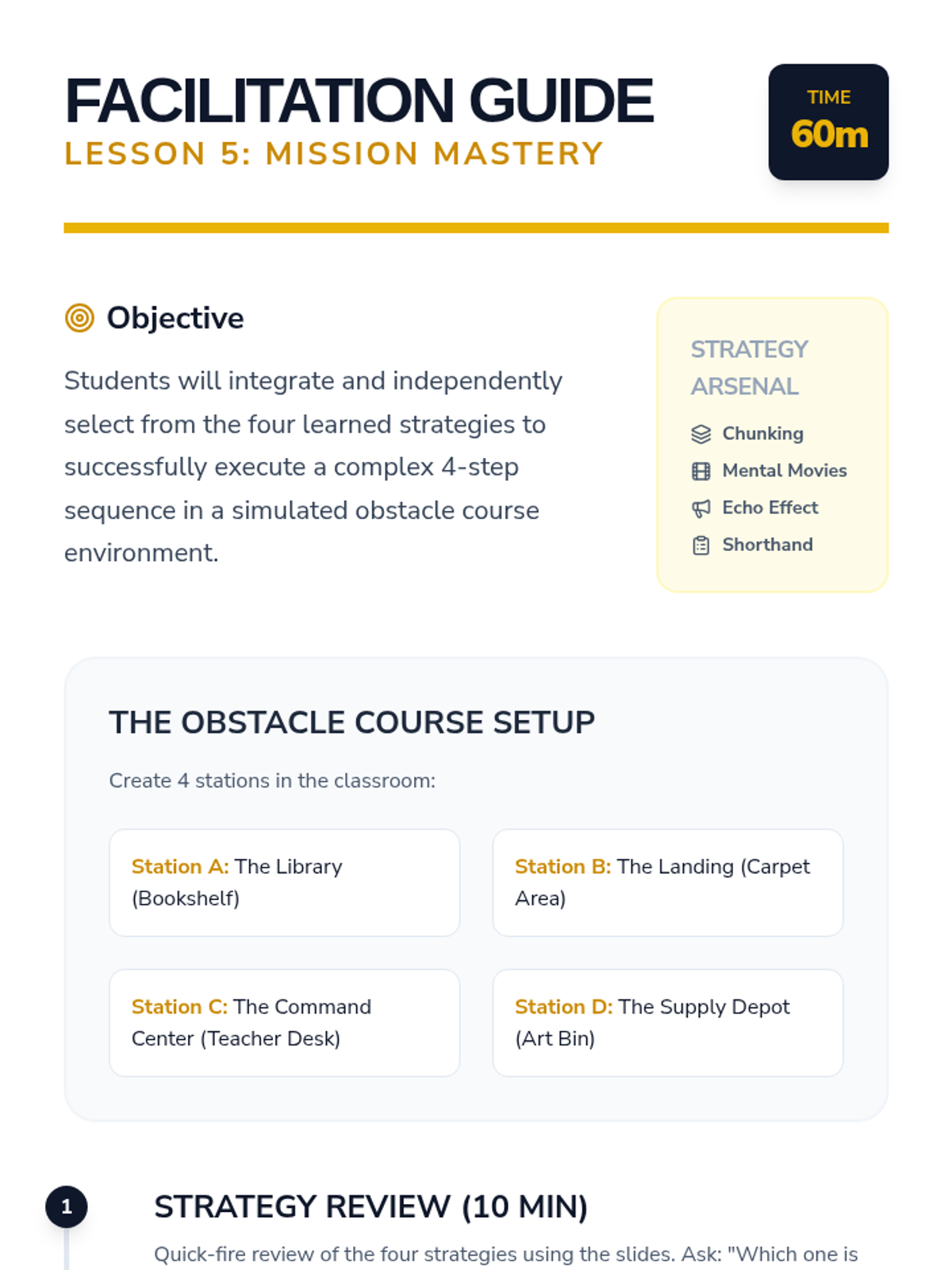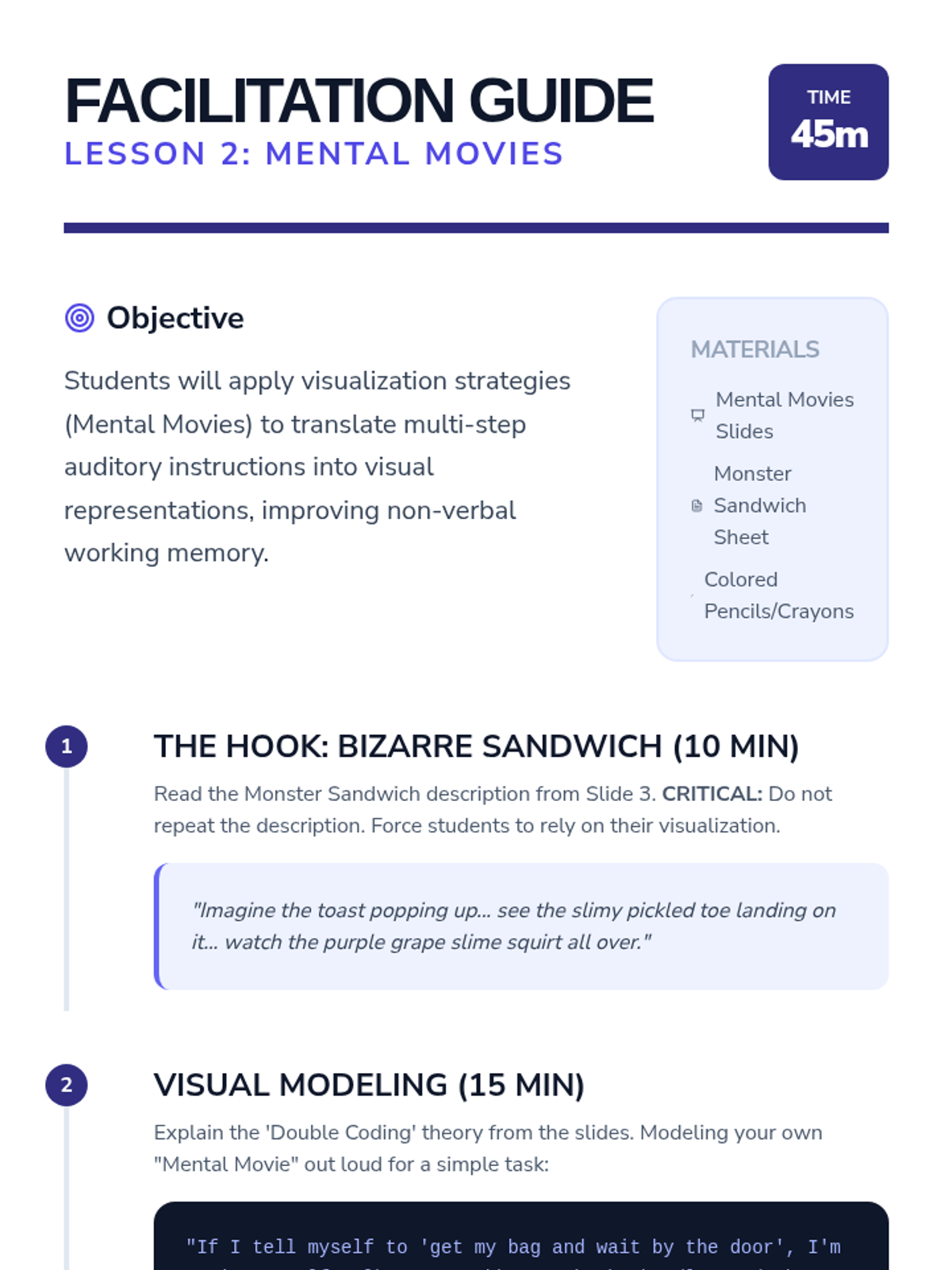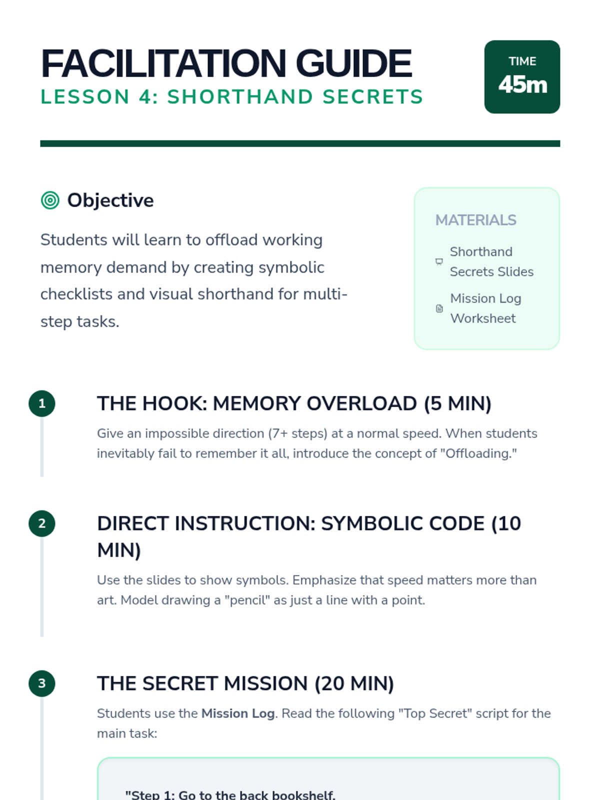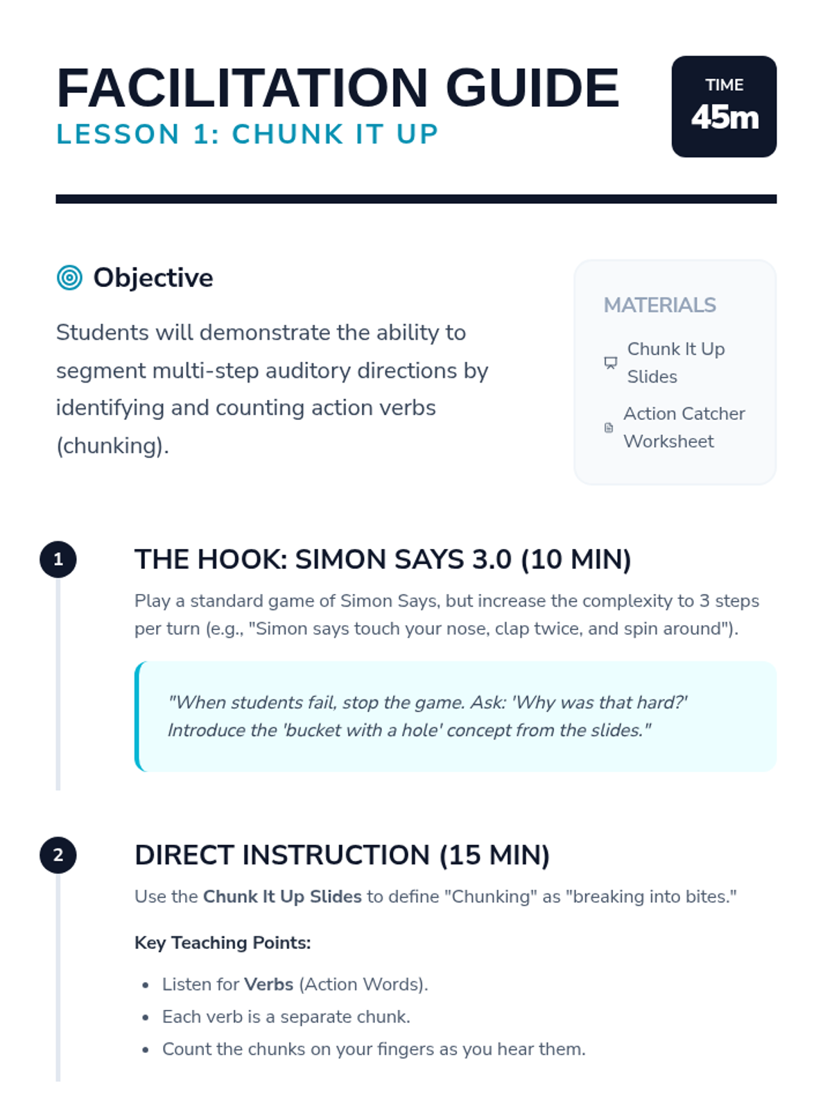 A specialized sequence for 3rd-grade students focused on developing executive functioning strategies to process and follow multi-step directions, addressing working memory deficits through chunking, visualization, and verbal rehearsal.