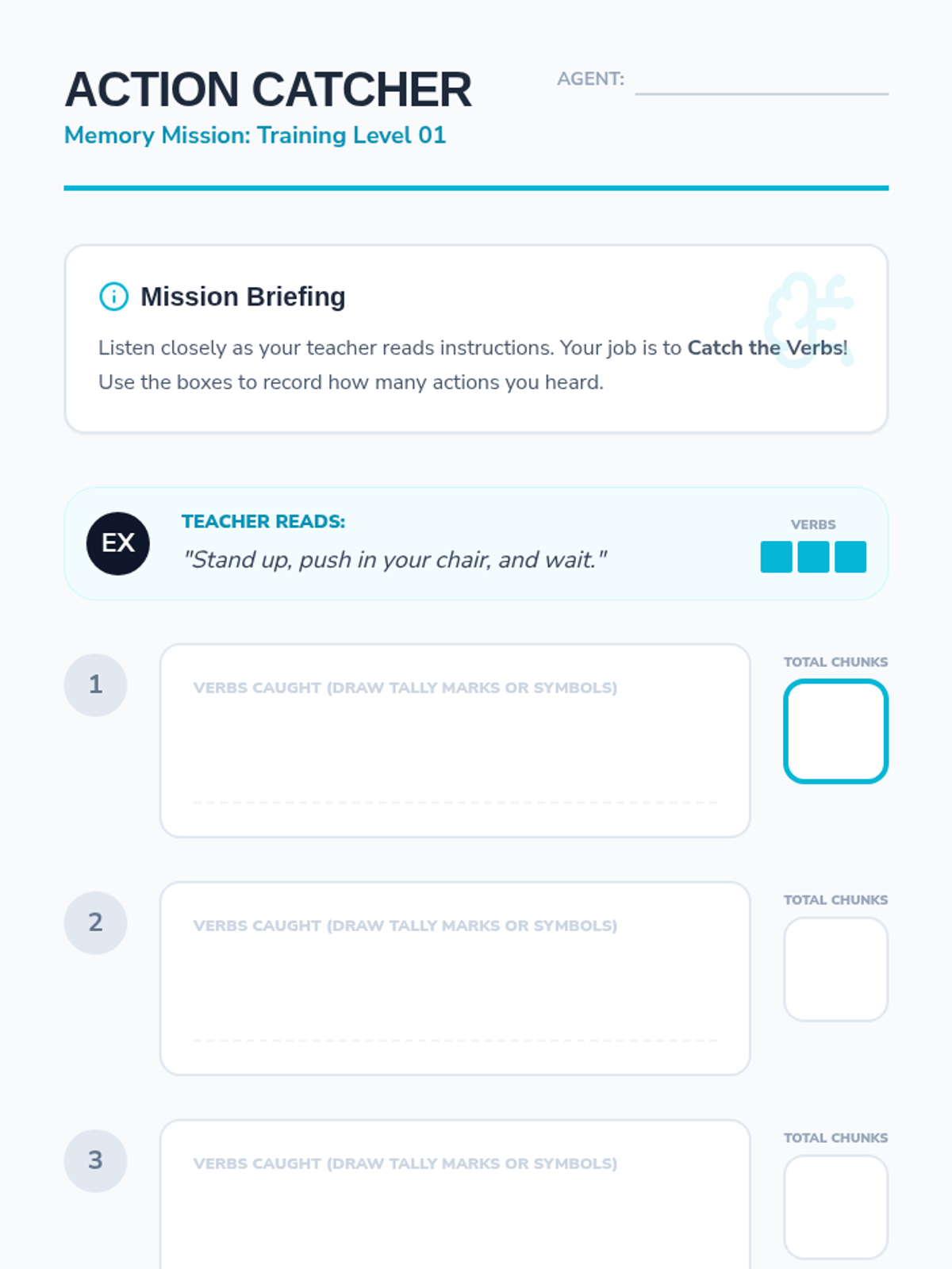 A comprehensive instructional unit focused on the foundational skill of following a multi-step task to completion. This unit provides two distinct tracks: a secret agent-themed track for older students (7-8) and a Danny Go! themed track for Pre-K students, ensuring developmental appropriateness while maintaining high engagement.