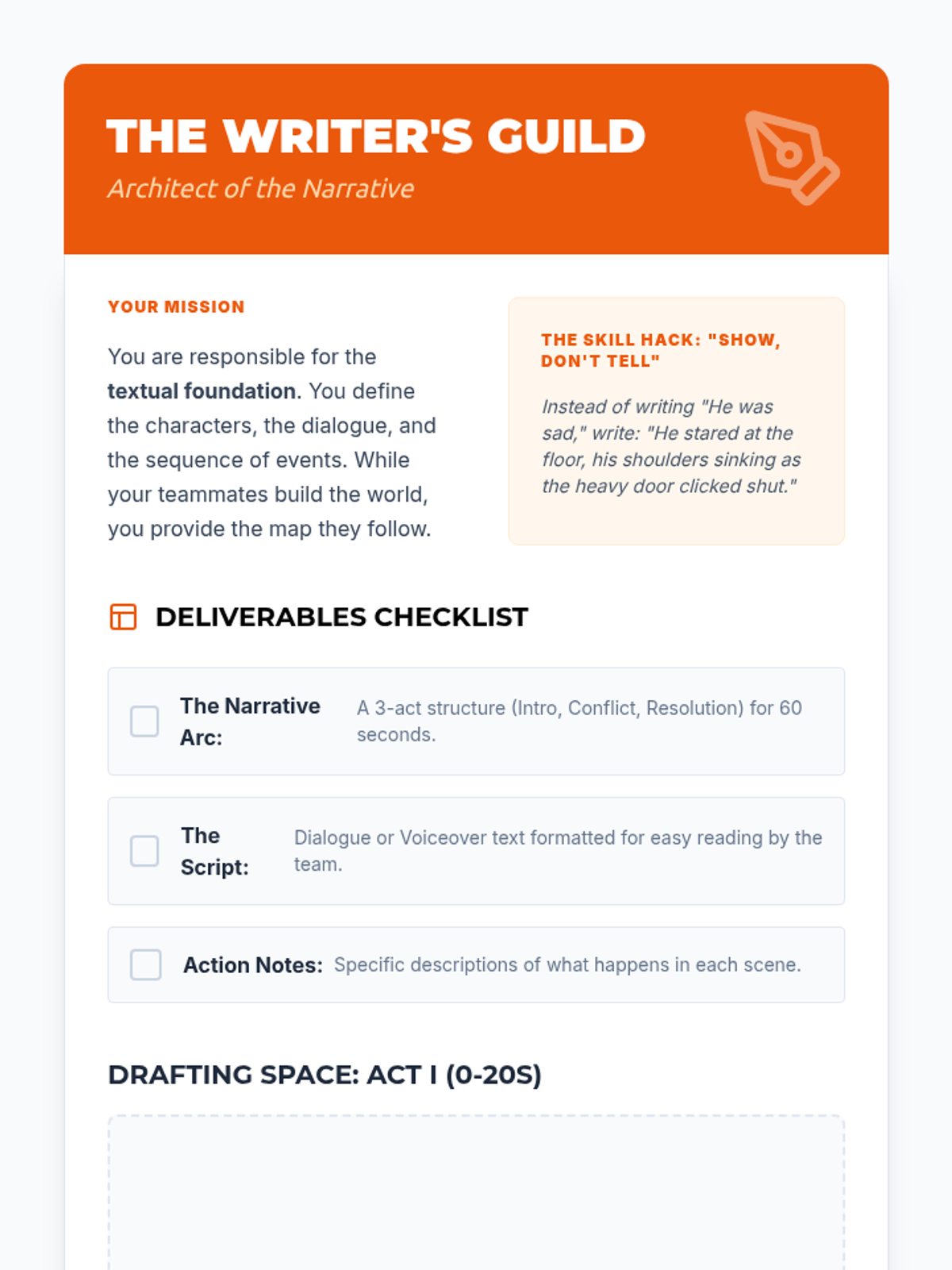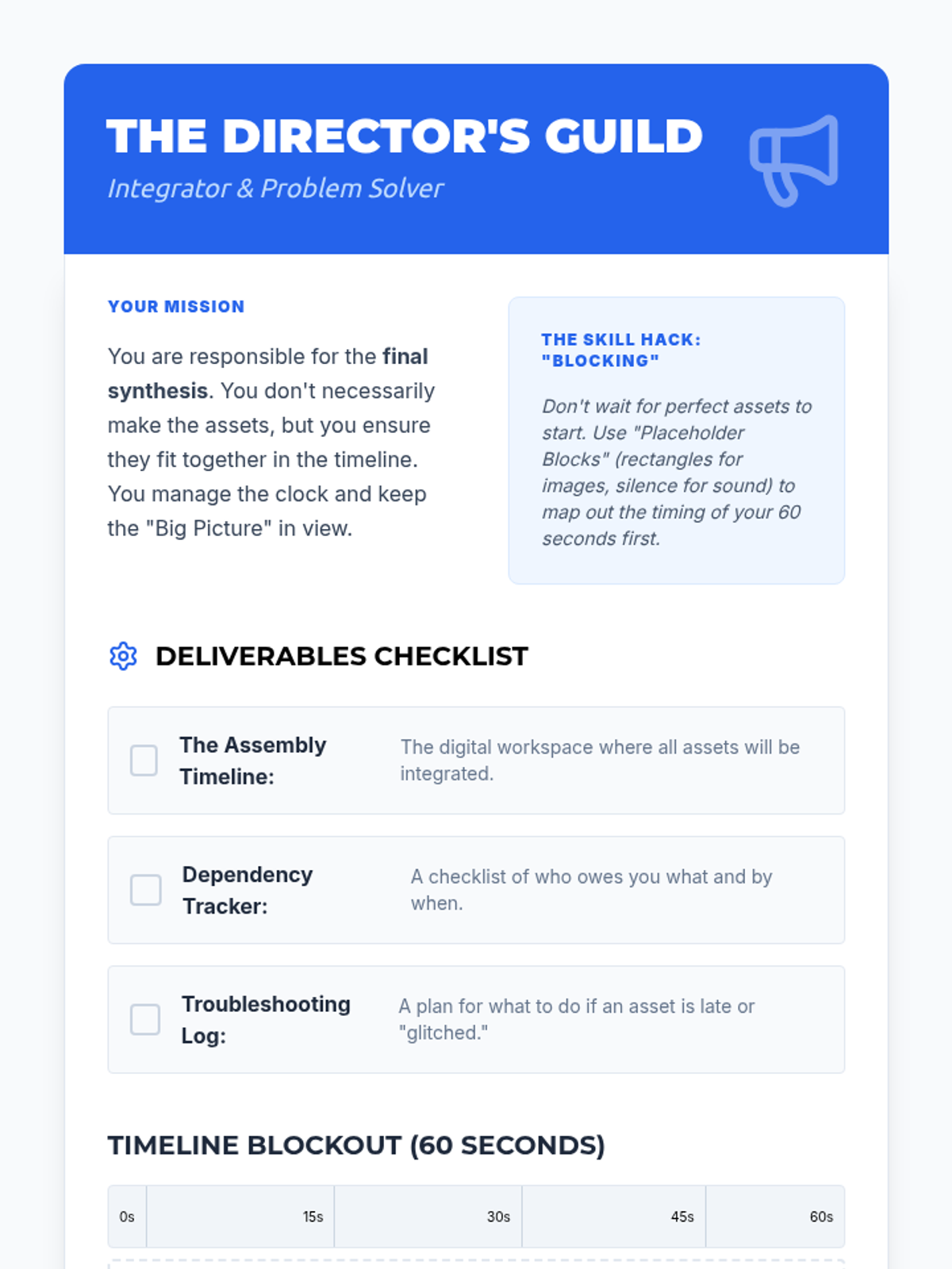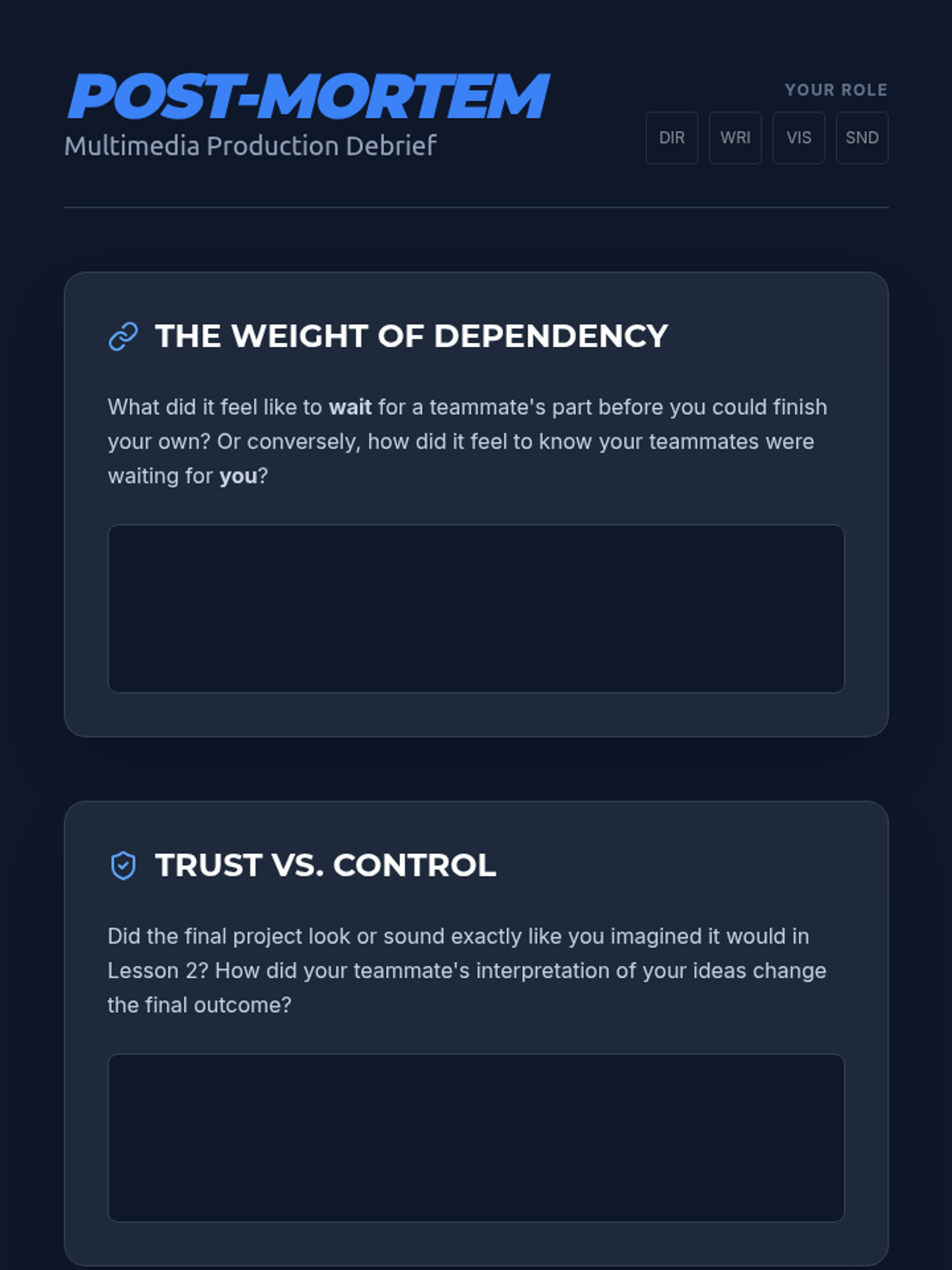 This sequence explores collaboration through the lens of specialized roles within a multimedia project. Students transition from generalists to specialists, learning how interdependence and trust between a Writer, Visual Artist, Sound Designer, and Director are essential for creating a cohesive digital narrative.