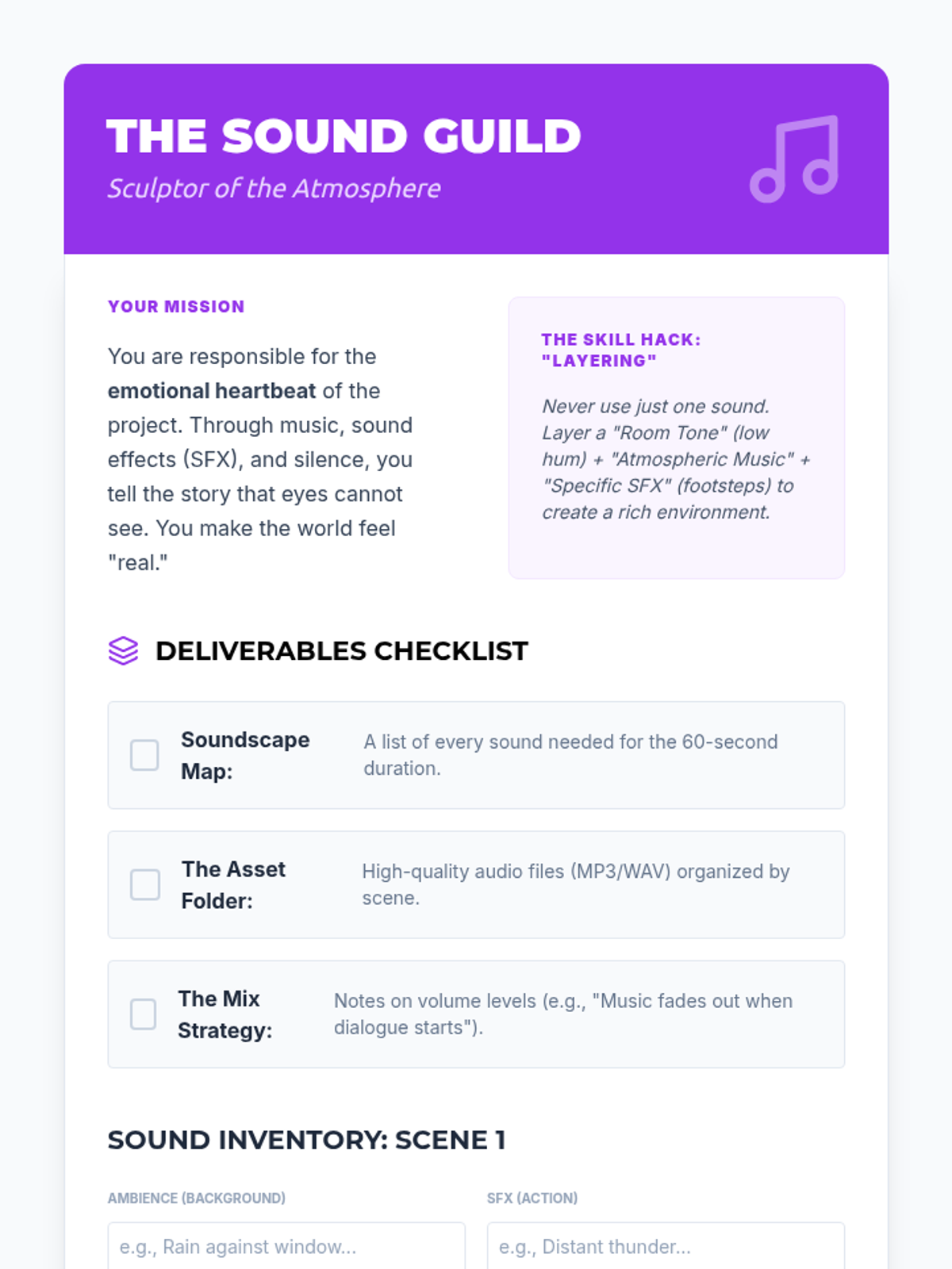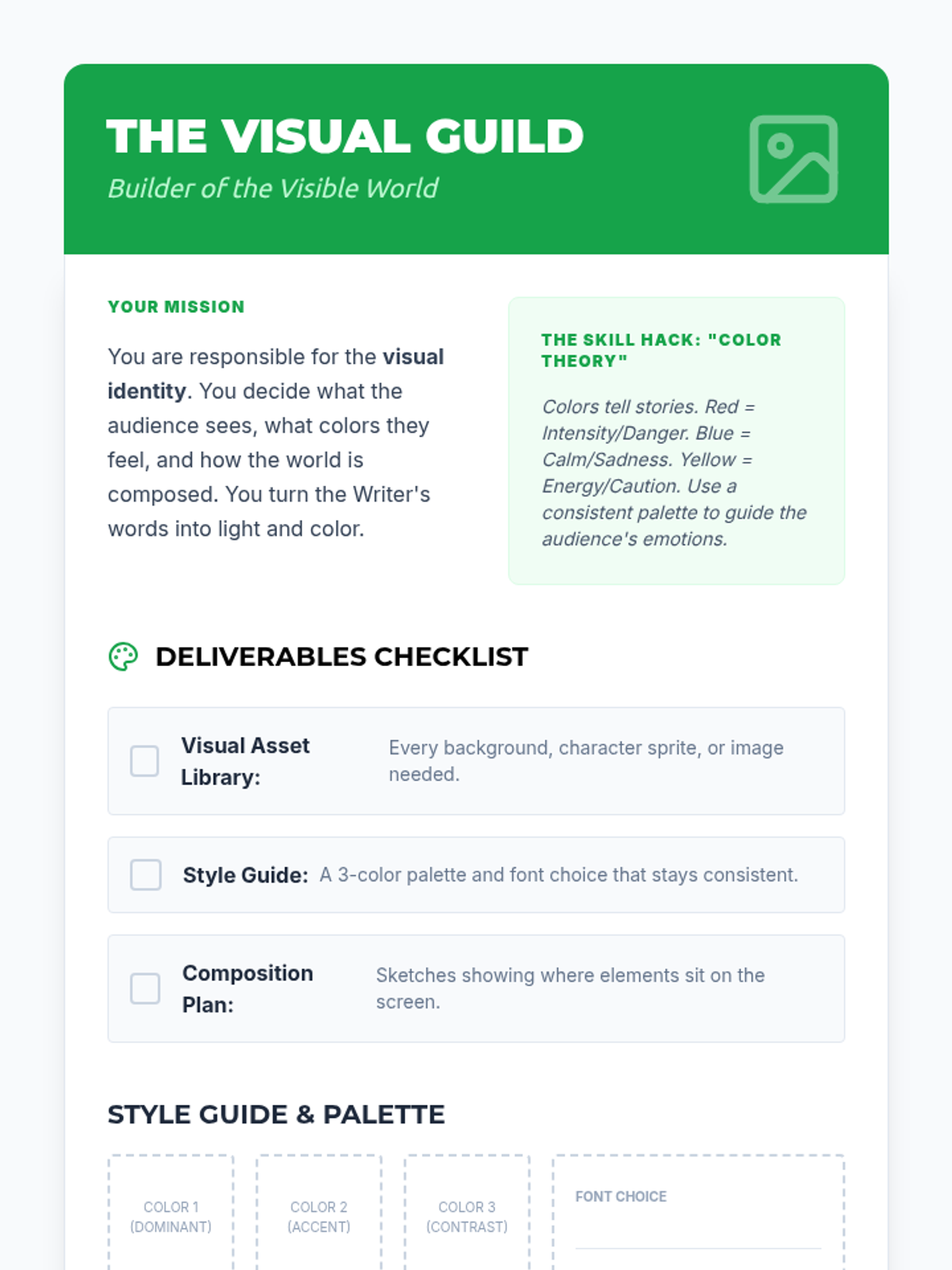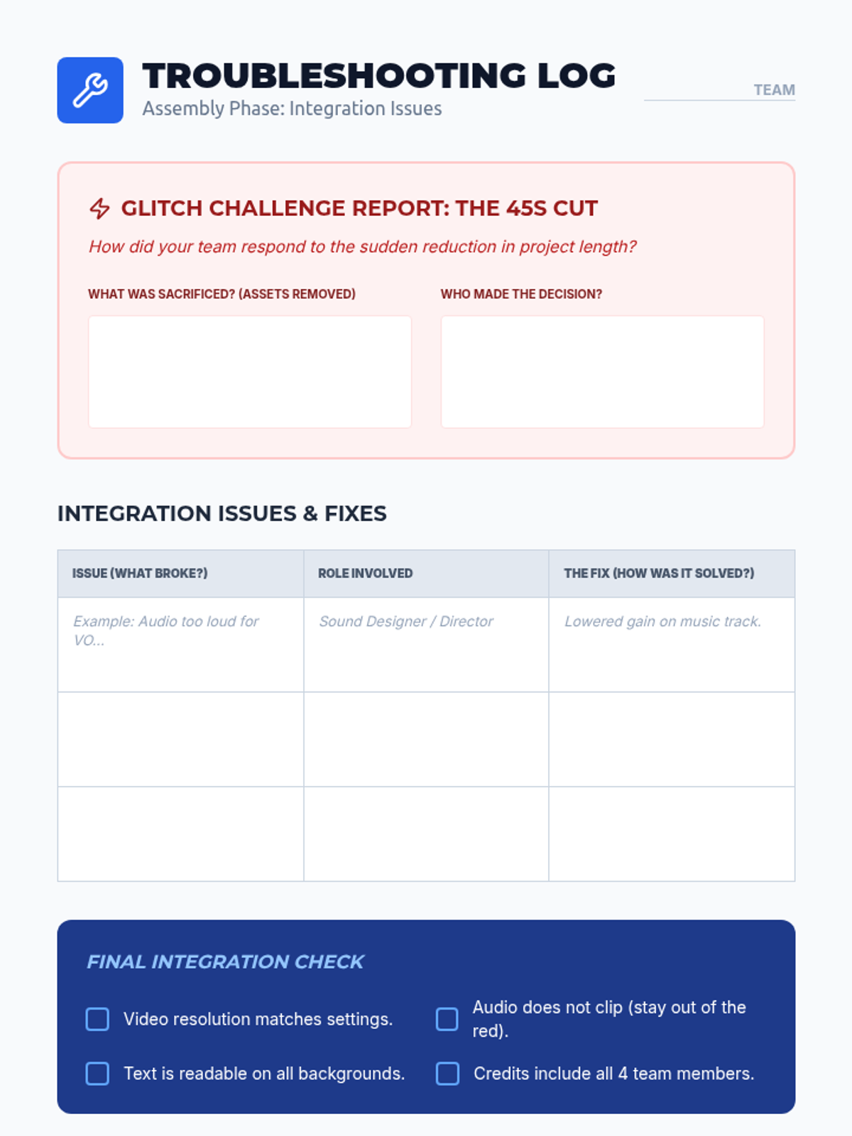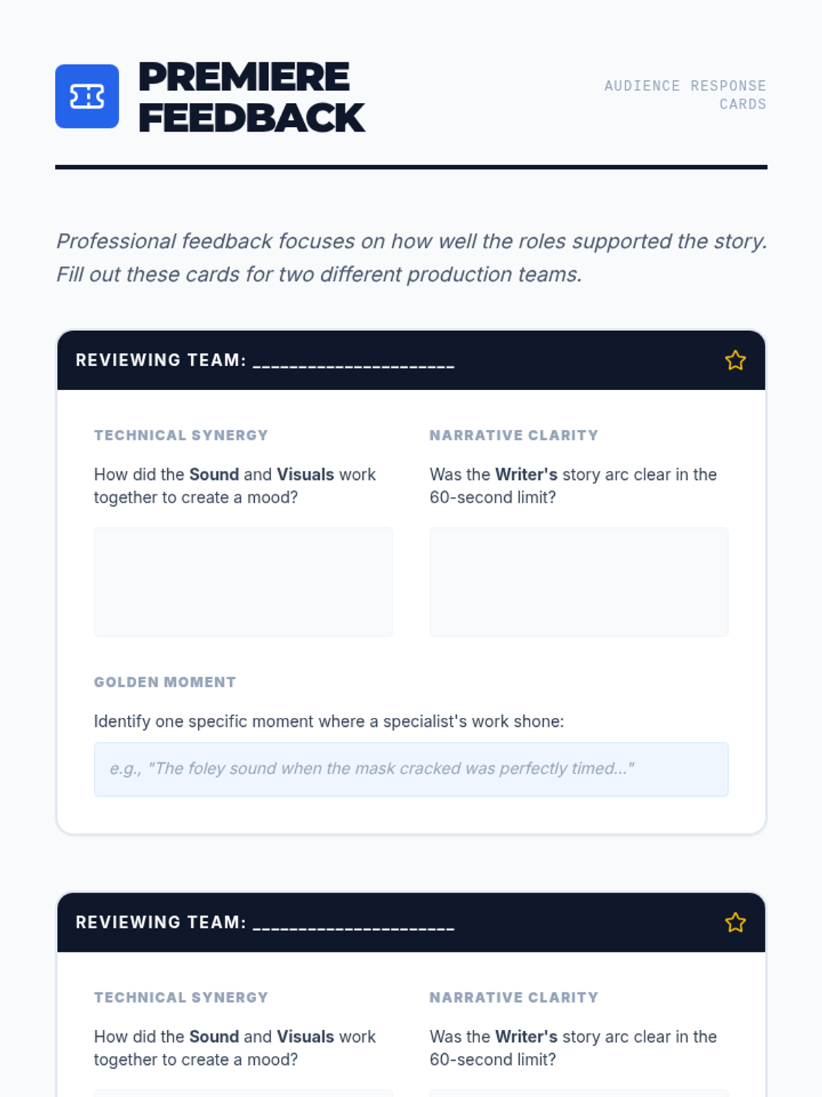 This sequence explores collaboration through the lens of specialized roles within a multimedia project. Students transition from generalists to specialists, learning how interdependence and trust between a Writer, Visual Artist, Sound Designer, and Director are essential for creating a cohesive digital narrative.