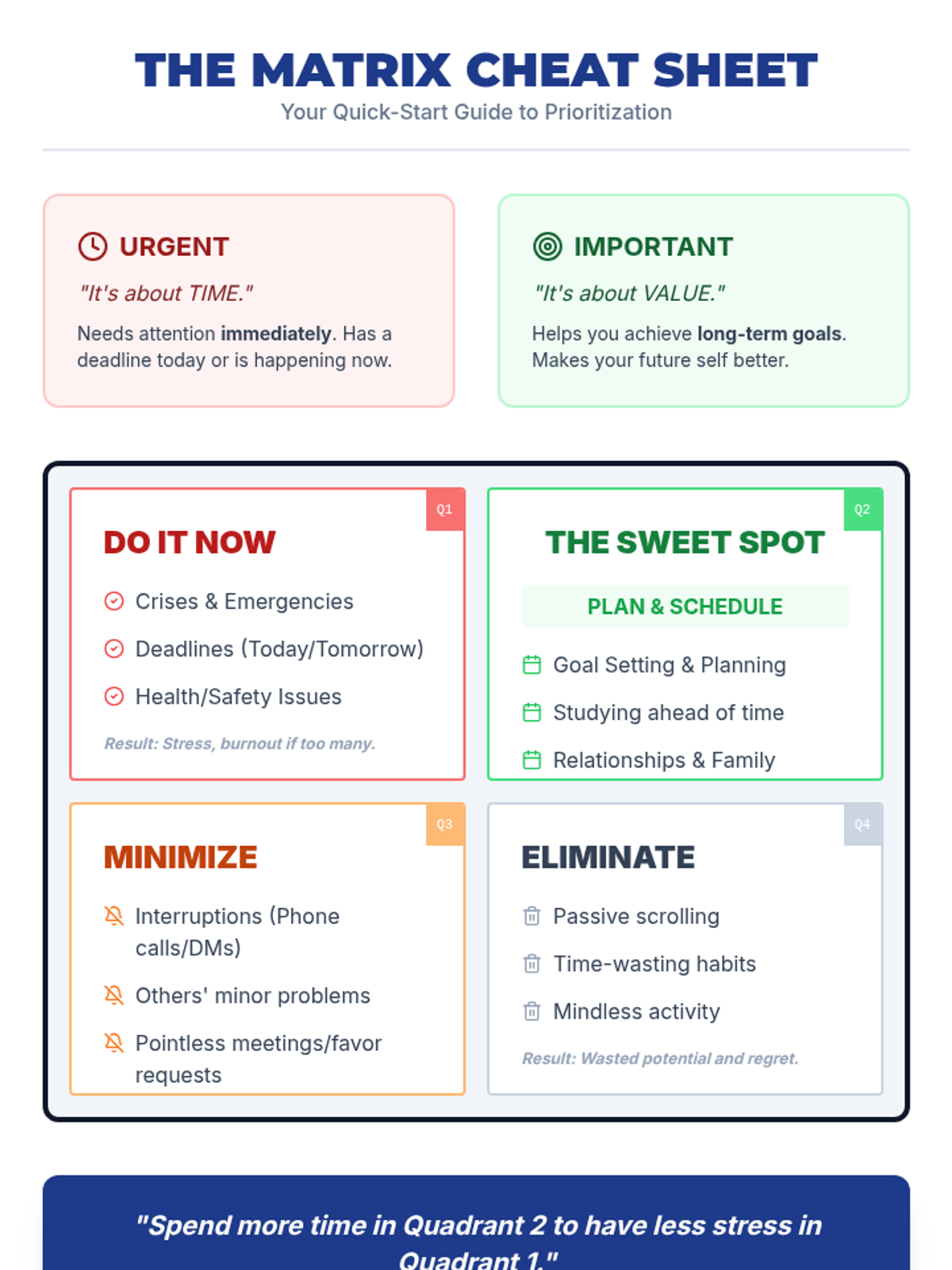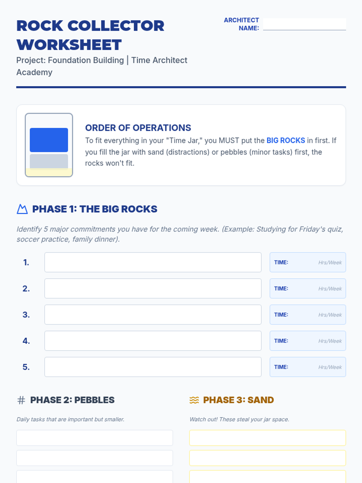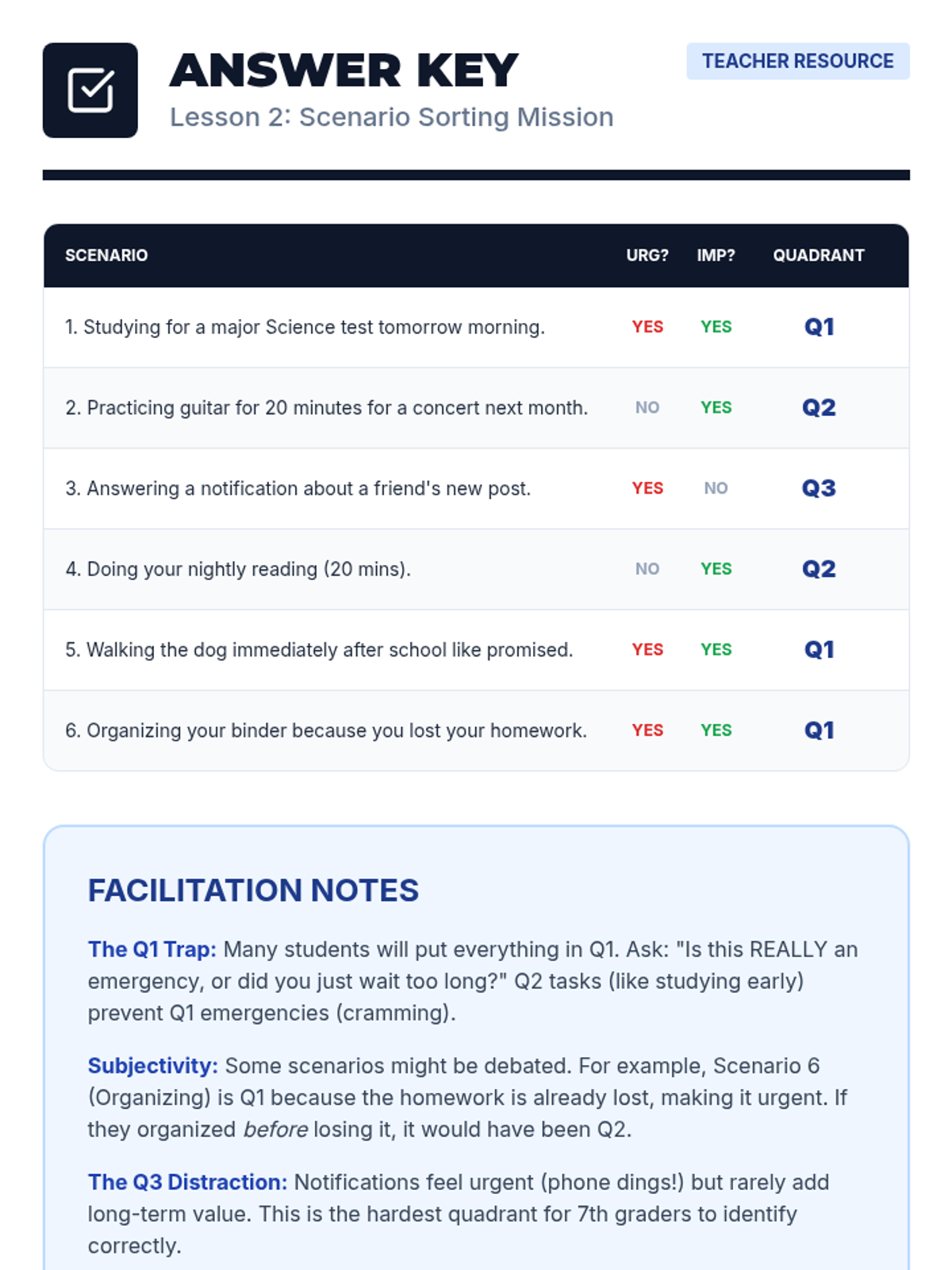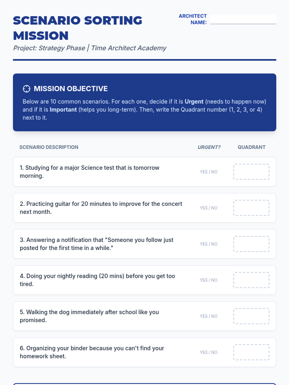 A 5-lesson sequence for 7th-grade students focused on strategic prioritization and time management. Students learn to use the Eisenhower Matrix, identify 'Big Rocks', and create sustainable weekly schedules through a 'Time Architect' theme.
