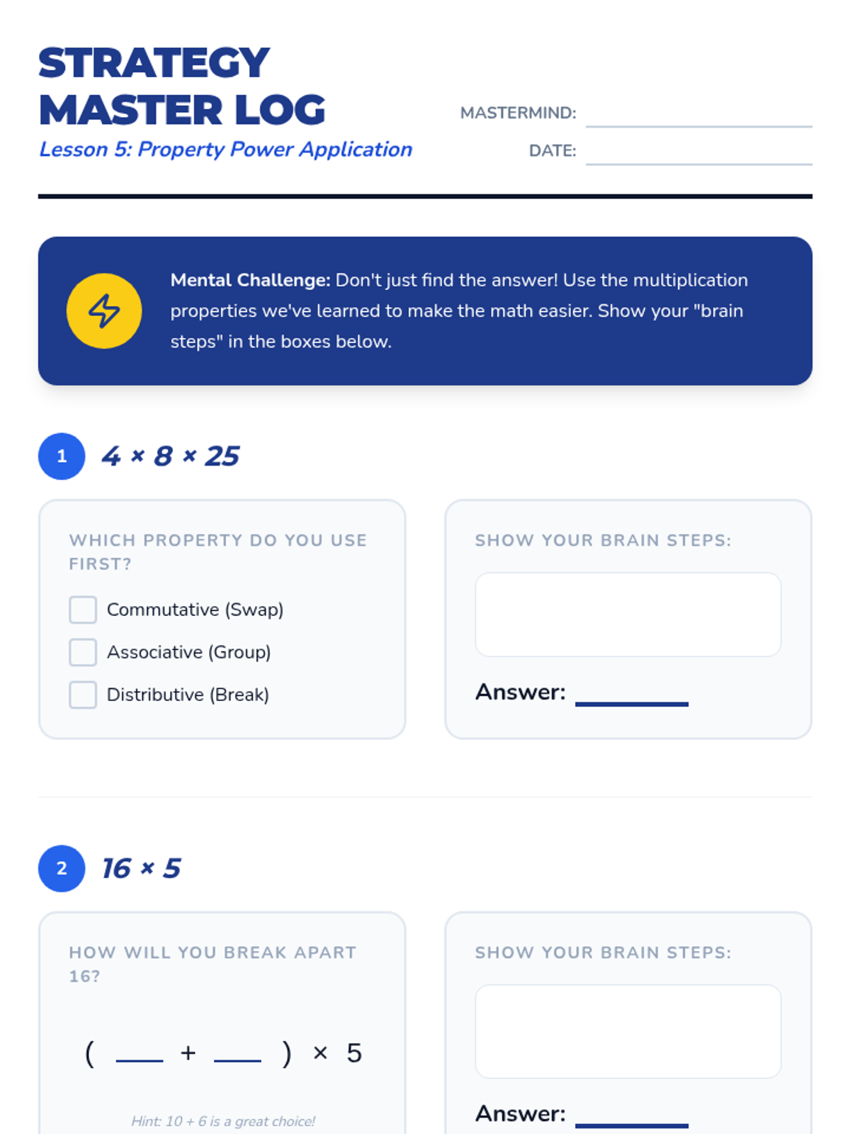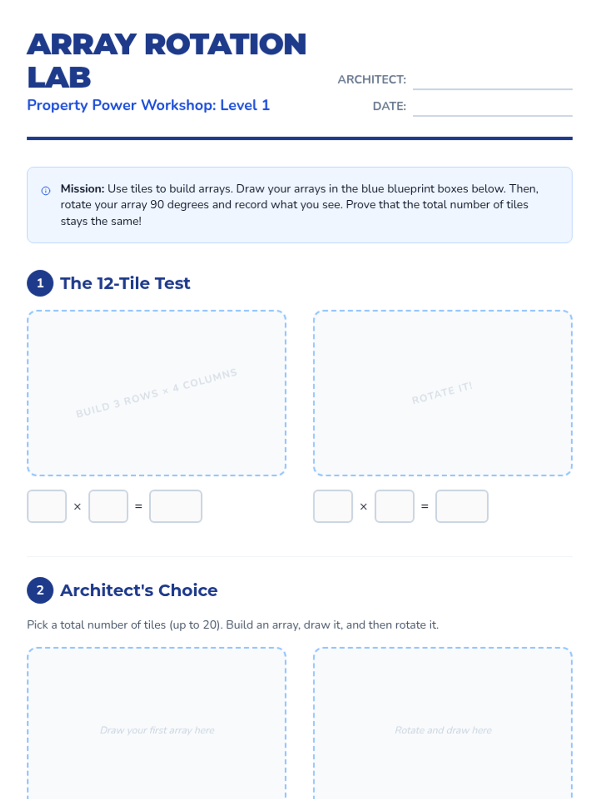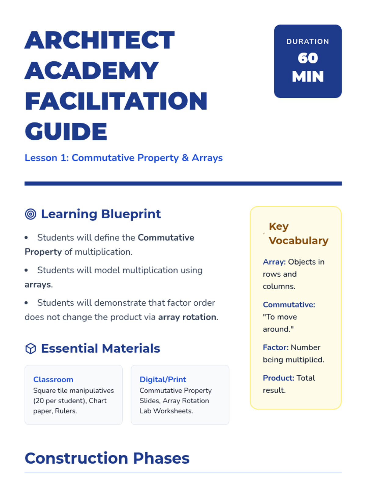 A multiplication sequence focused on the distributive property and area model strategies for multi-digit multiplication, using a construction blueprint theme.
