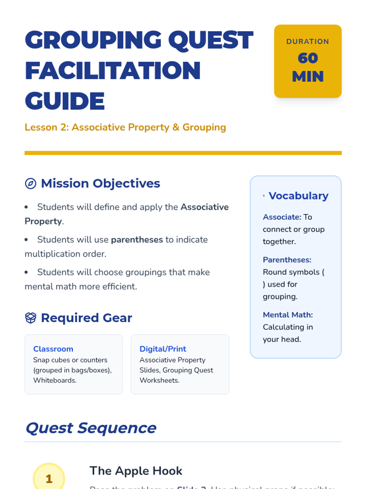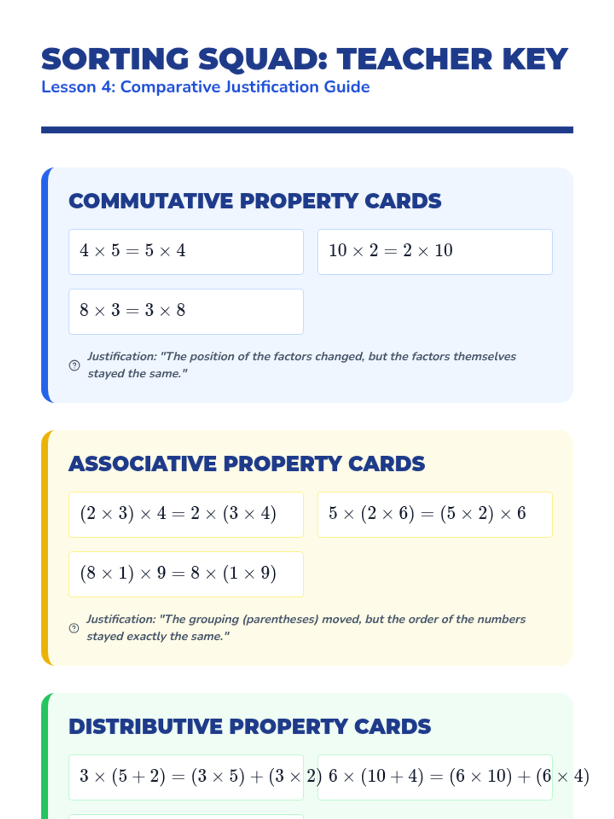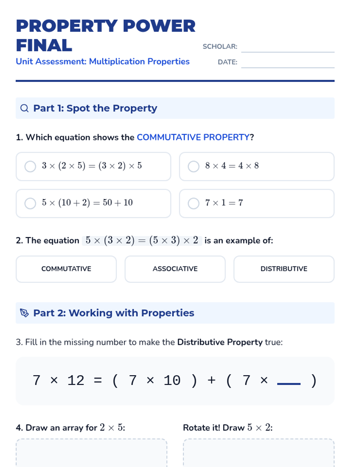 A 5-lesson sequence for 3rd Grade students exploring the commutative, associative, and distributive properties of multiplication using visual models, arrays, and mental math strategies.