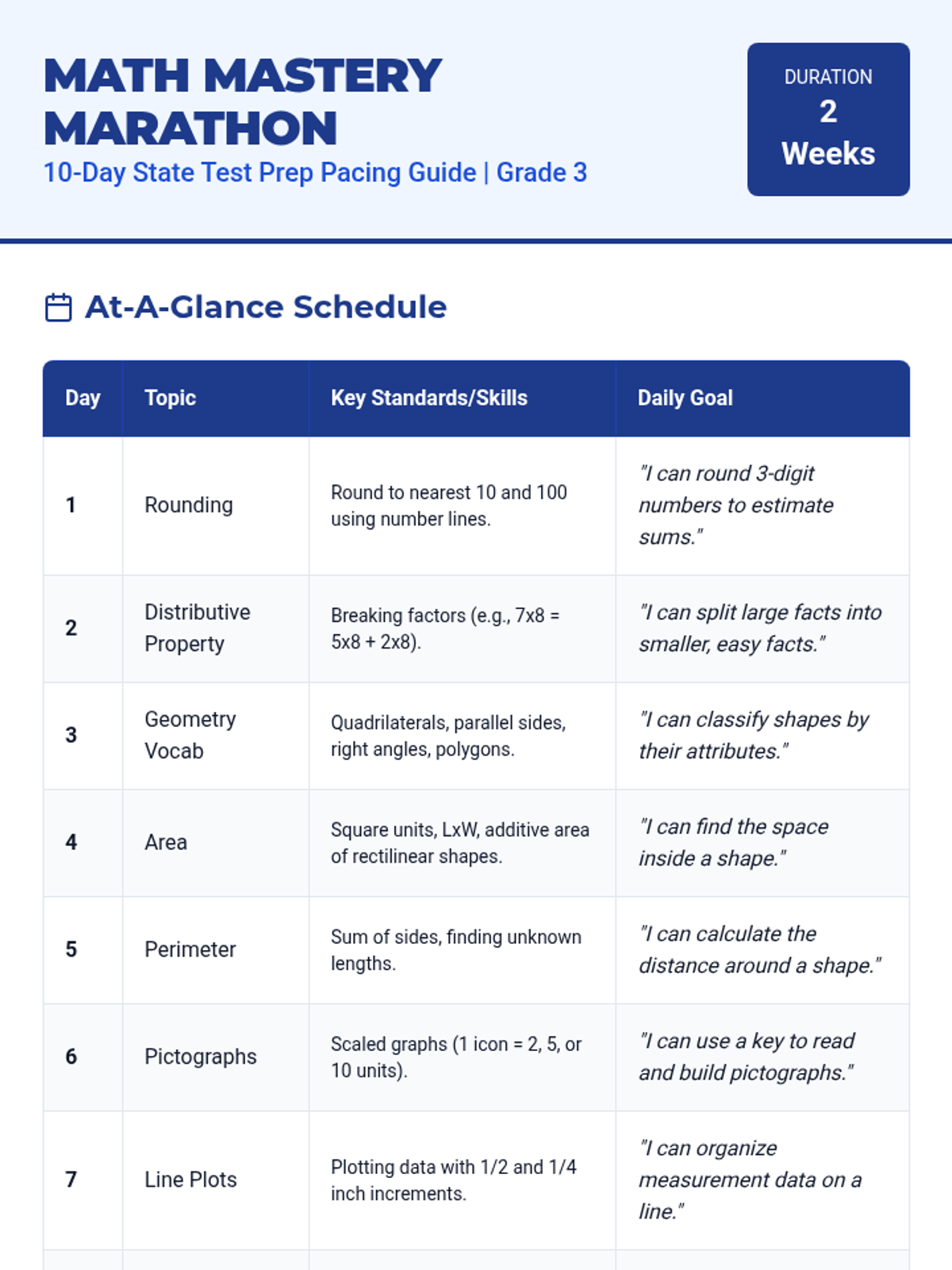 A 10-day intensive math review program for 3rd grade state testing, covering rounding, properties, geometry, data, and measurement.
