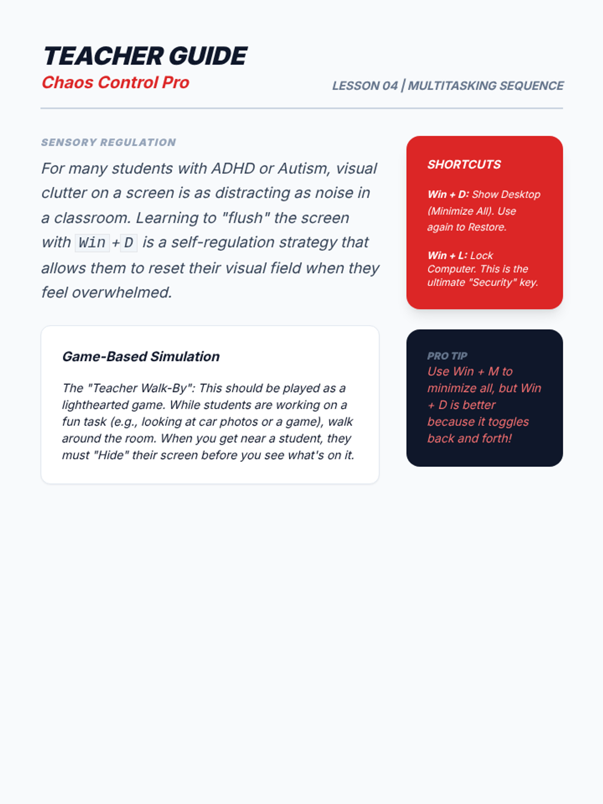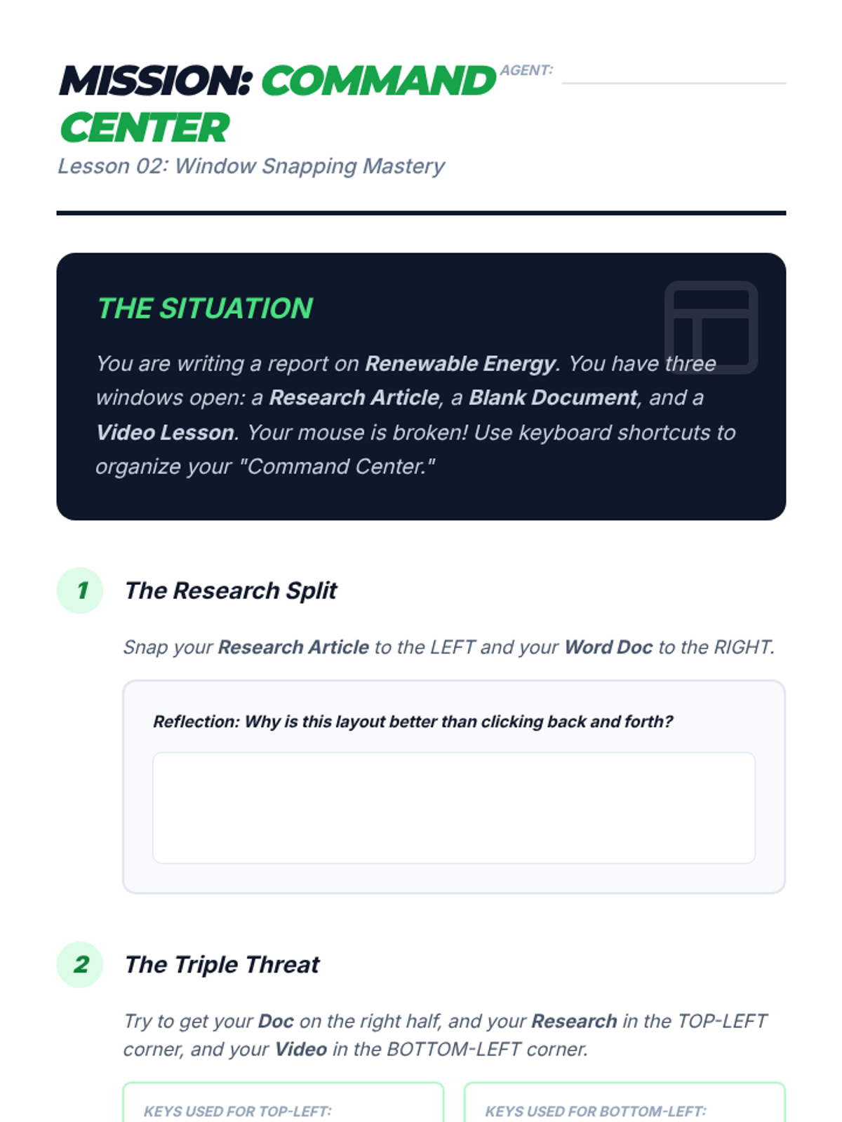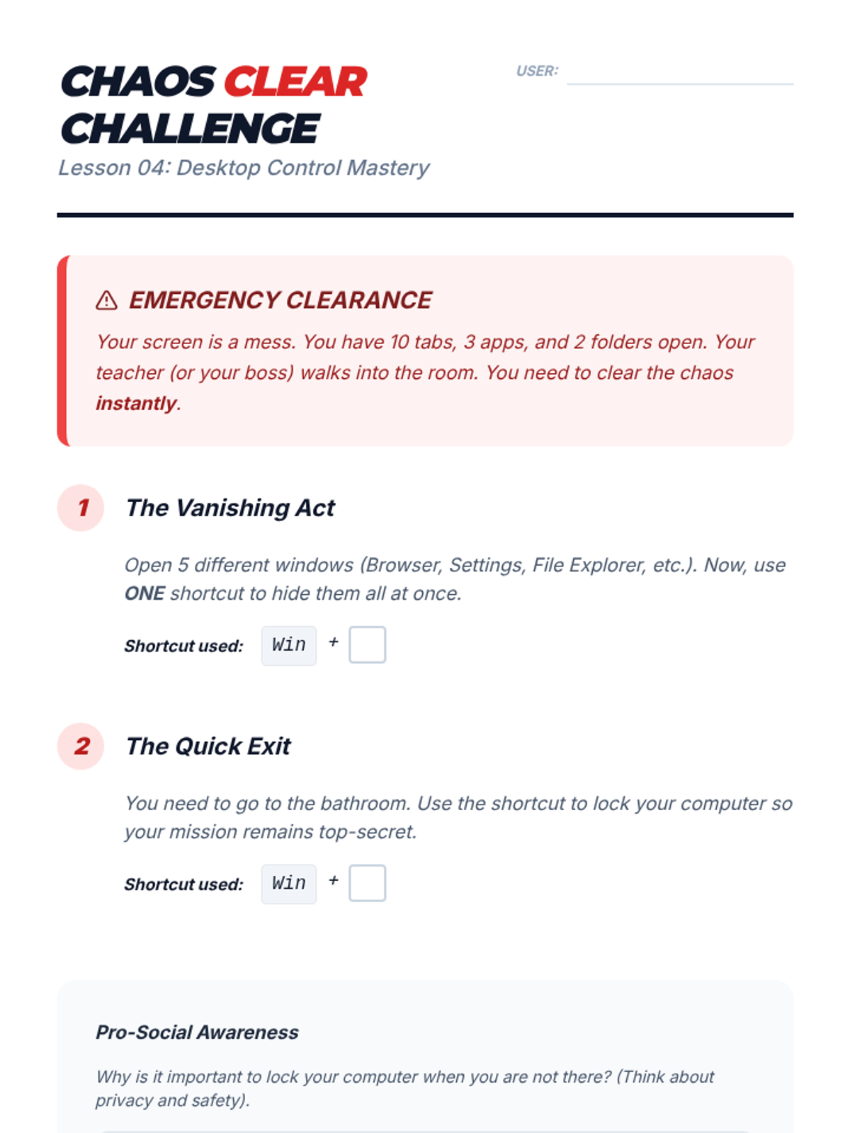 A high-energy, game-based sequence for 10th-grade students to master keyboard shortcuts for window management and multitasking. Students transition from basic app switching to managing complex virtual workspaces, culminating in a competitive 'Olympics' event.
