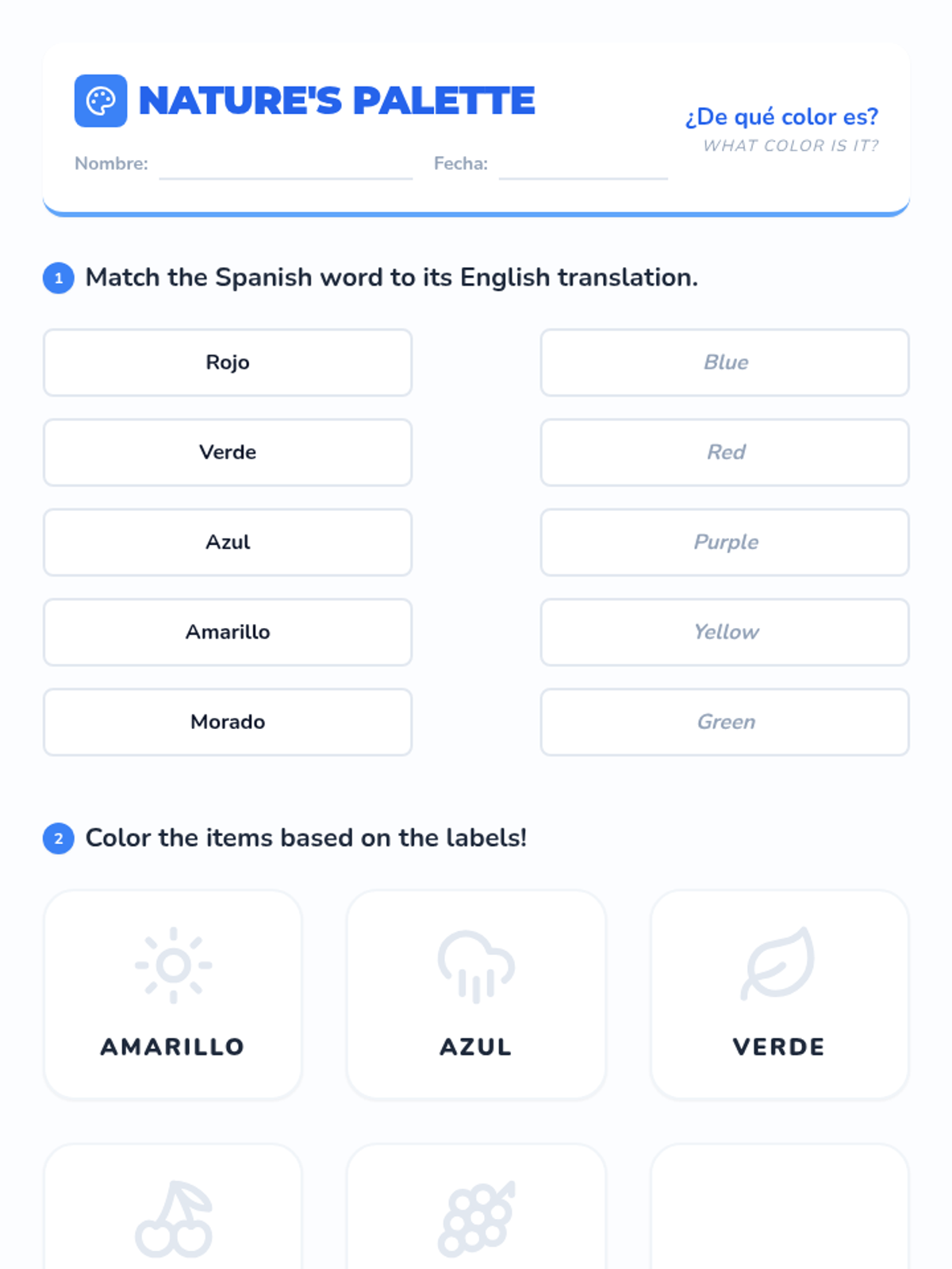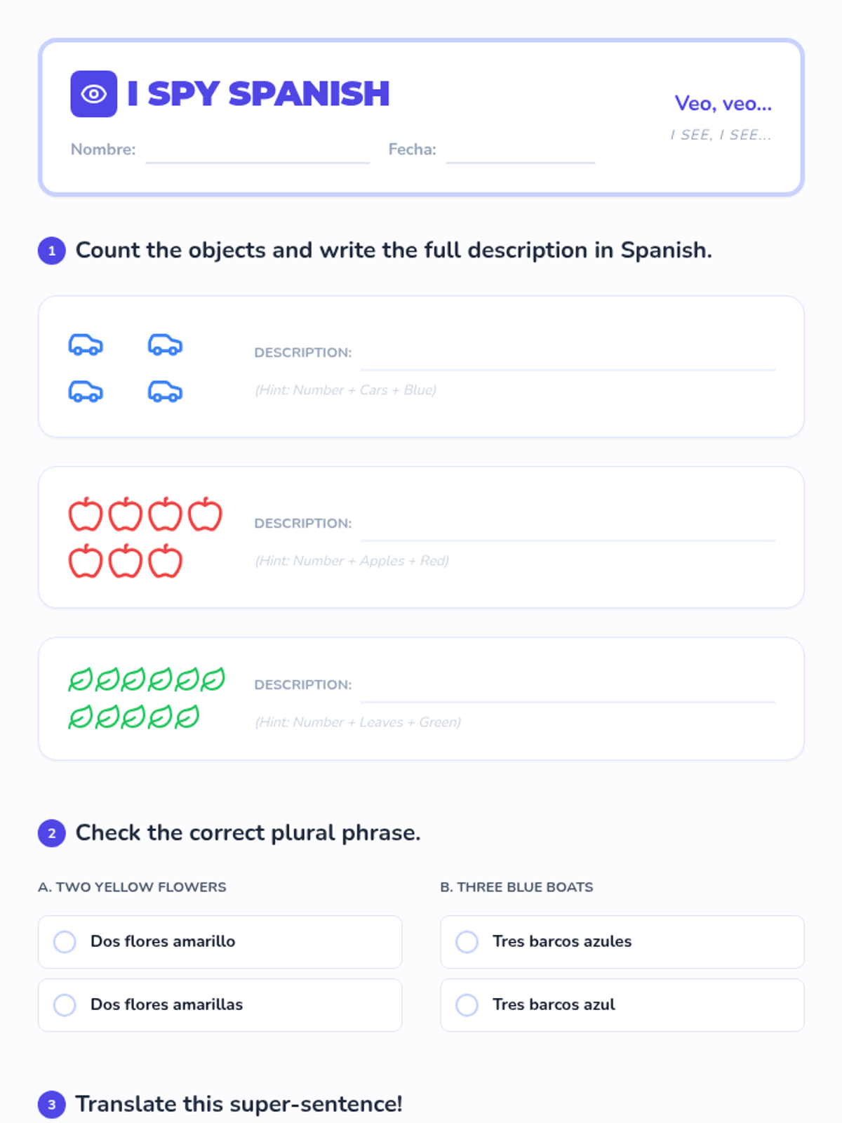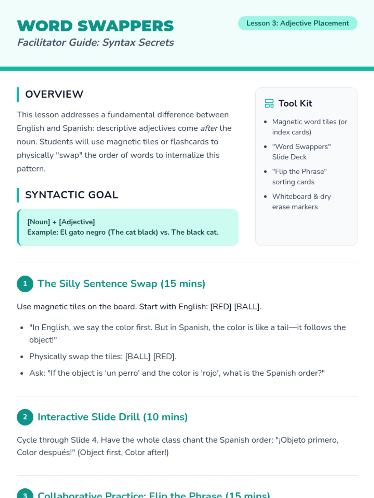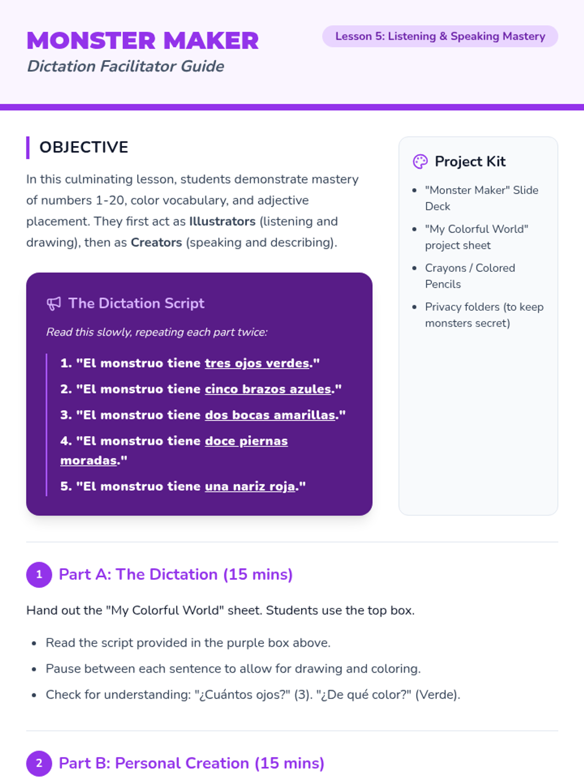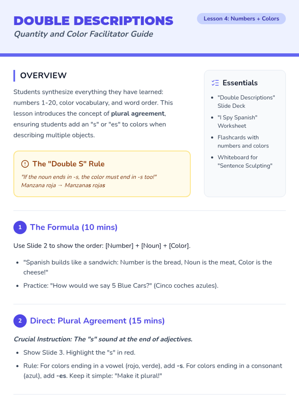 This 3rd-grade Spanish sequence introduces students to descriptive language by mastering numbers 1-20 and colors. Students learn the unique Spanish syntax of placing adjectives after nouns and practice combining quantity and color to describe the world around them, culminating in a creative dictation and drawing project.