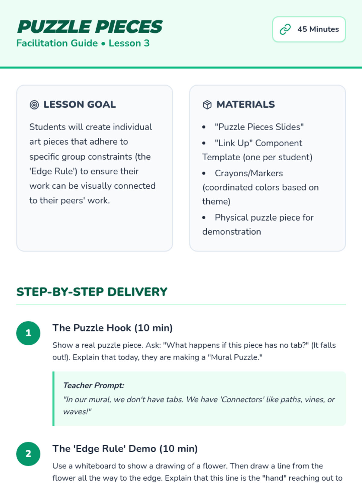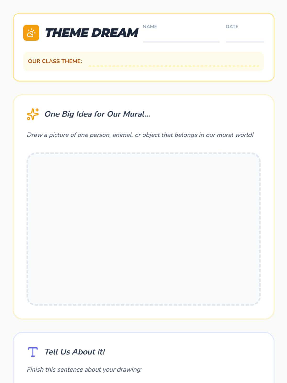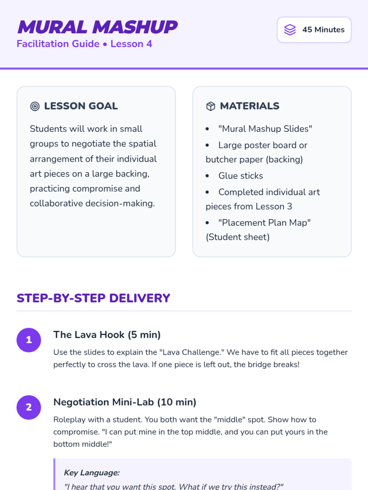 Students learn the art of collaboration by designing and assembling a large-scale class mural, focusing on sharing space, brainstorming themes, creating connectable art, and negotiating layout.