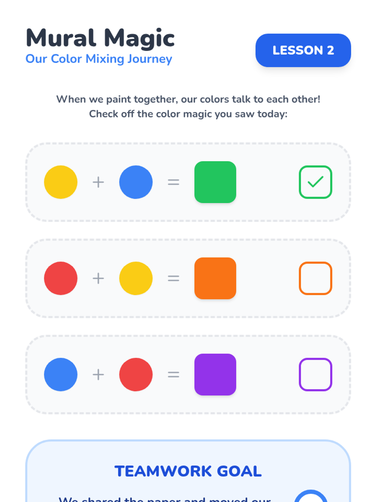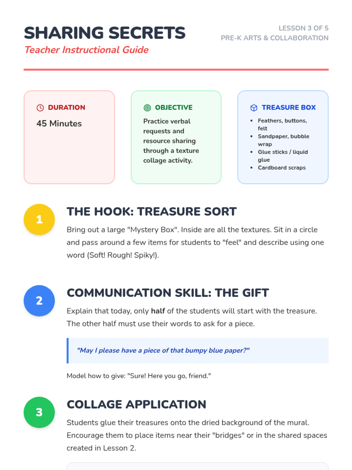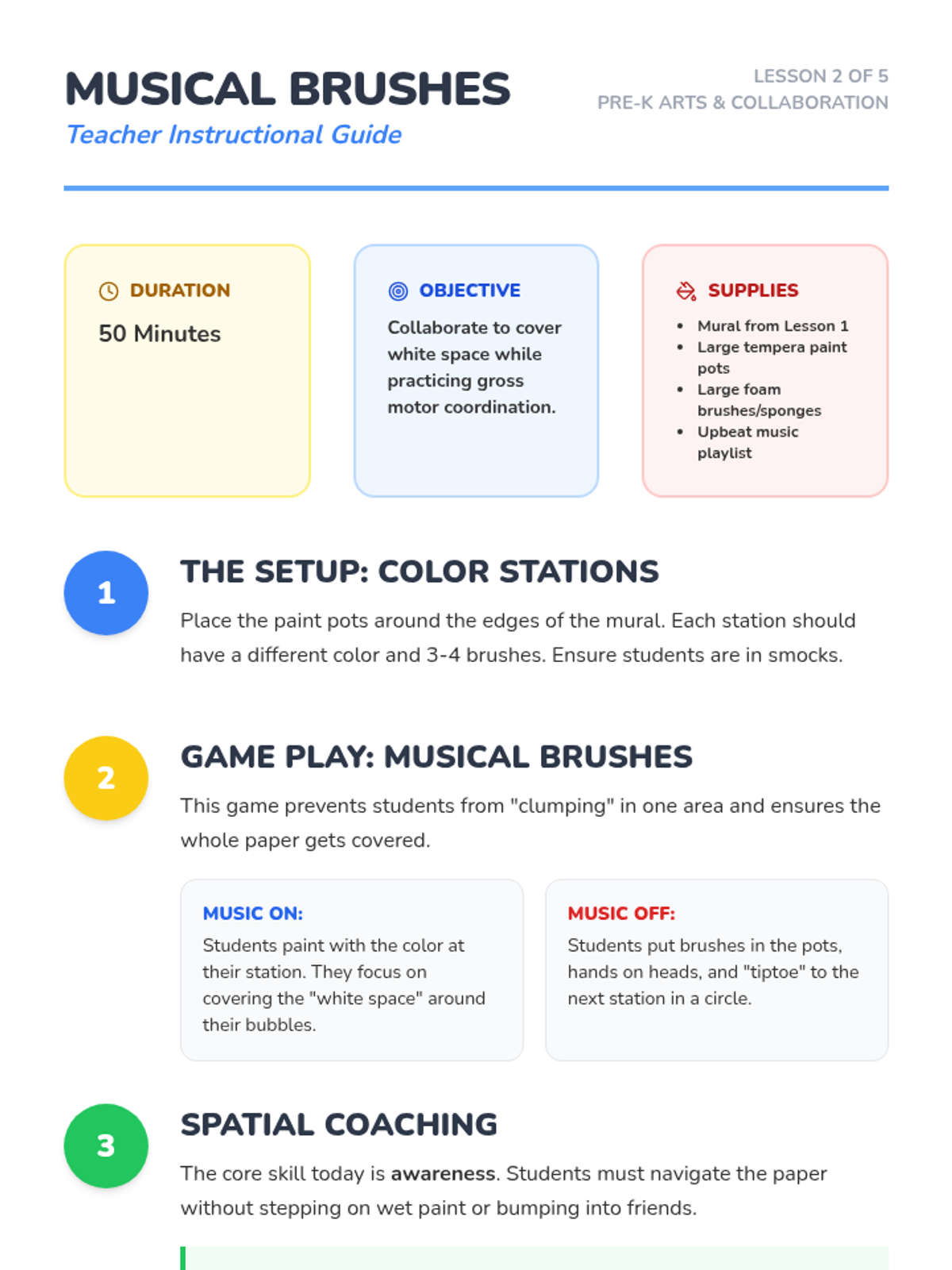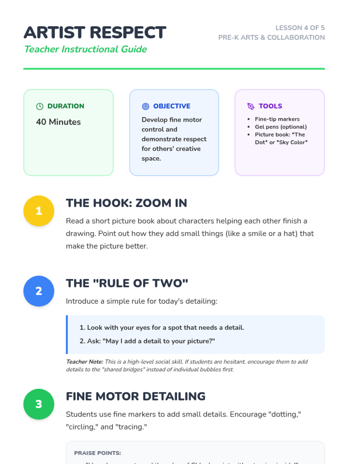 This Pre-K art sequence guides students through the cooperative process of creating a giant classroom mural. Students progress from individual 'drawing bubbles' to shared painting and collage, learning to communicate, share resources, and respect the artistic contributions of their peers.