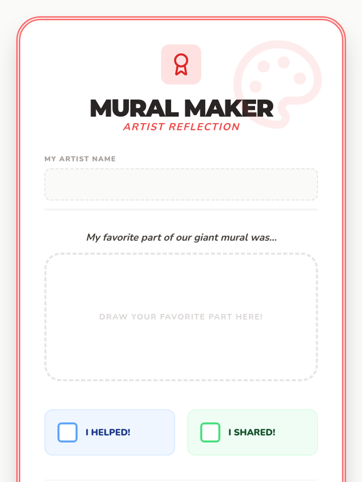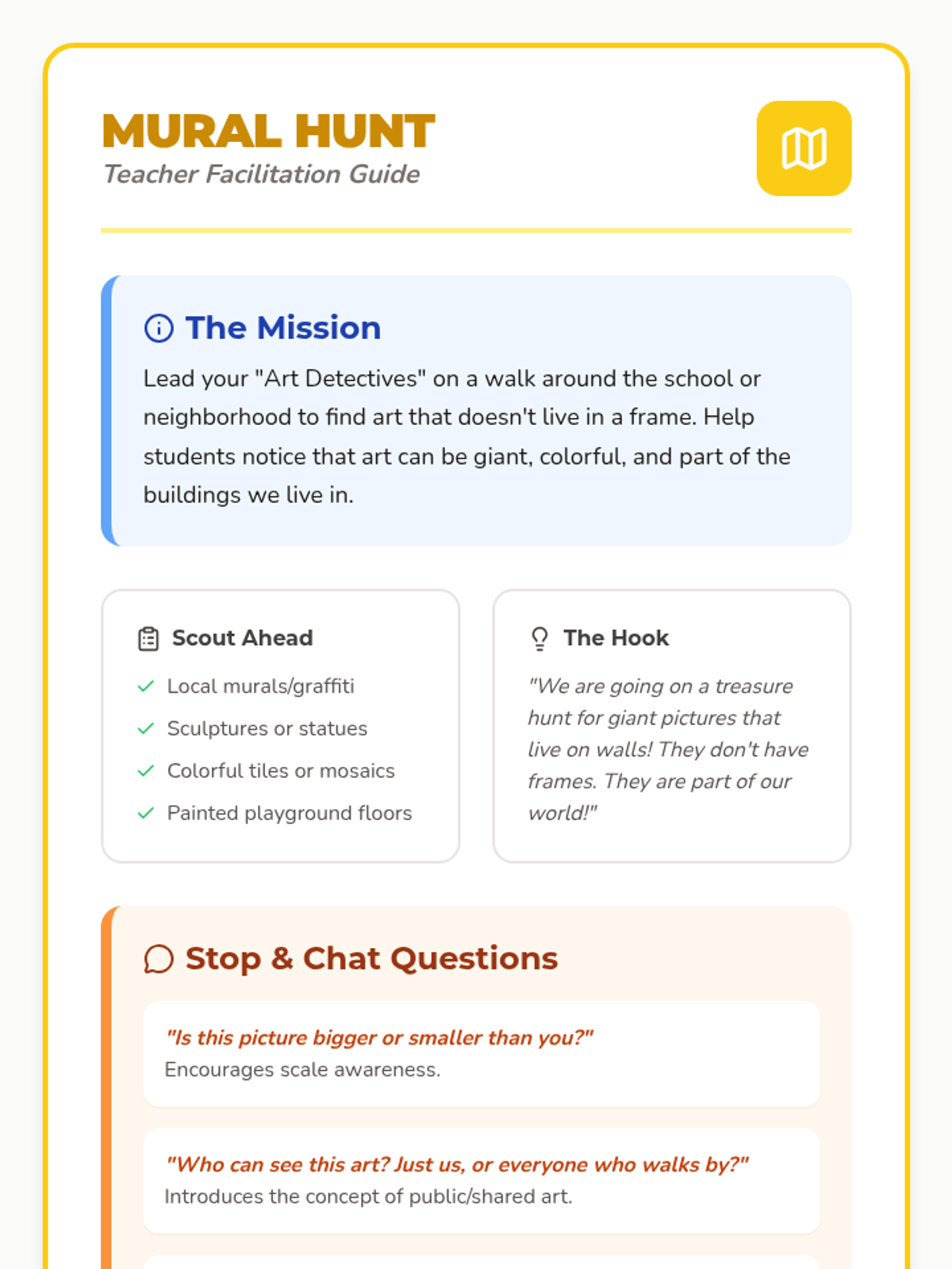 A hands-on introduction to public art and community collaboration for Pre-K students. Children explore large-scale art, vote on a shared theme, and work together to create and present a giant classroom mural.