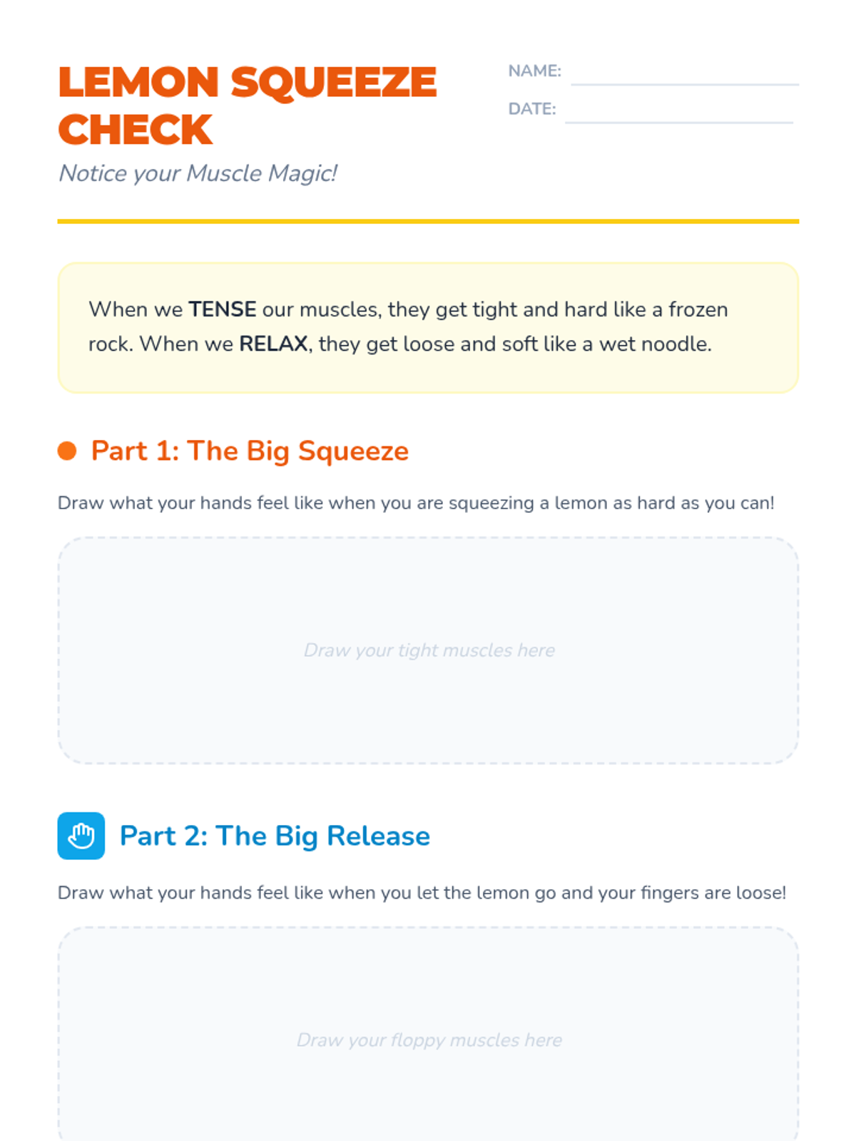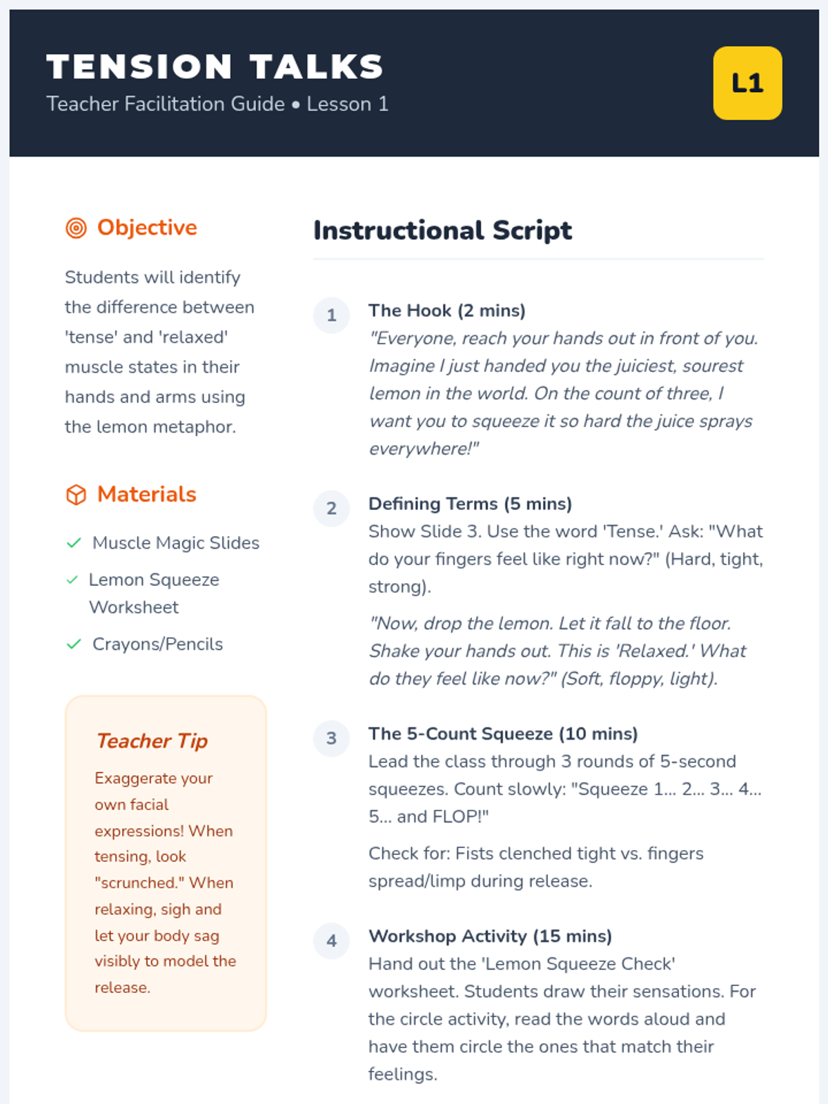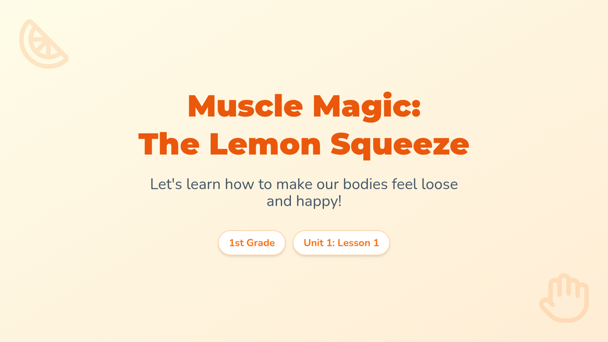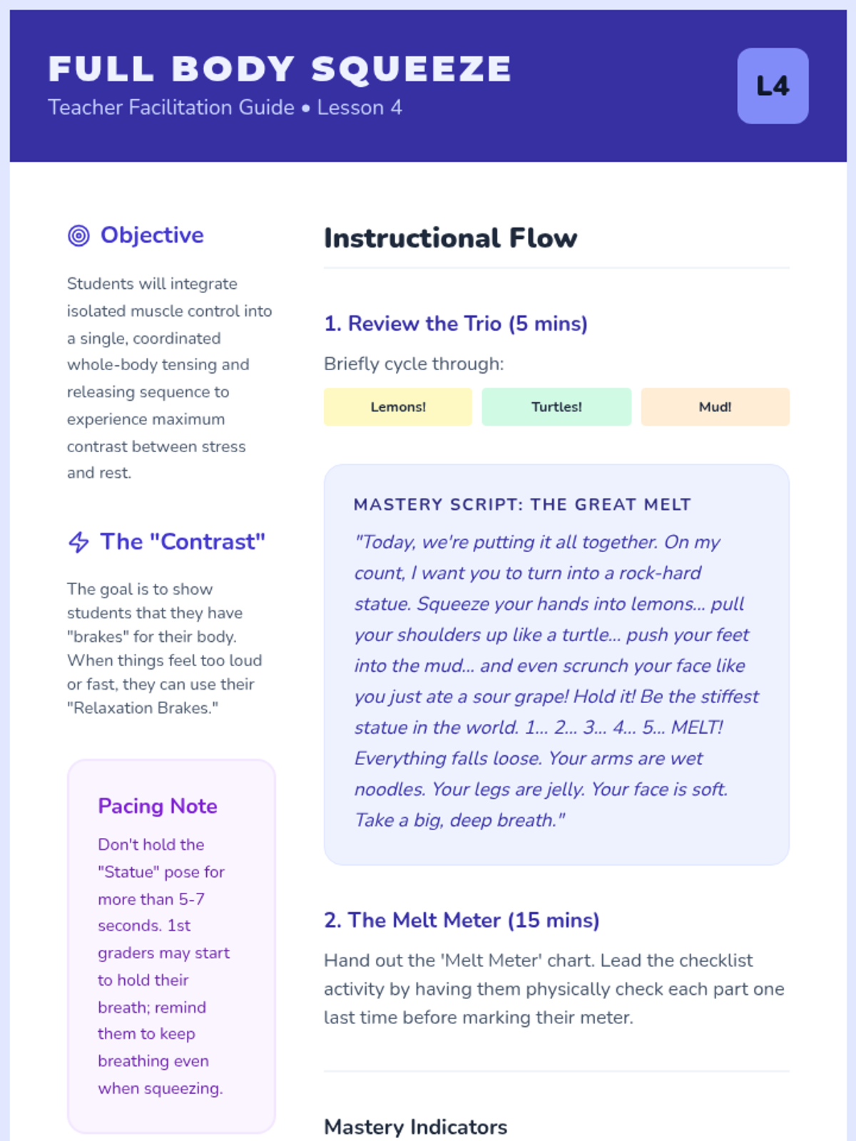This sequence introduces 1st Grade students to Progressive Muscle Relaxation (PMR) through engaging metaphors like squeezing lemons, hiding in turtle shells, and stomping in mud. Students move from isolating specific muscle groups to performing a full-body scan, developing self-awareness and self-regulation skills.