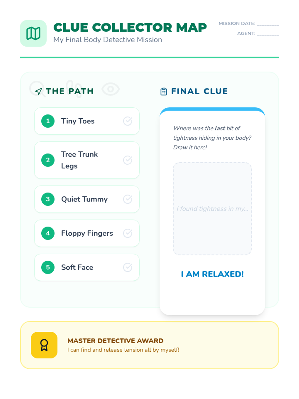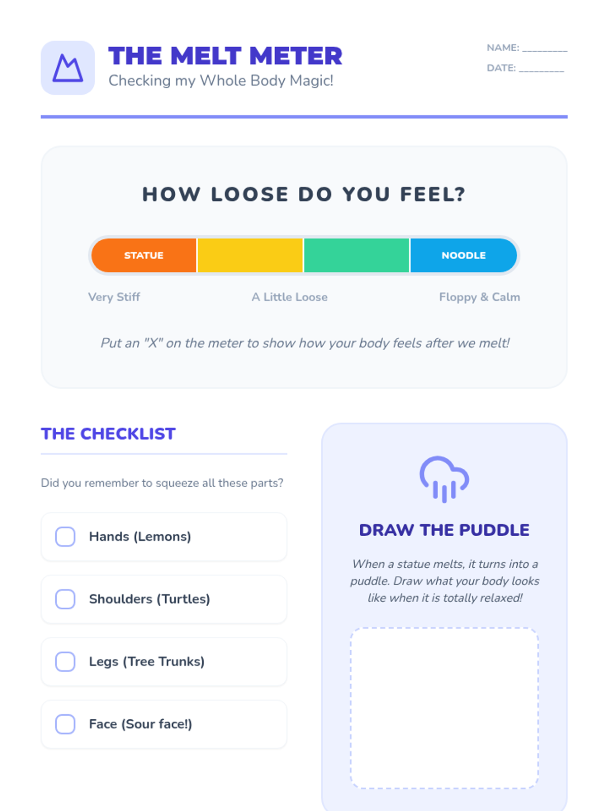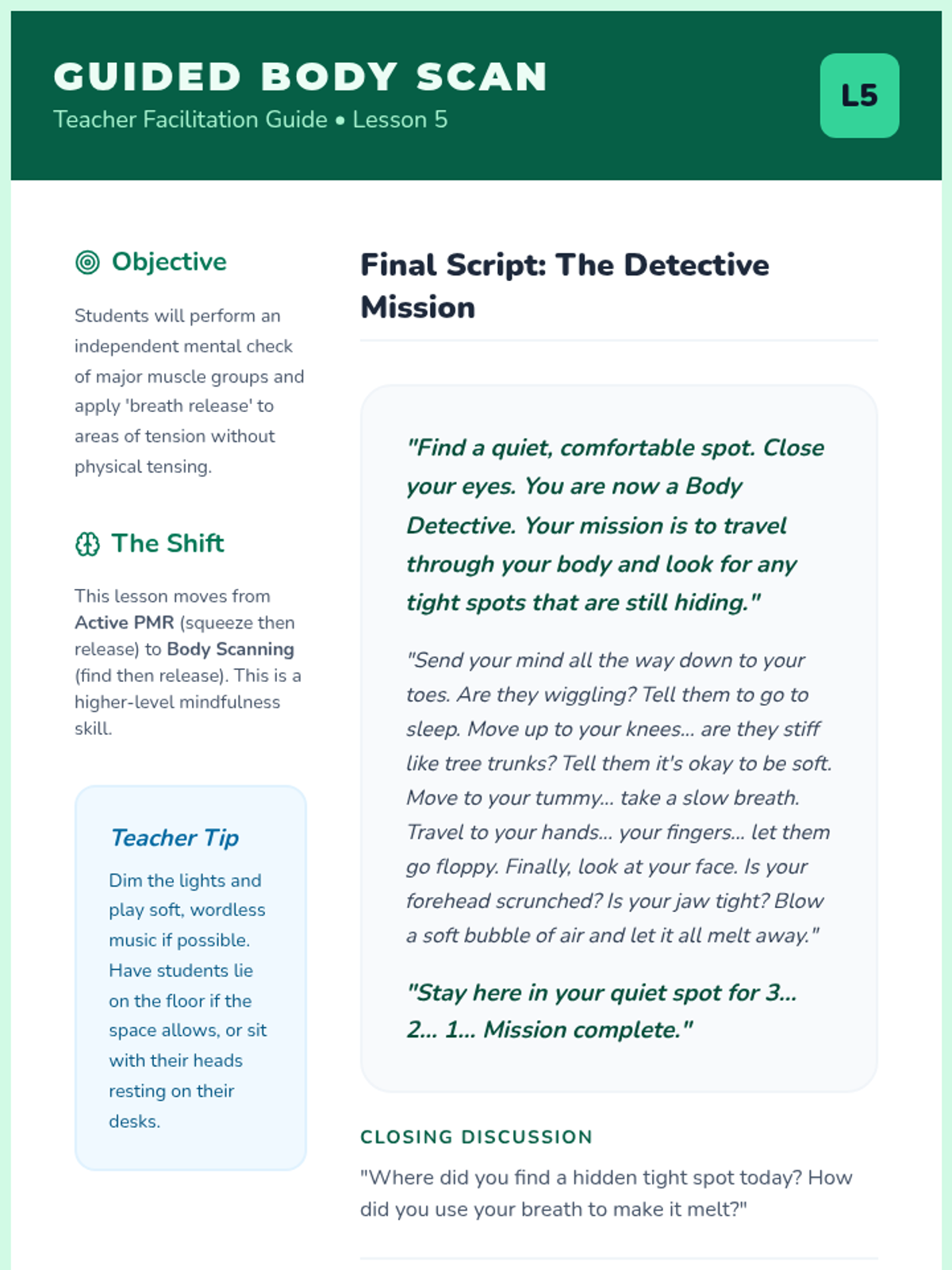 This sequence introduces 1st Grade students to Progressive Muscle Relaxation (PMR) through engaging metaphors like squeezing lemons, hiding in turtle shells, and stomping in mud. Students move from isolating specific muscle groups to performing a full-body scan, developing self-awareness and self-regulation skills.