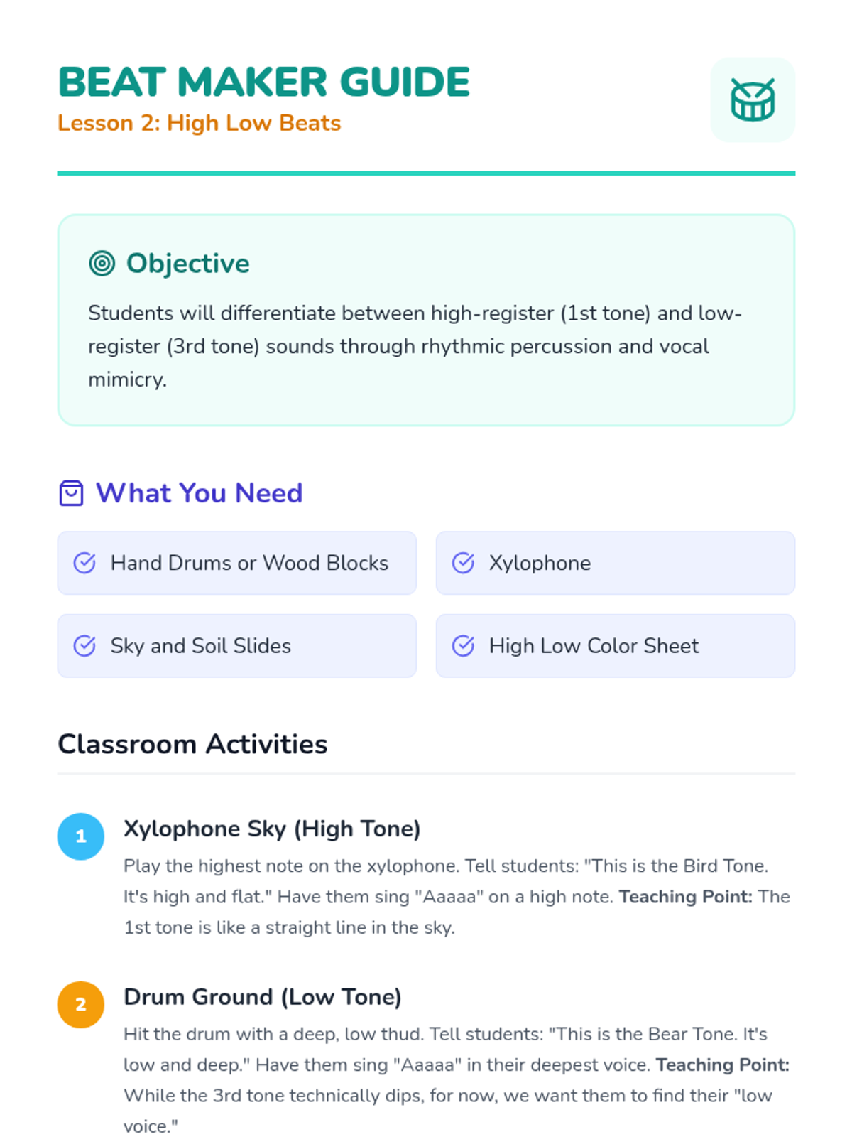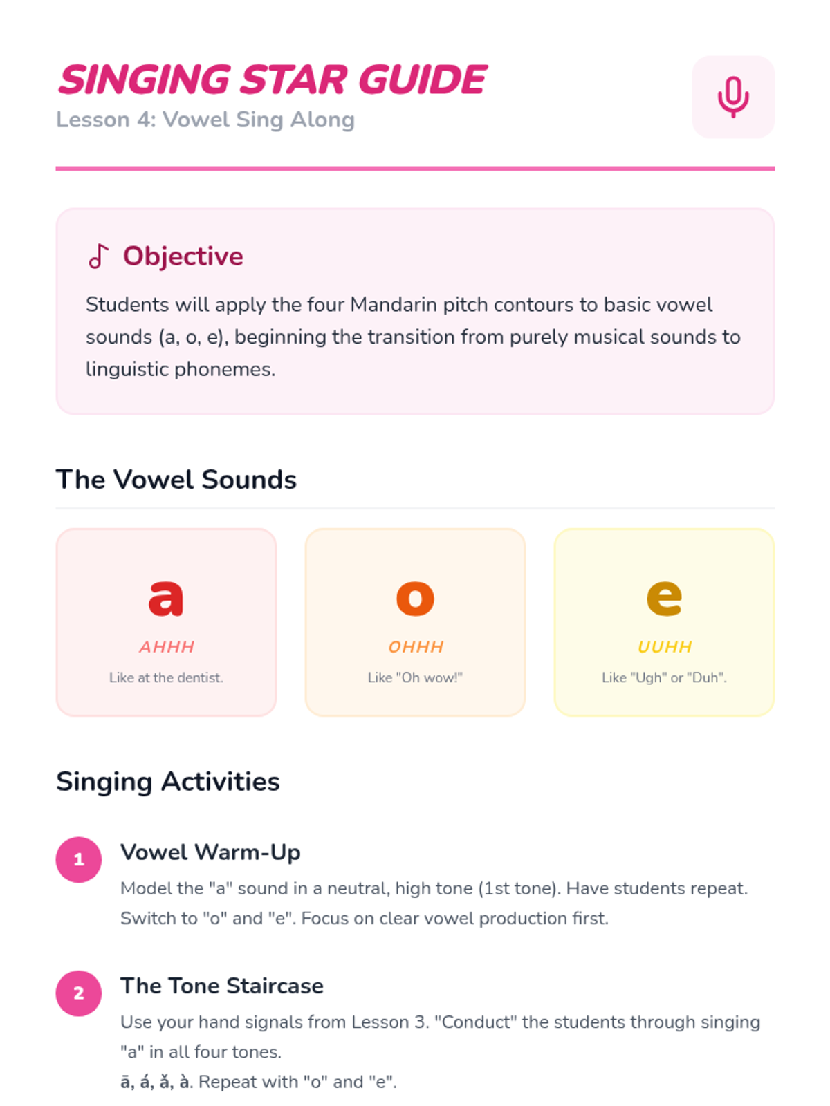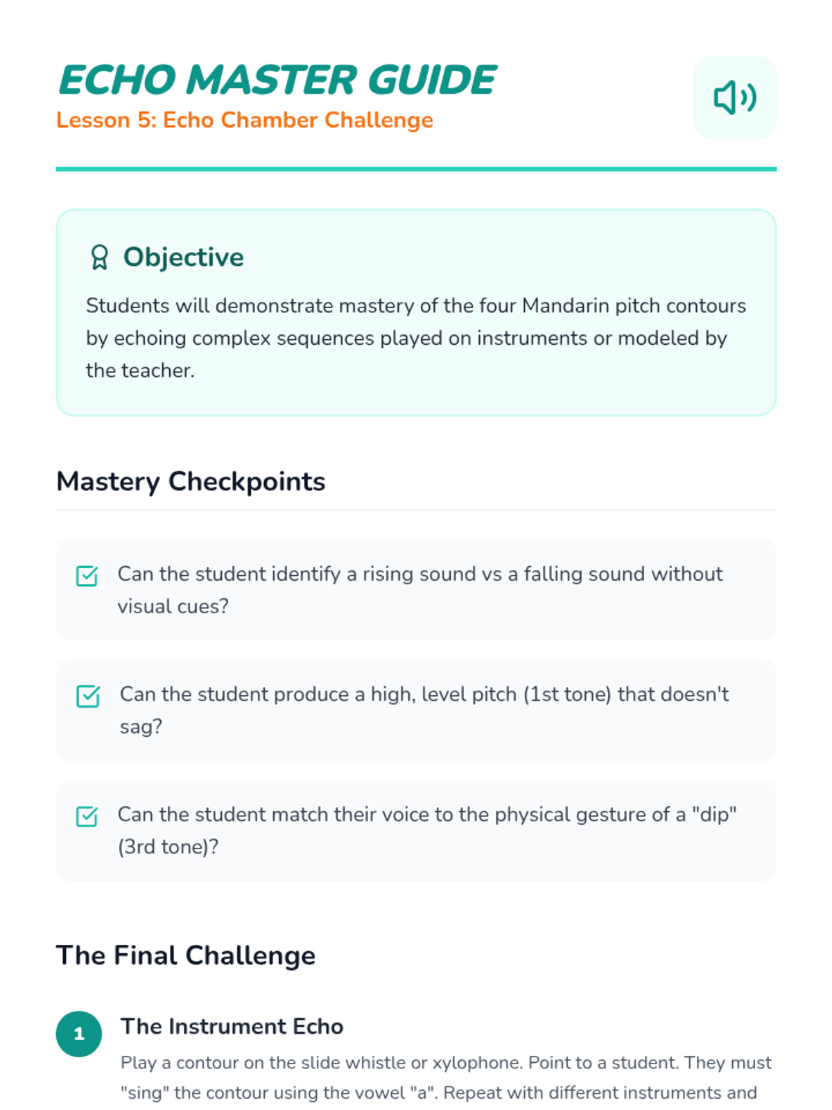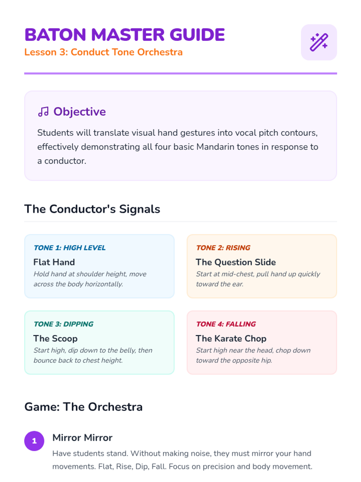 A foundational sequence for Pre-K learners to explore the four tones of Mandarin Chinese through auditory play, physical movement, and vocal exploration. Students learn to associate pitch changes with meaning using relatable sounds like questioning 'Huh?' or firm 'No!' gestures.